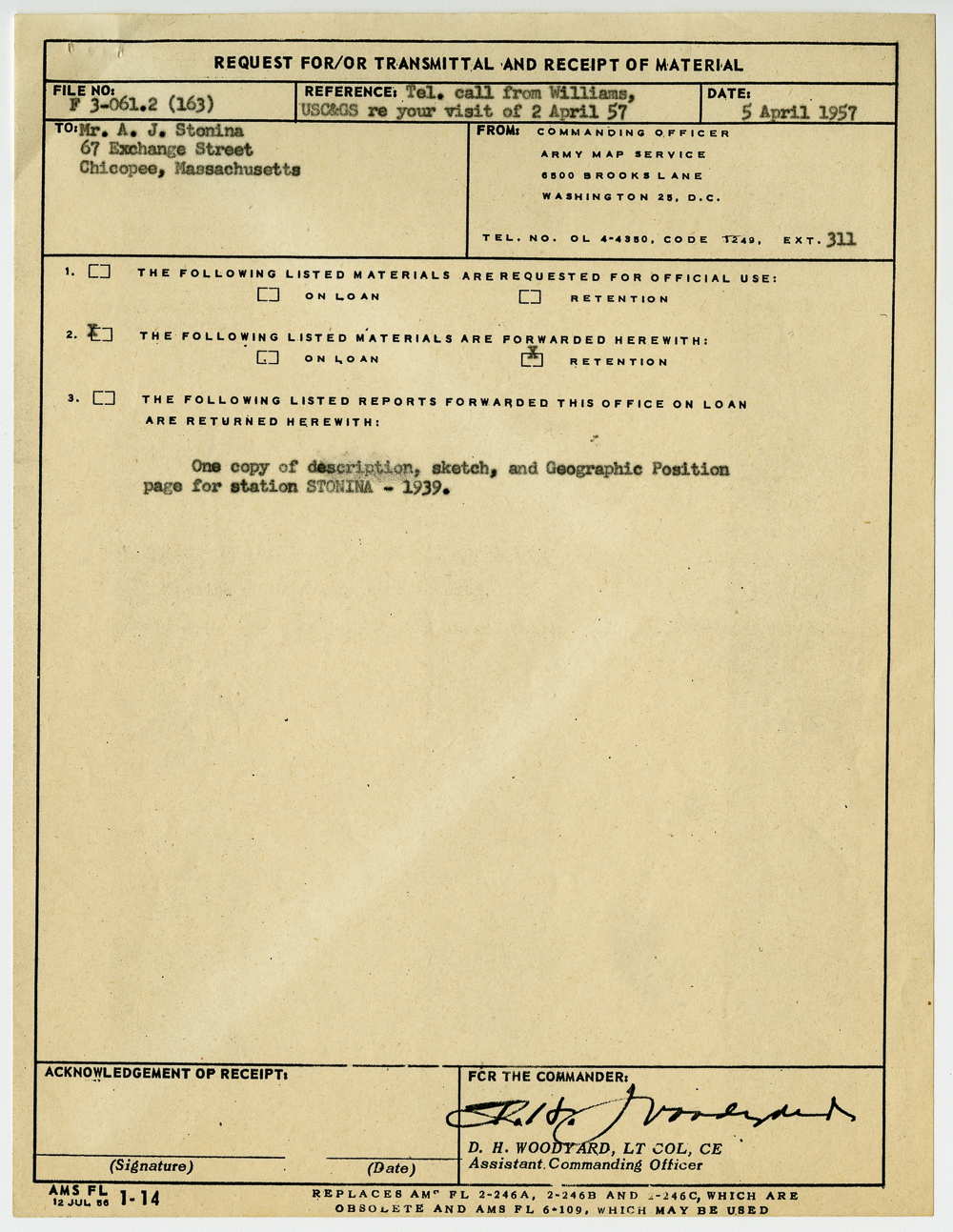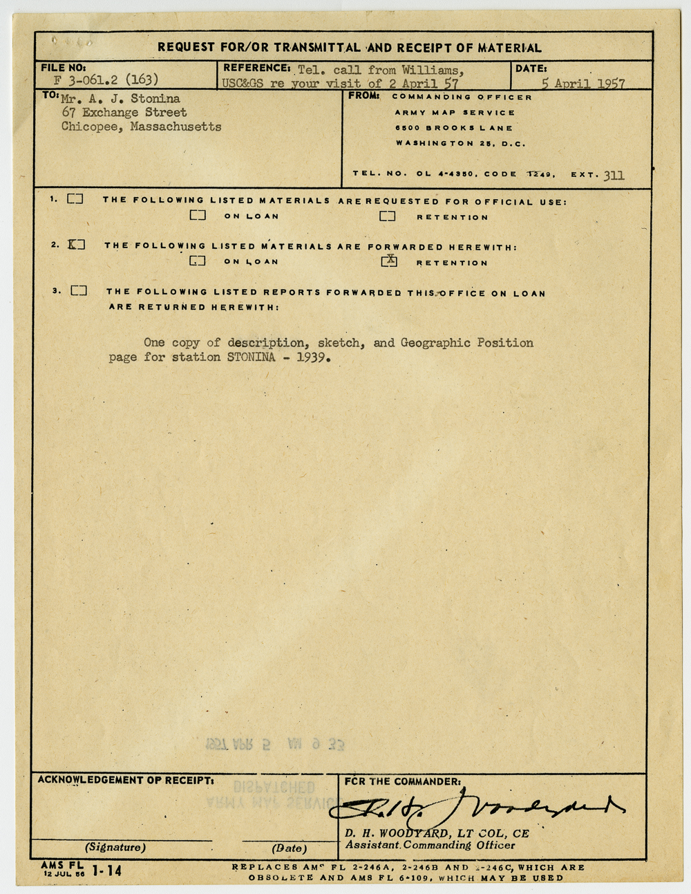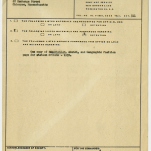 Miscellaneous materials related to the city of Chicopee and its former mayor, Anthony Stonina. Copy of a request for materials related to the “description, sketch, and Geographic Position” for station Stonina, named after the mayor.