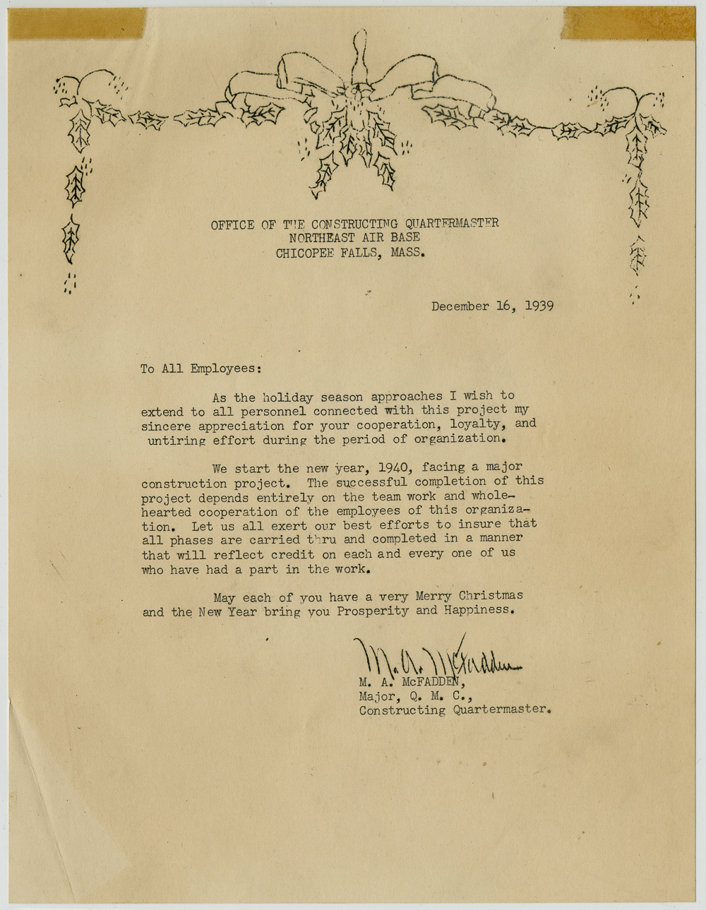 This series consists of materials that were originally found within series 11 and 12. The materials in this series were found to be of sufficiently different format and content to be worthy of preservation and inclusion in a separate series. Christmas correspondence among the personnel of the team constructing the air base including a Christmas card.