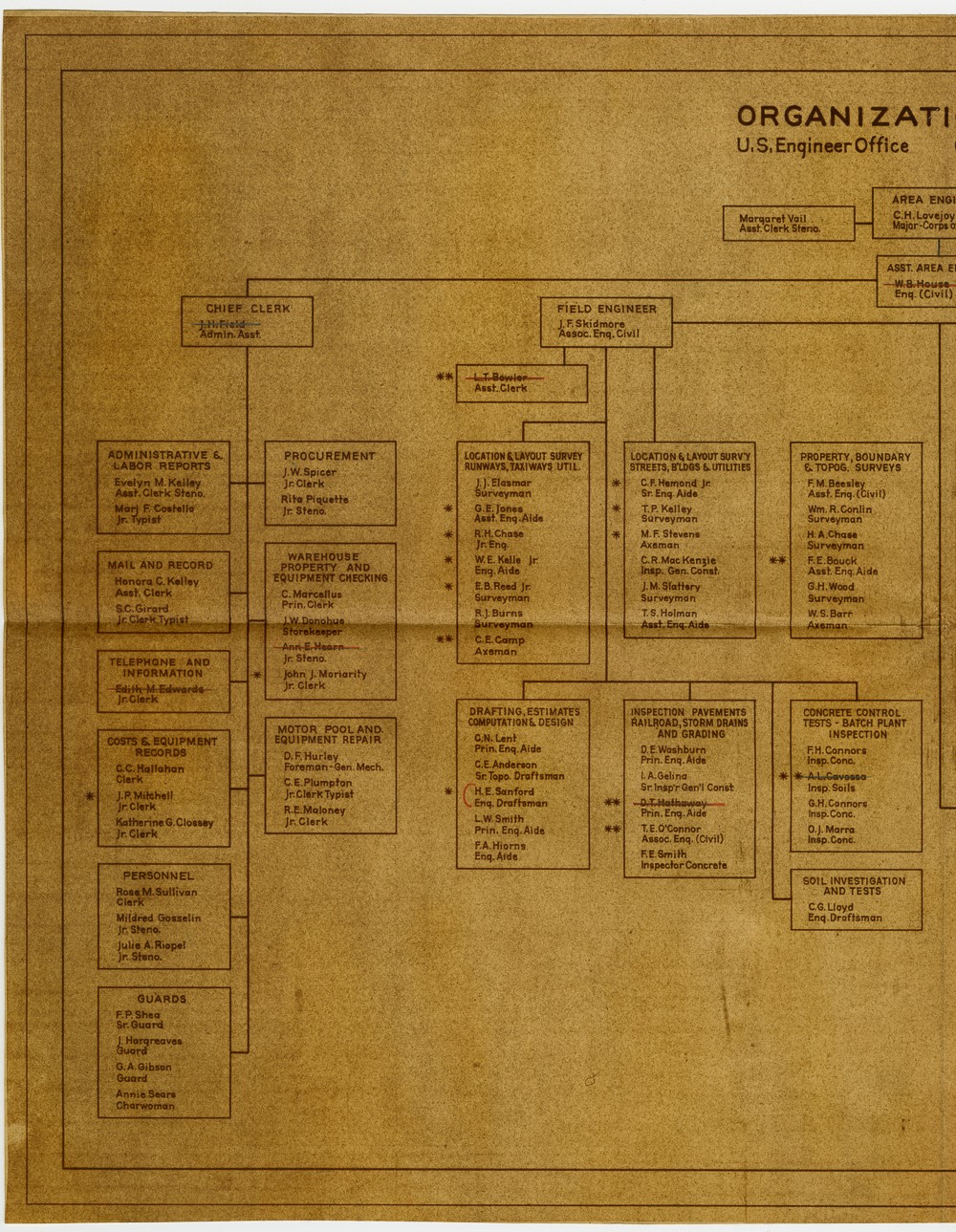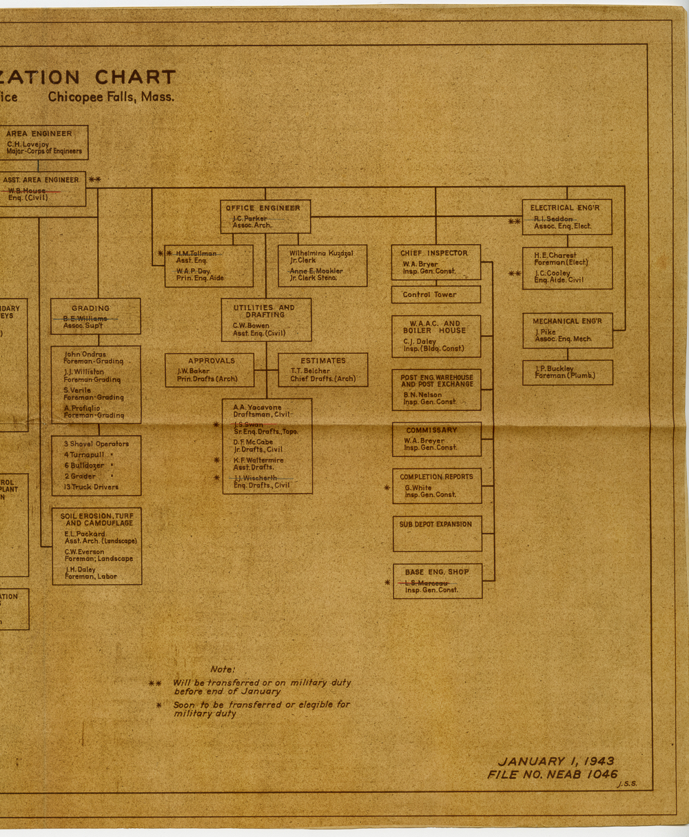 This series consists of materials that were originally found within series 11 and 12. The materials in this series were found to be of sufficiently different format and content to be worthy of preservation and inclusion in a separate series. Organizational chart for the office of the engineers stationed at Chicopee Falls in January of 1943.