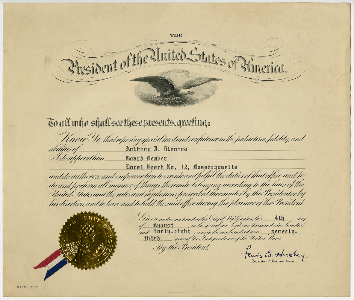 This series consists of materials that were originally found within series 11 and 12. The materials in this series were found to be of sufficiently different format and content to be worthy of preservation and inclusion in a separate series. Certificate from the United States Selective Service naming Anthony Stonina as a member of the Local Board No. 12, Massachusetts.