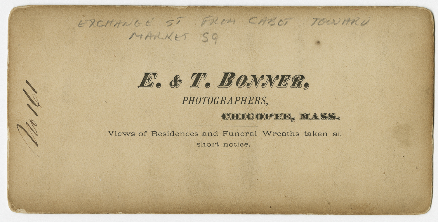 E & T Bonner, Photographers, “Exchange Street,” Chicopee Archives Online, accessed March 6, 2026, https://www.chicopeepubliclibrary.org/archives/items/show/8553.