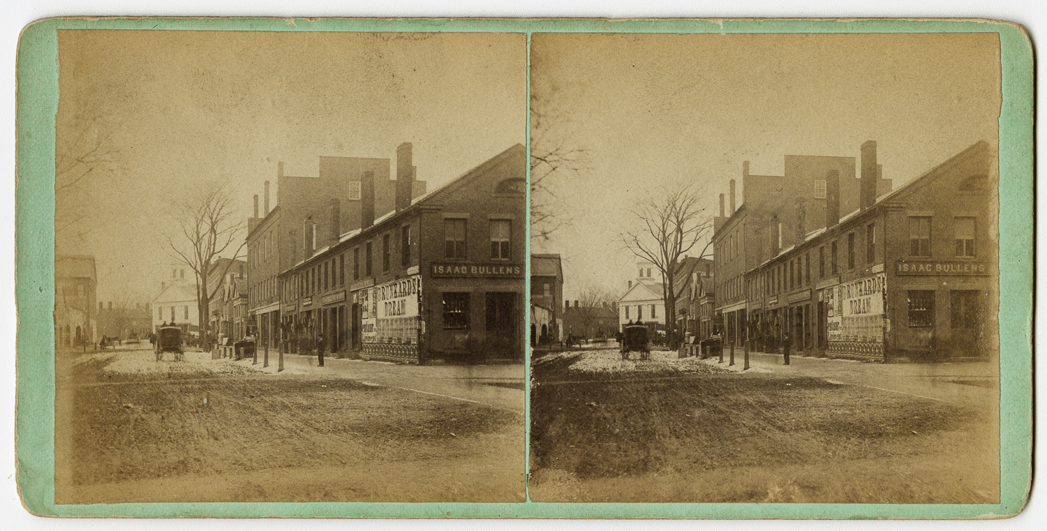 Black and white Stereograph on green mounting board showing a view of Exchange Street from Cabot Street looking toward Market Street in Chicopee Center.