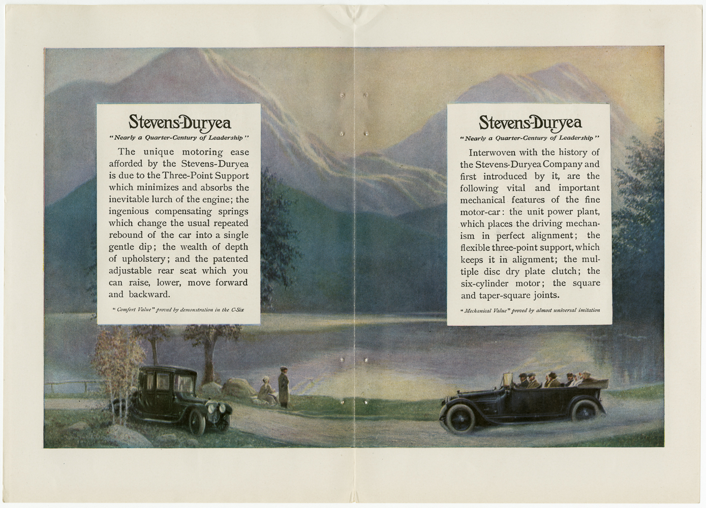 A two page Duryea Automobile Company print ad showing a idyllic view of a lake with mountains. Two different styles of Duryea motor-cars are on the road in the forground. One is parked and the two occupants are enjoying the view from the side of the road. The other is driving with the top down and three rows of seats filled with people are visible. Two text boxes describe all the newest features in the design and make of the motor-cars.
