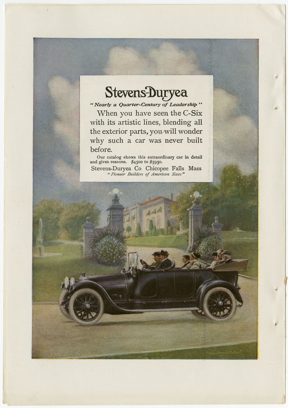 A Duryea Automobile Company print ad featuring the new C-6 luxury car with three rows of seats filled with passangers driving past a mansion set back from the road.