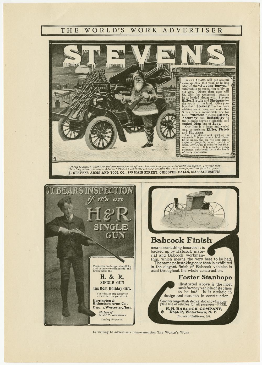 A half page Duryea Automobile Company print ad showing a depiction of Santa Clause getting into his Stevens-Duryea automobile. He has a Stevens rifle slung across his shoulder and the car is loaded with rifles for distribution to the "youth of the land."