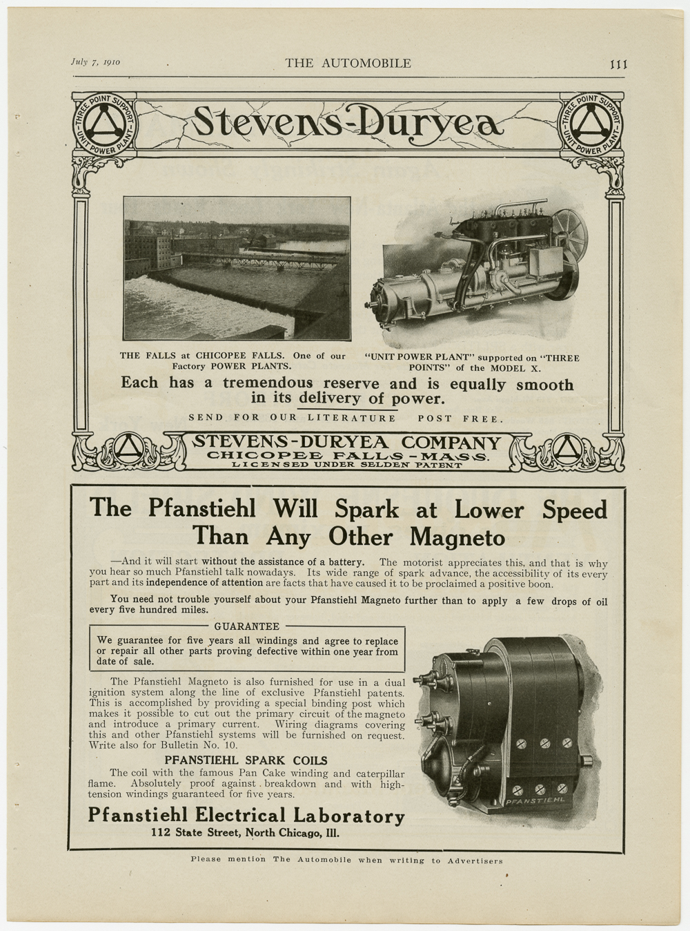 A 1/2 page ad comparing the ability of the Chicopee Falls Plant and the Three Point Unit Power Plant of the Model "X" automobile. Photographs of the plant in Chicopee Falls and the Model "X" engine are on each top side of the ad. Text reads: "Each has a tremendous reserve and is equeally smooth in its delivery of power."