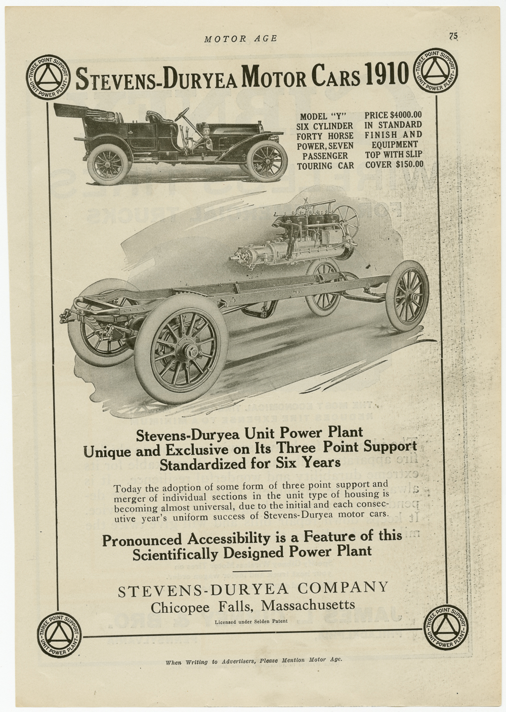 A full page ad with a detailed drawing of the frame and engine of the seven passanger Model "Y" Six Cylinder luxury automobile. A small photograph of the whole vehicle is above the frame image. Text is about the three point power system unique to the Stevens-Duryea automobile.