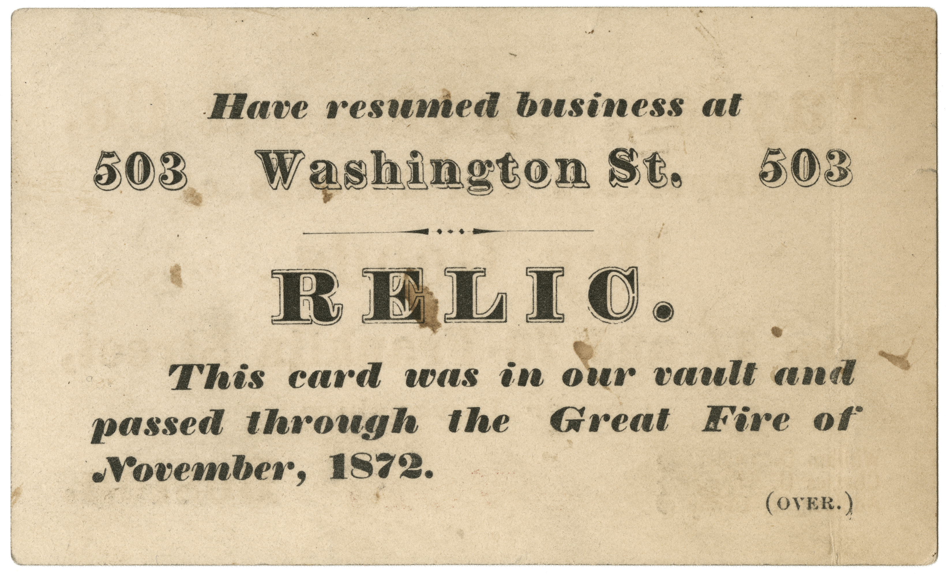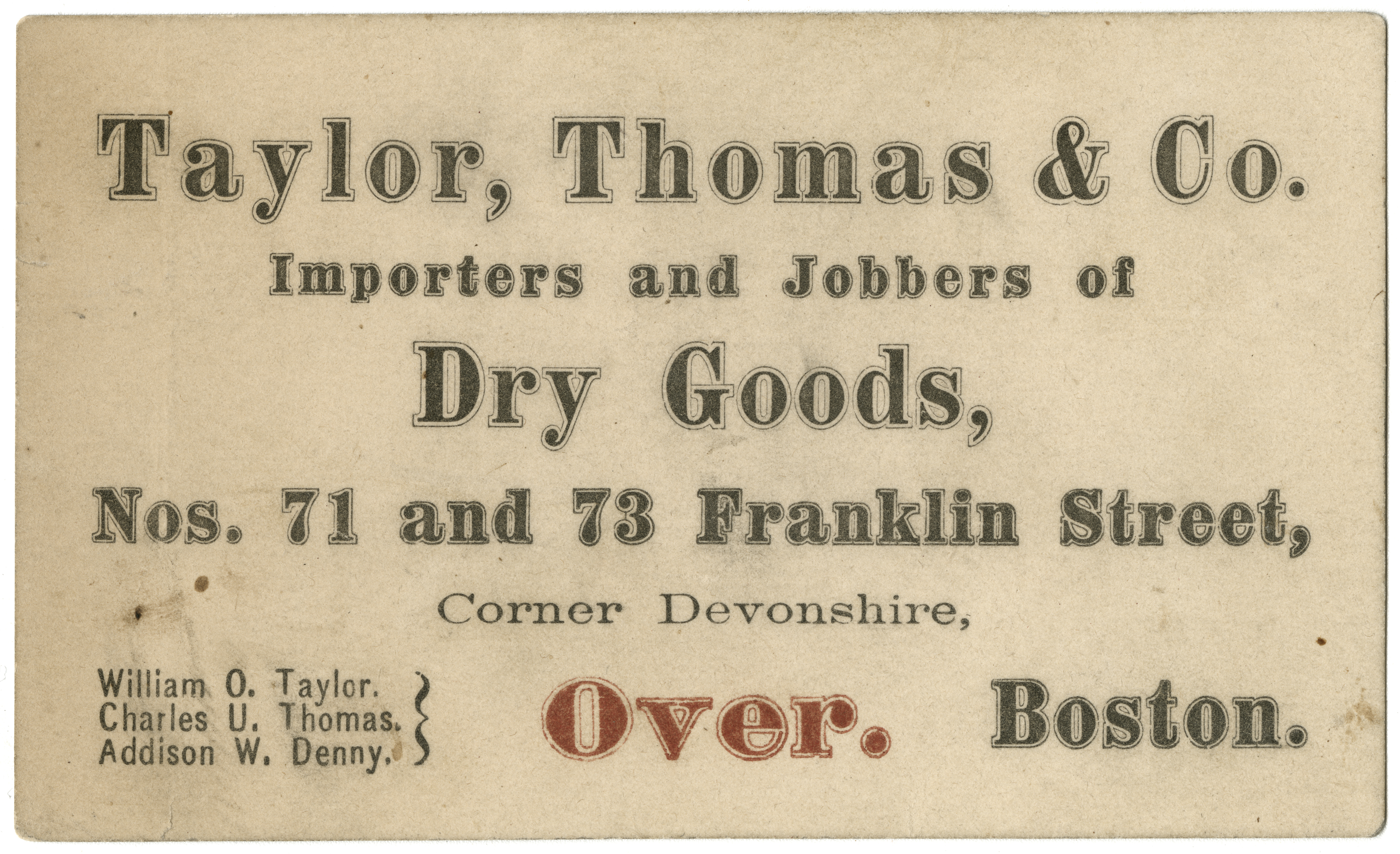Small carboard card describing the dry goods import business of Taylor, Thomas and Company.