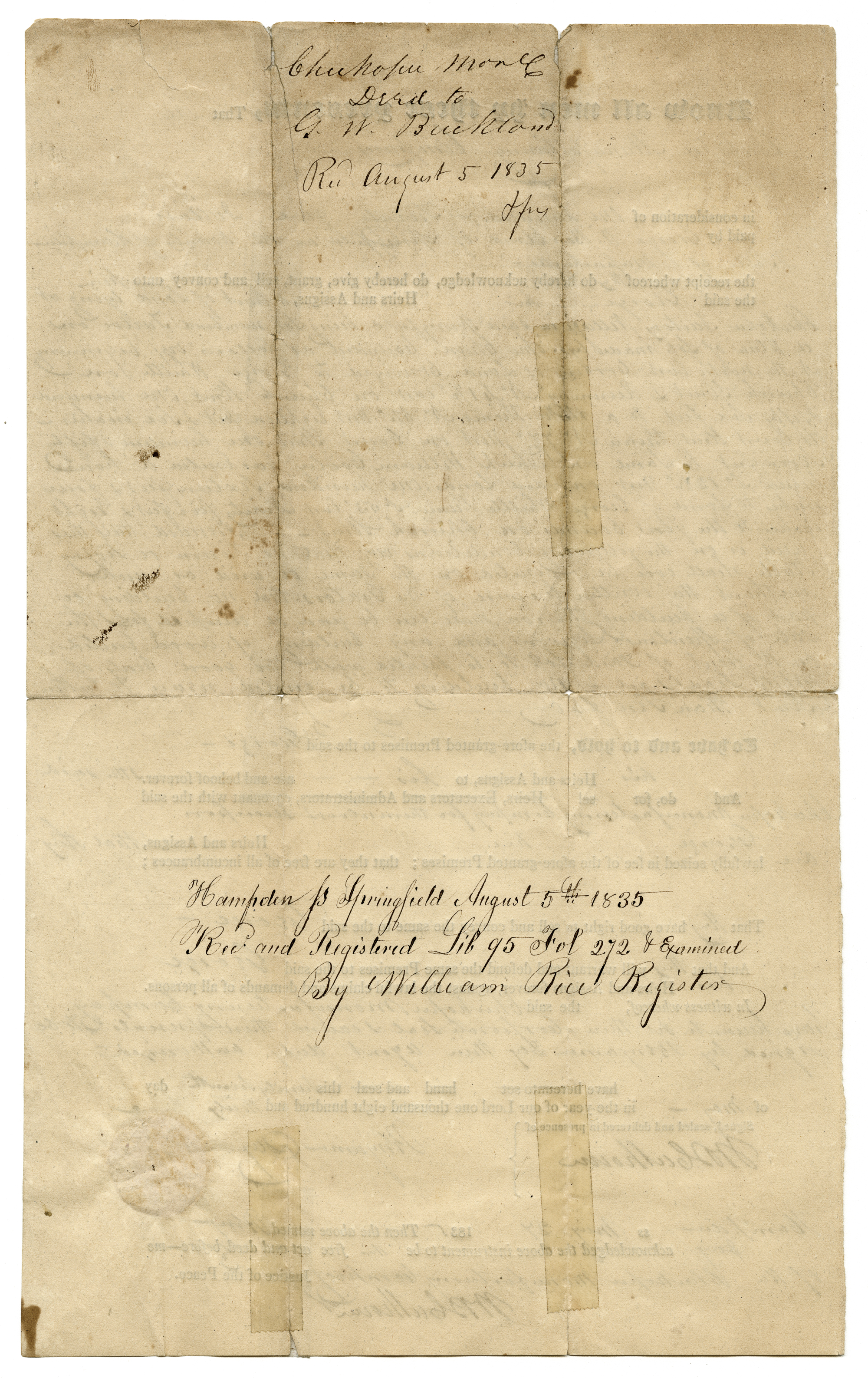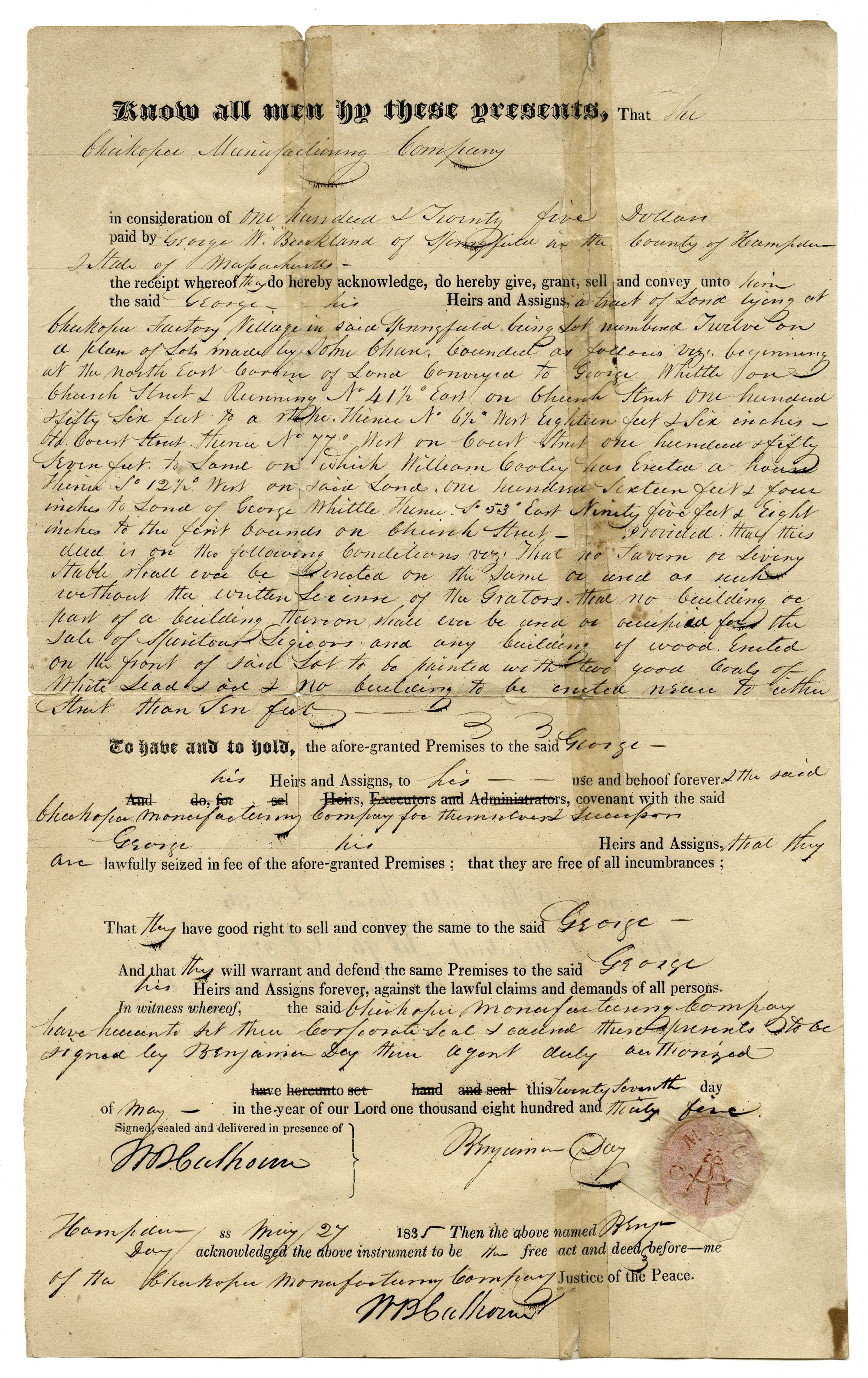 Warranty deed for a parcel of land on the northerly side of Court St. in Chicopee, Massachusetts.