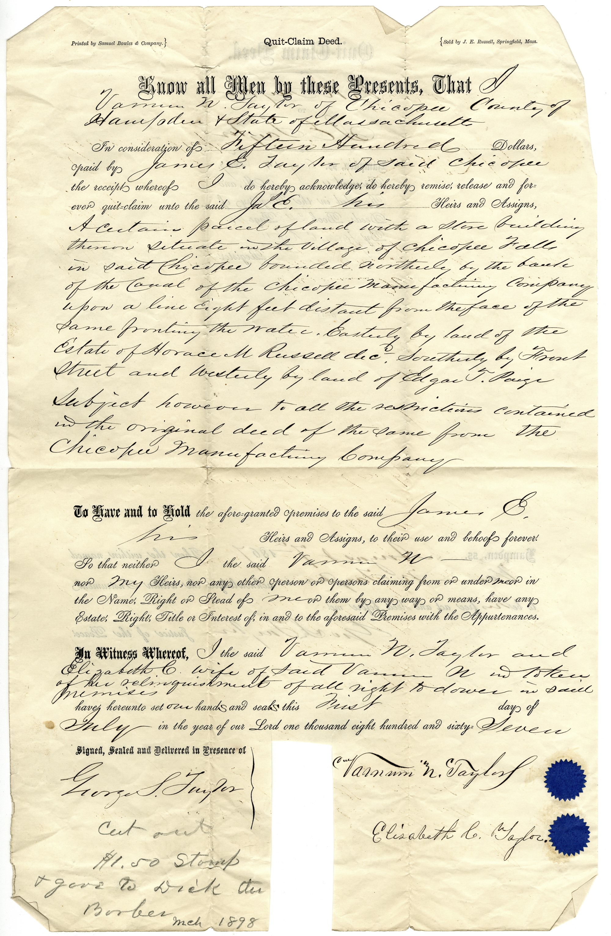“Quit-Claim Deed from V. N. Taylor to J. E. Taylor,” Chicopee Archives Online, accessed April 23, 2026, https://www.chicopeepubliclibrary.org/archives/items/show/8601.