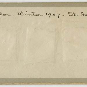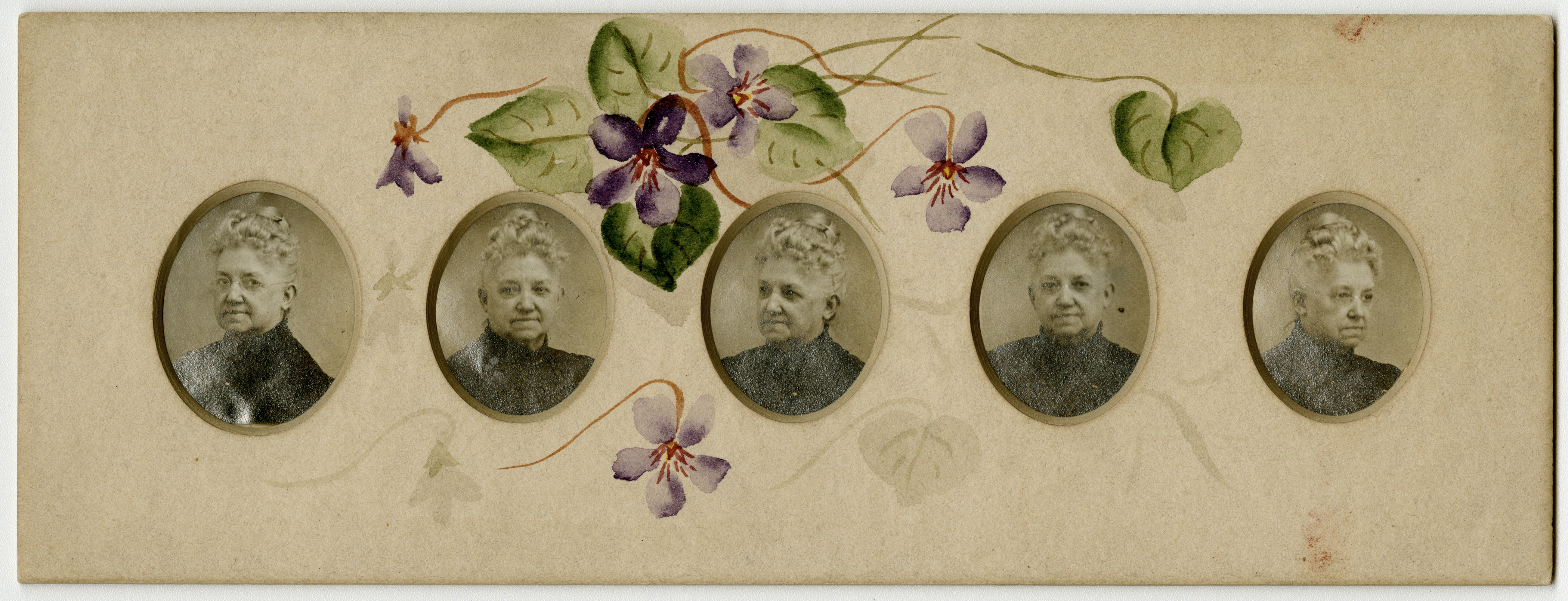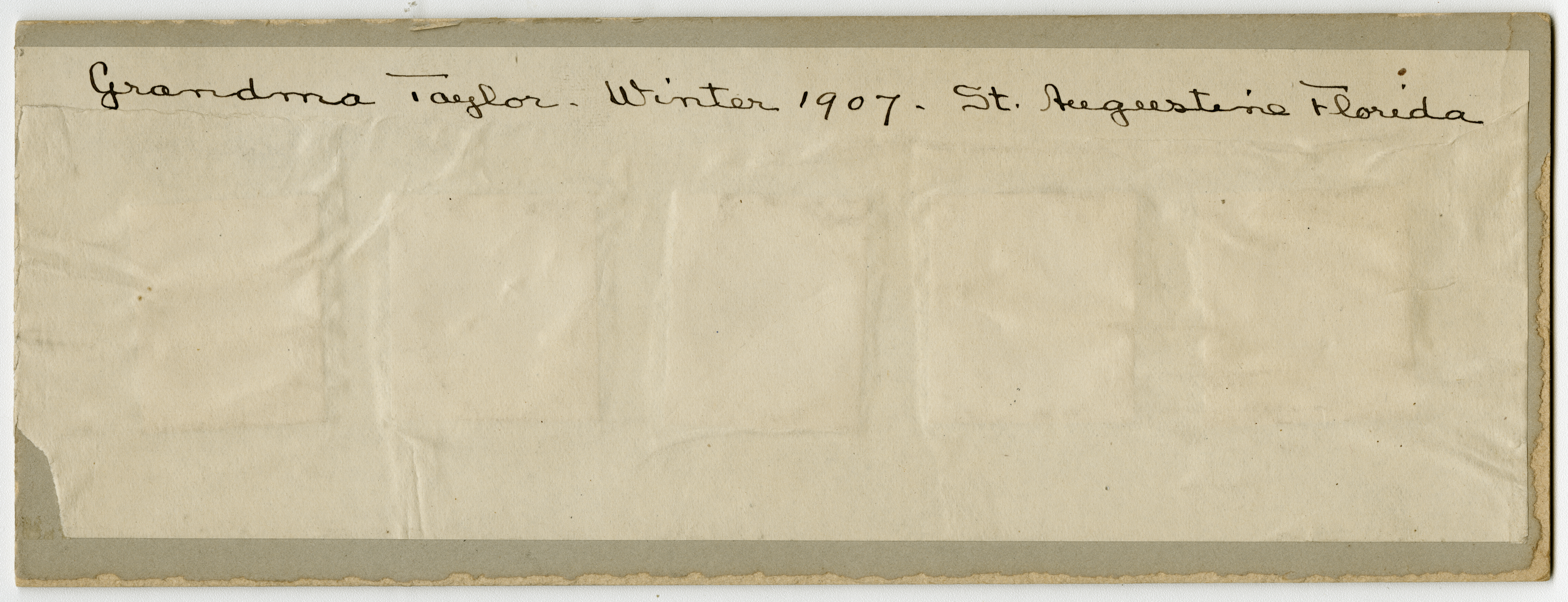 A matted and hand decorated package of five small photographs of Grandma Taylor. Text on back - Grandma Taylor, Winter 1907, St. Augustine, Florida.