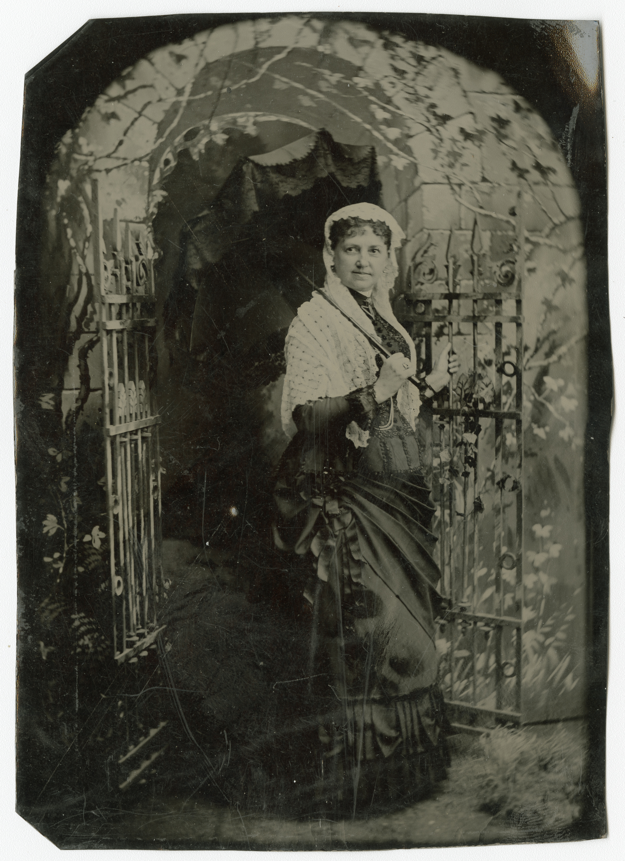 A quarter plate tin-type photograph of an unidentified woman standing in a archway with a gate. She is dressed nicely and is wearing a shawl and holding an umbrella.