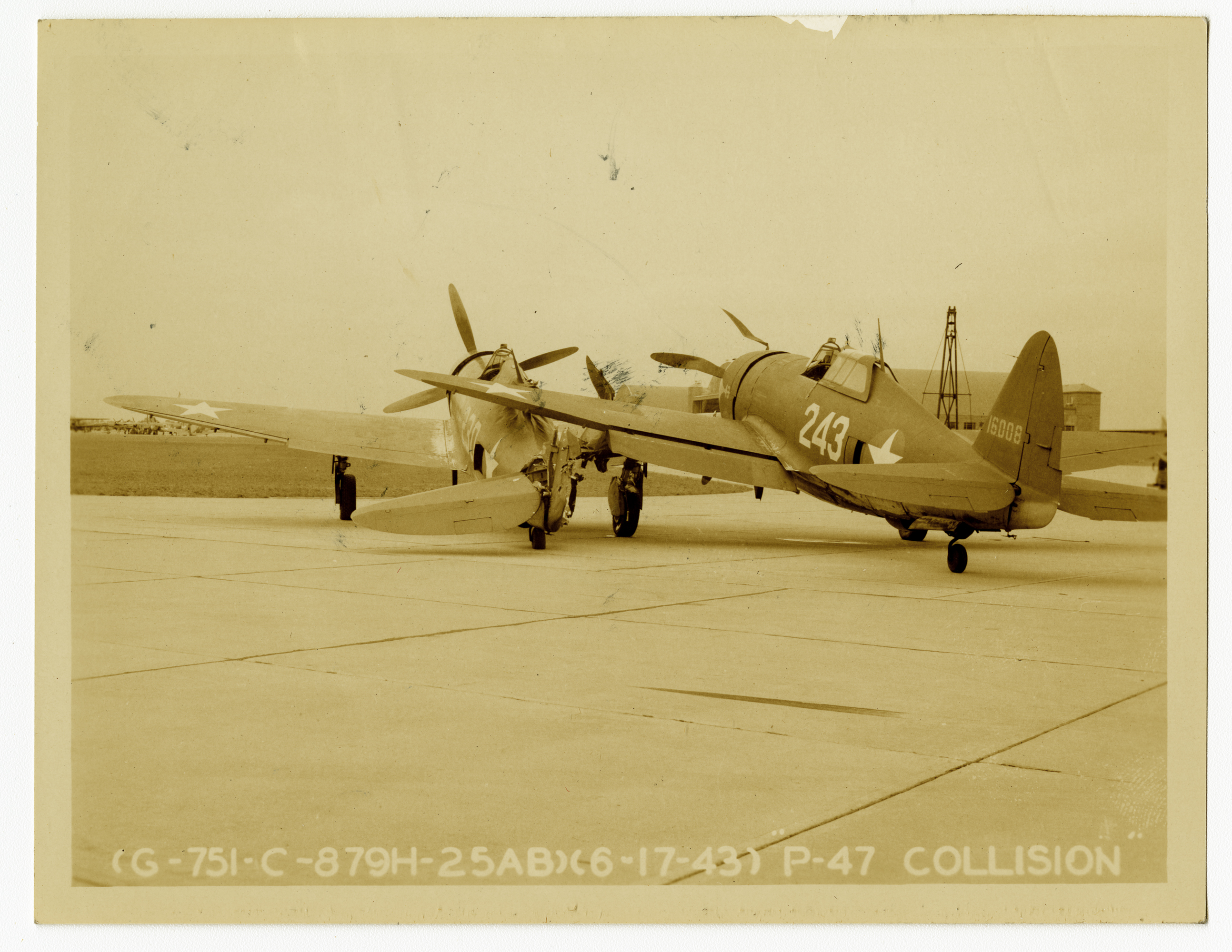 Two P47 aircraft collided on the WAFB tarmac causing damage to both planes. One of four images of the damage photographed by a base photographer.
