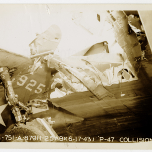 Two P47 aircraft collided on the WAFB tarmac causing damage to both planes. Third of four images of the damage photographed by a base photographer.