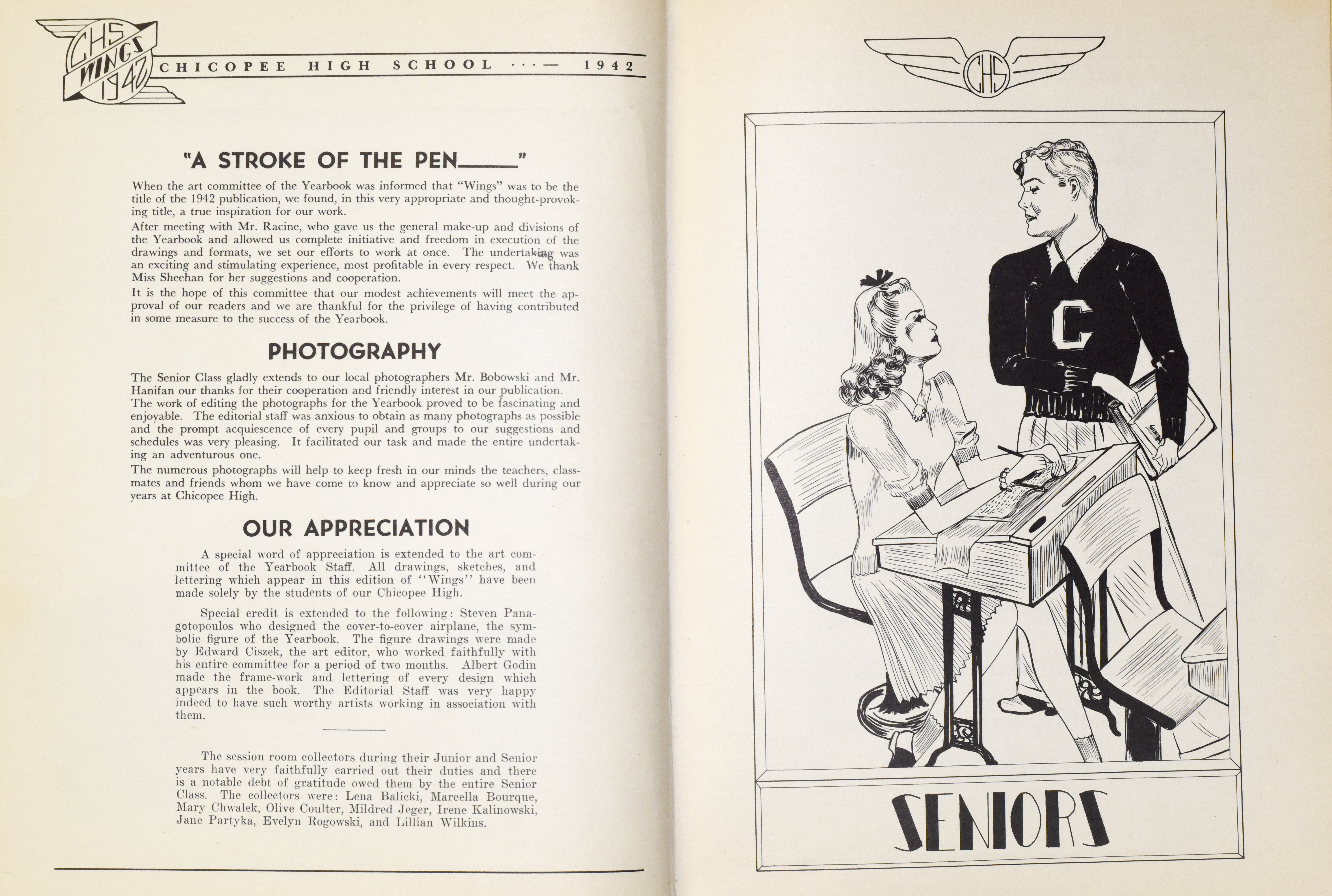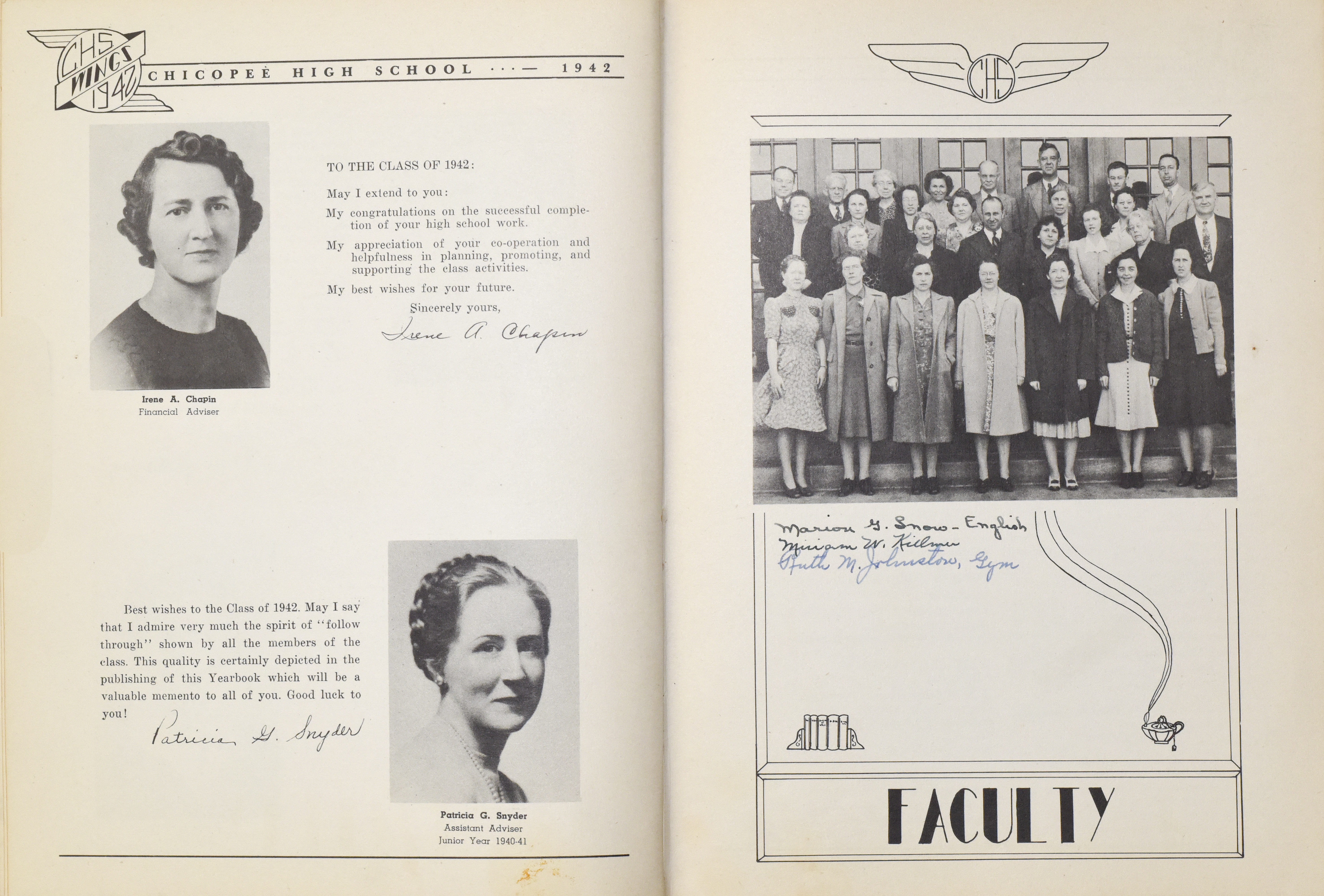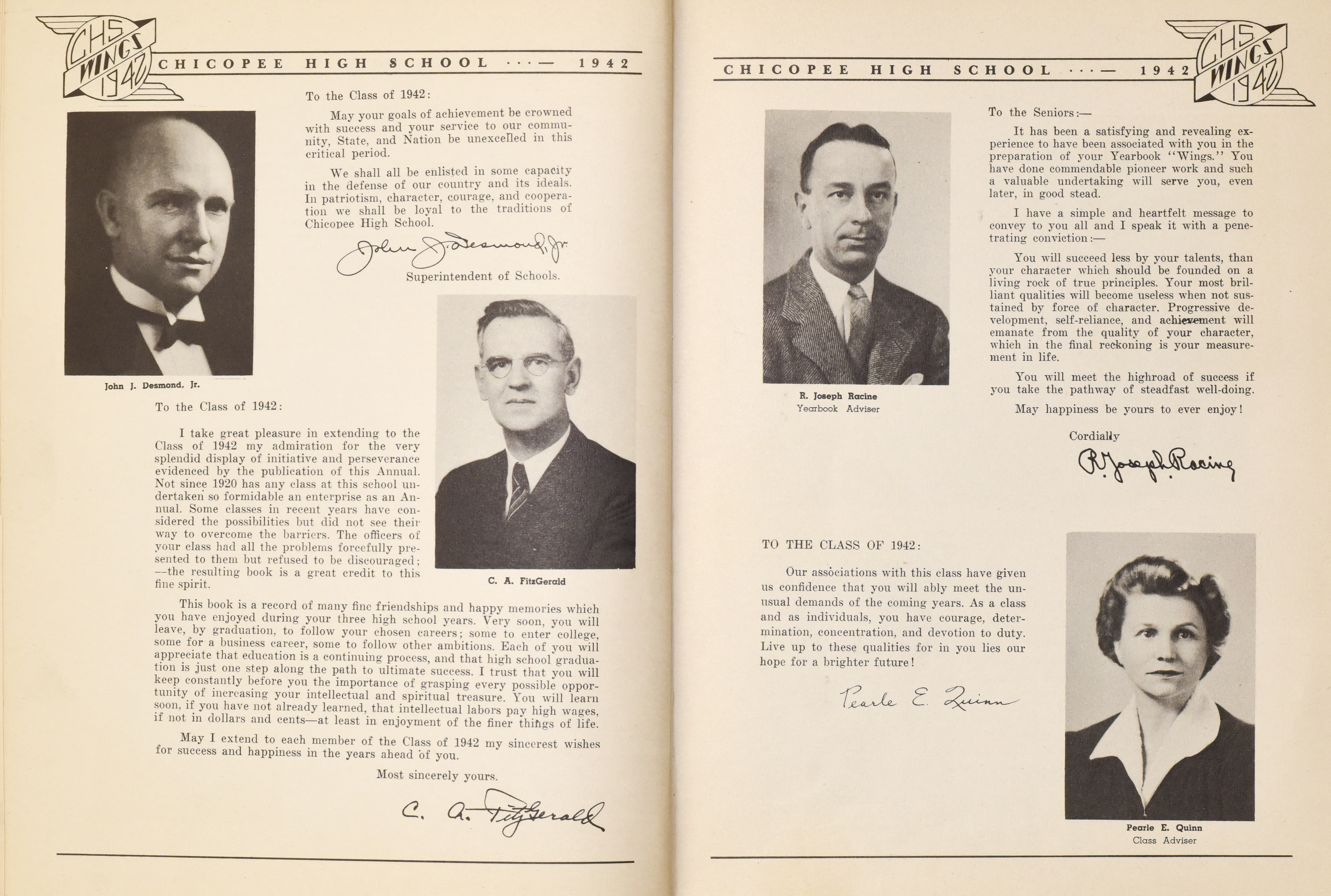 Yearbook for the class of 1942 of the Chicopee High School. Includes class photographs; individual senior portraits; clubs; sports; faculty; class will; casual photographs of students; dedications and sponser ads.
