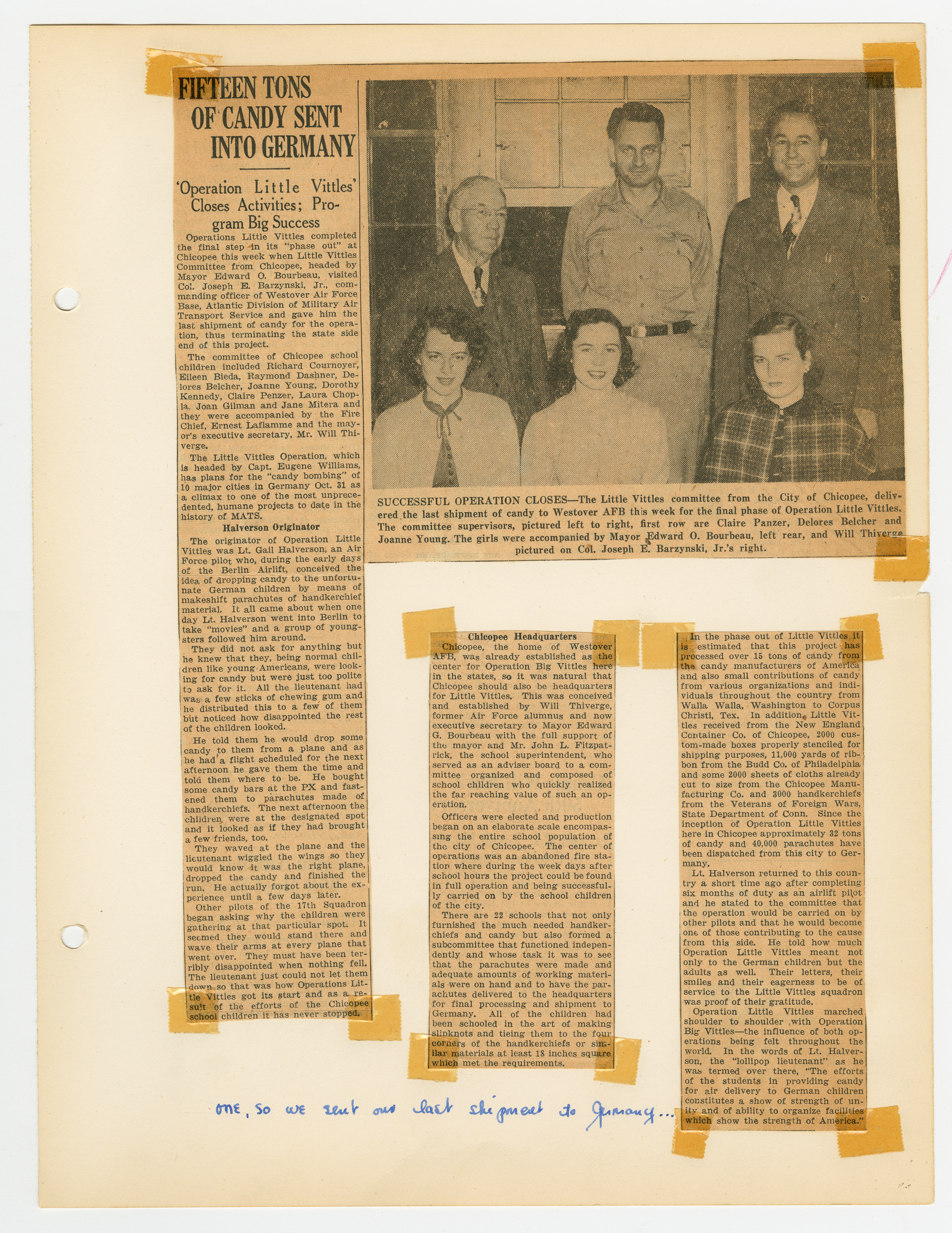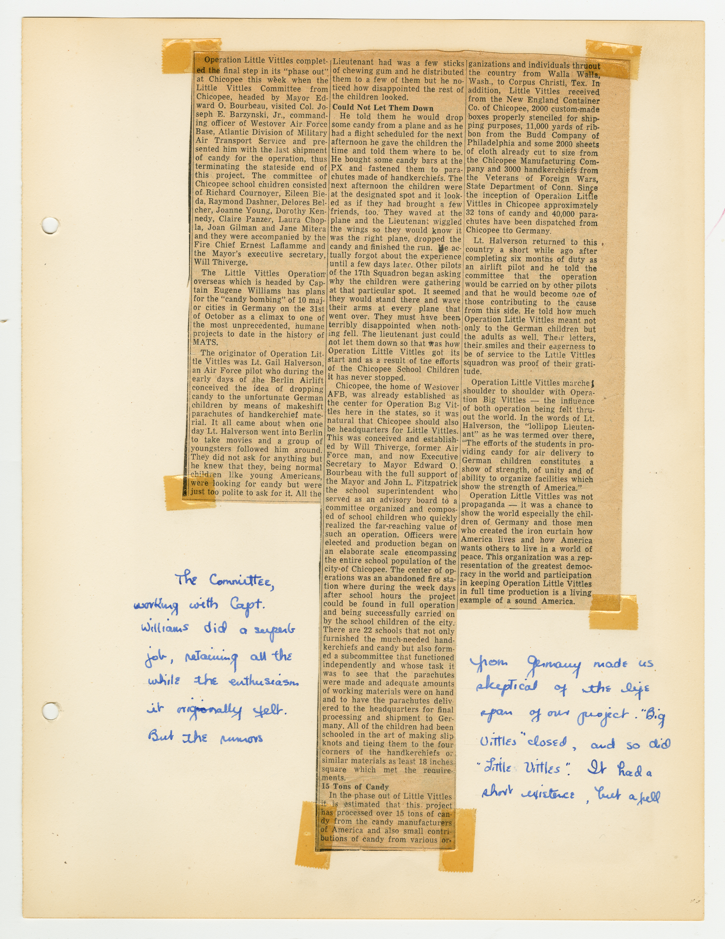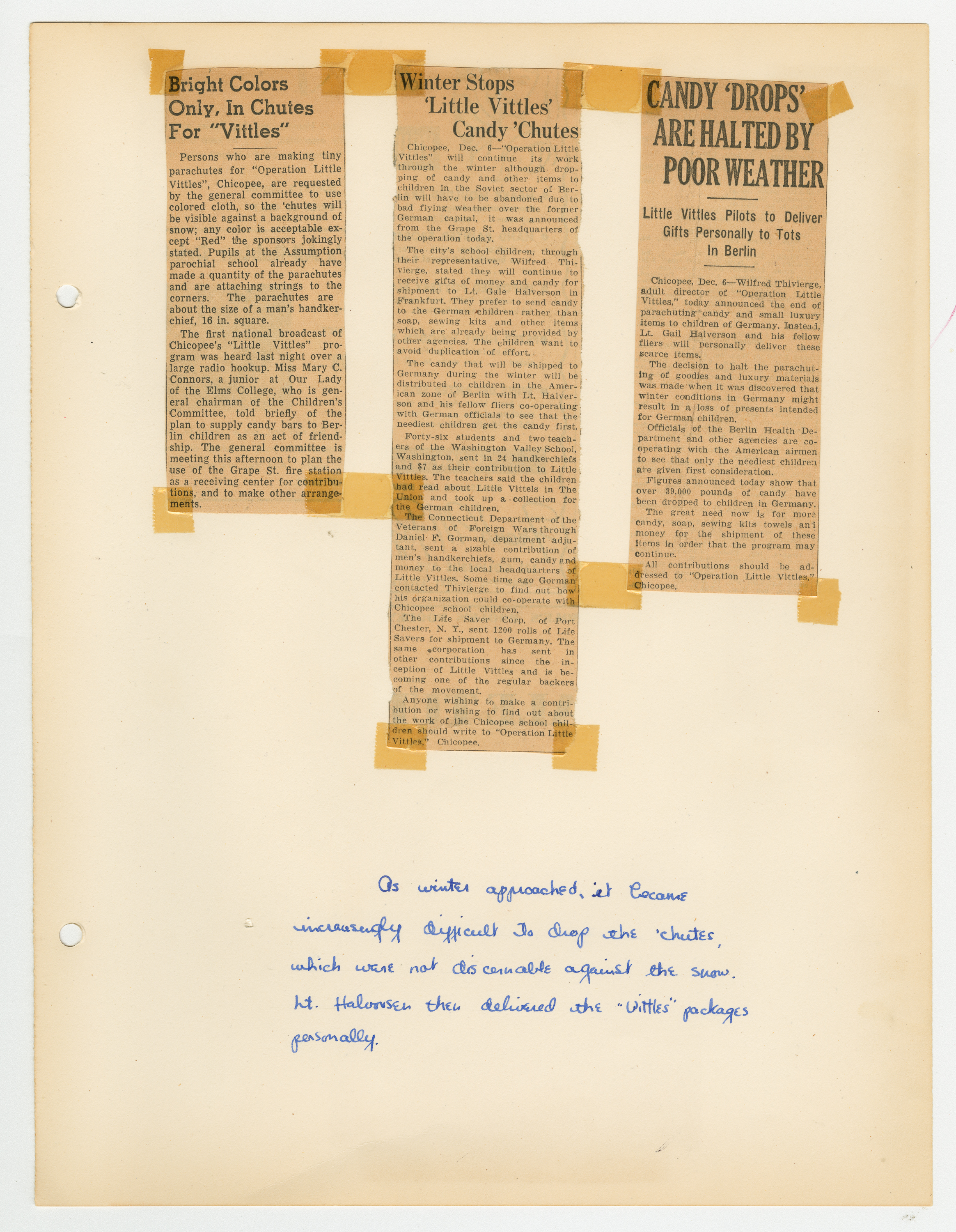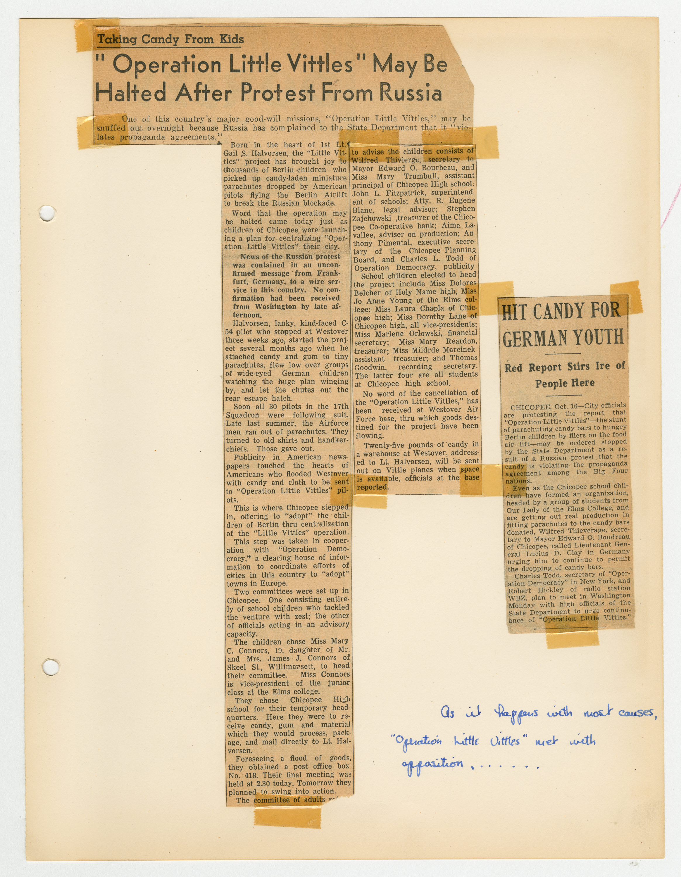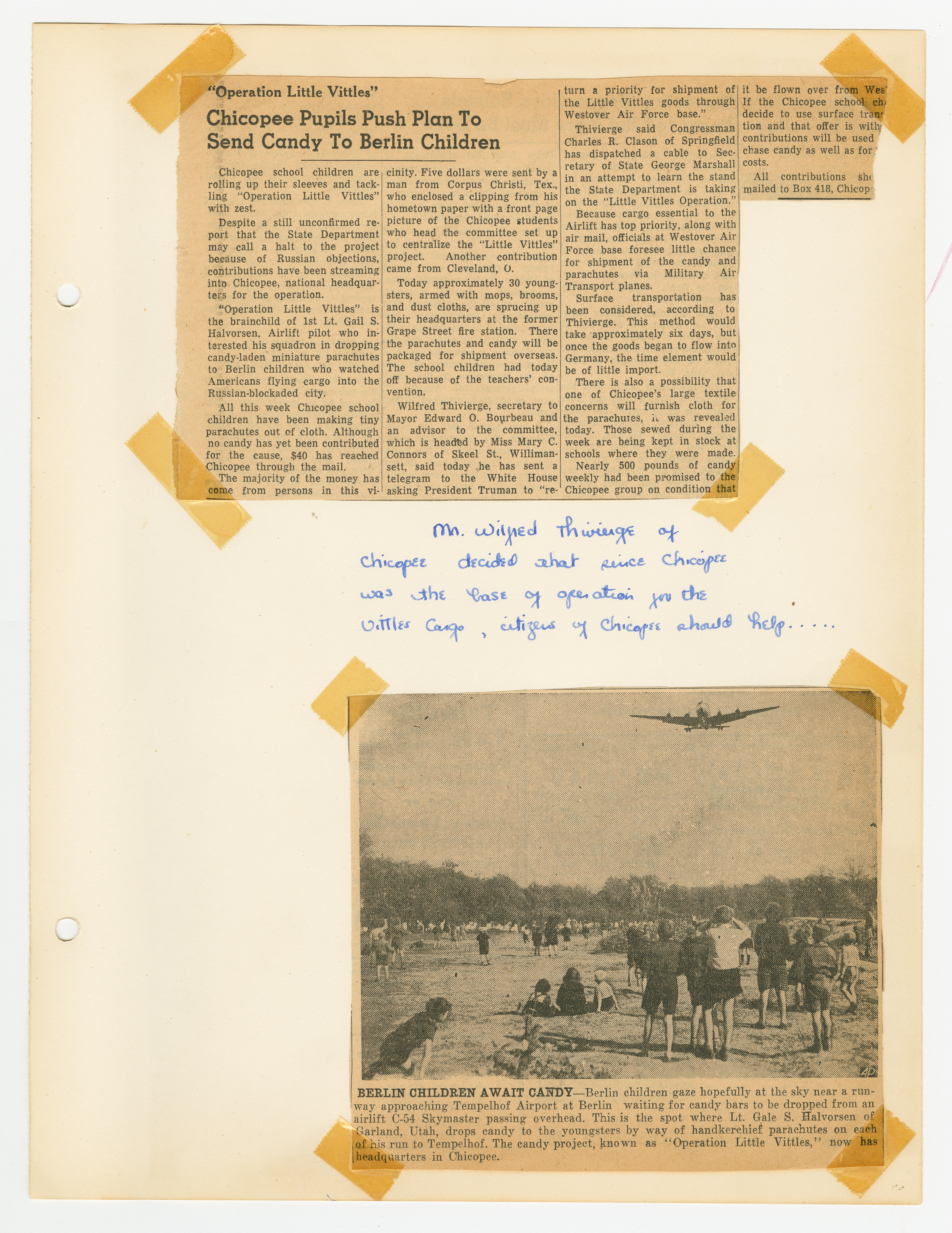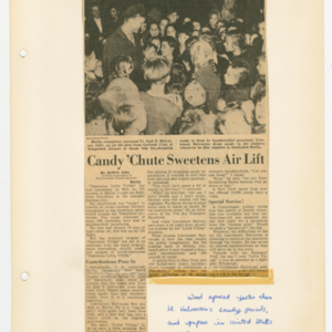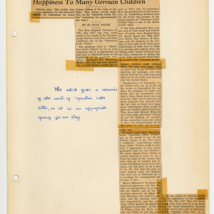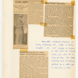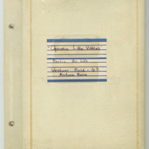 Operation Little Vittles was a goodwill mission to drop candy to German children during the Berlin Airlift of 1948-1949 and was headquartered in Chicopee, Massachusetts. This scrapbook is a record of the Operation Little Vittles Committee and provides information about the group of volunteers who were involved. The scrapbook contains official minutes of their meetings, the committee’s constitution and rules of operation, newspaper clippings, handwritten letters in German from children who received candy during the drops and a few photographs. The Little Vittles committee was responsible for coordinating and gathering candy and handkerchiefs to be delivered to Westover Air Force Base. From there the supplies were brought to Germany to be dropped to children in West Berlin.