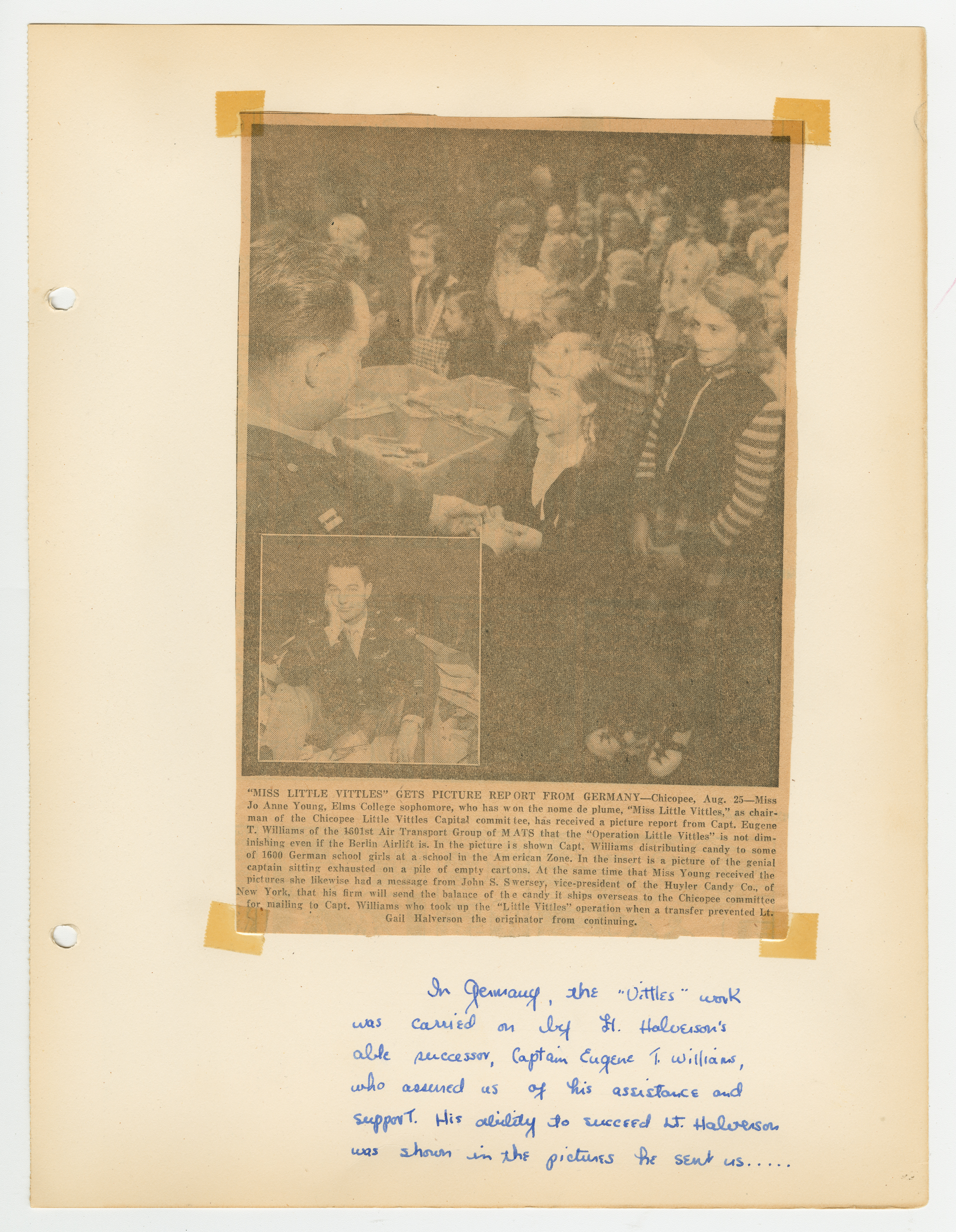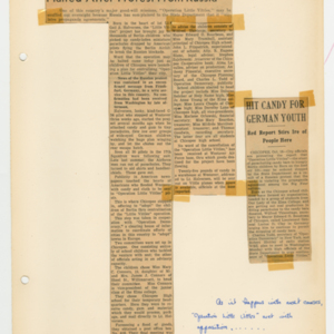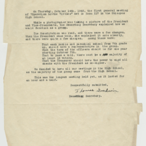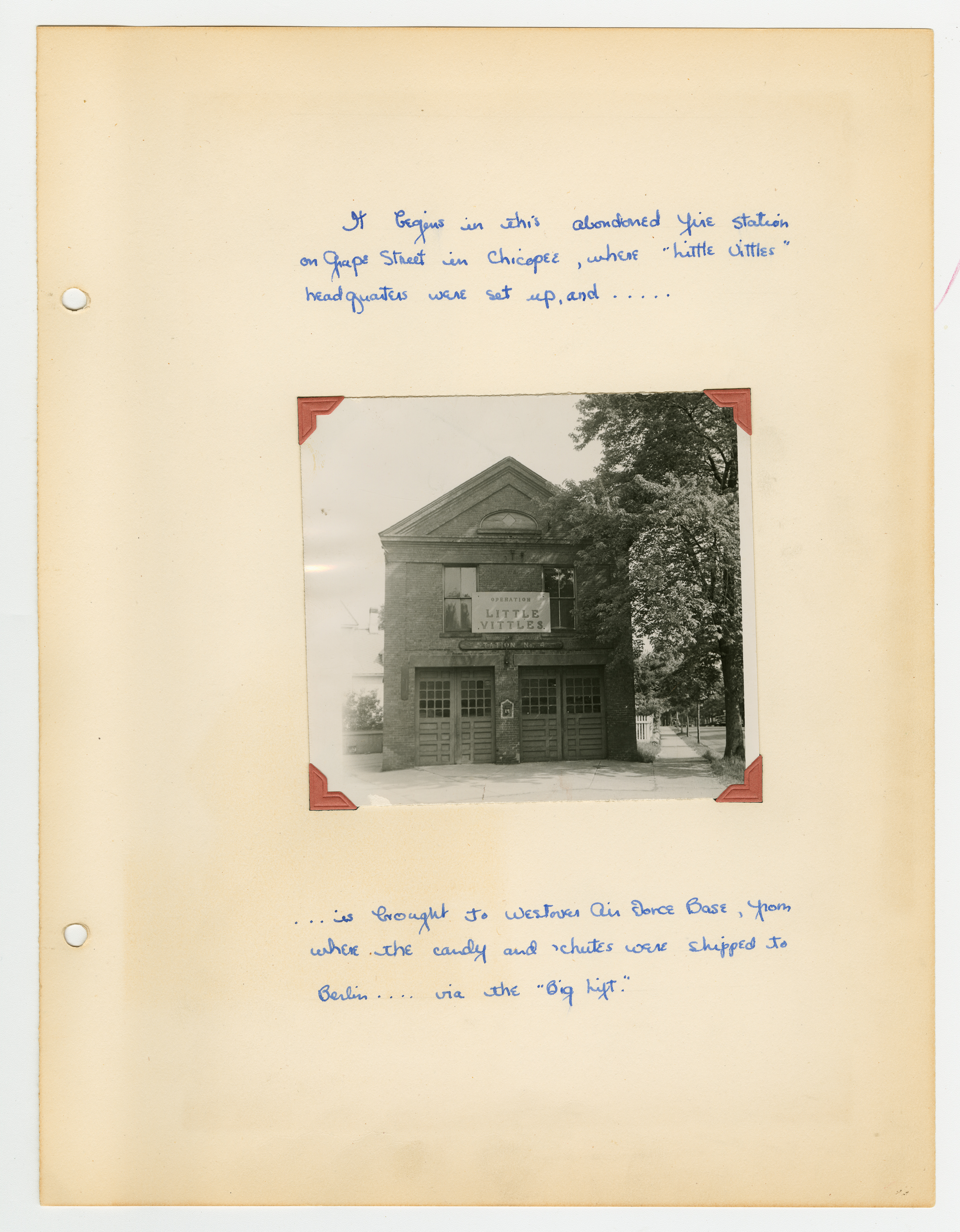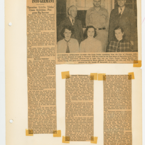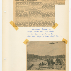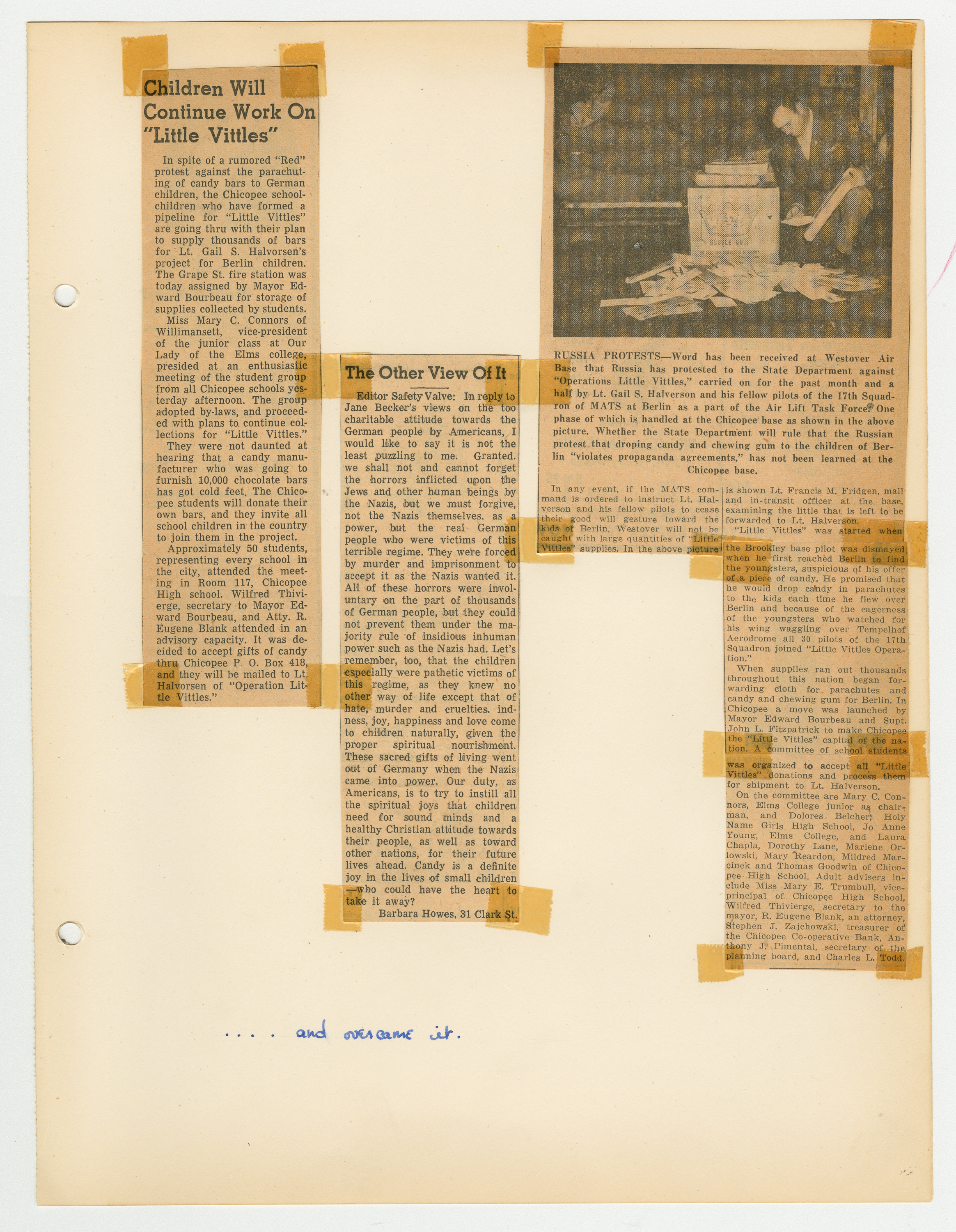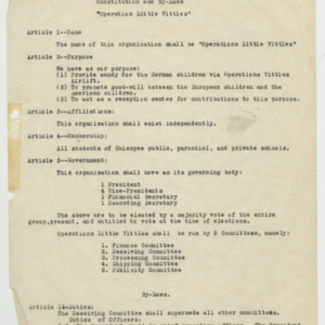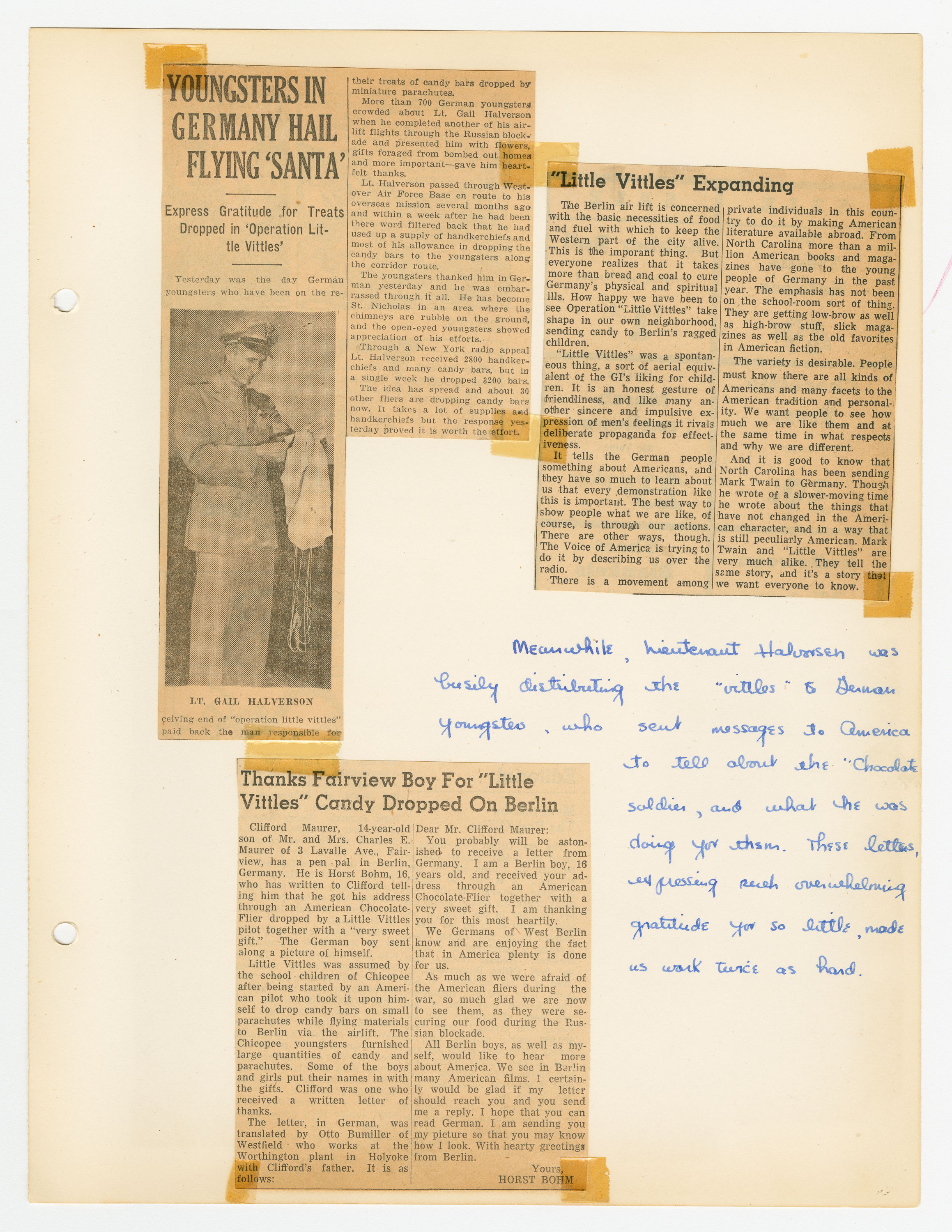 Operation Little Vittles was a goodwill mission to drop candy to German children during the Berlin Airlift of 1948-1949 and was headquartered in Chicopee, Massachusetts. This scrapbook is a record of the Operation Little Vittles Committee and provides information about the group of volunteers who were involved. The scrapbook contains official minutes of their meetings, the committee’s constitution and rules of operation, newspaper clippings, handwritten letters in German from children who received candy during the drops and a few photographs. The Little Vittles committee was responsible for coordinating and gathering candy and handkerchiefs to be delivered to Westover Air Force Base. From there the supplies were brought to Germany to be dropped to children in West Berlin.