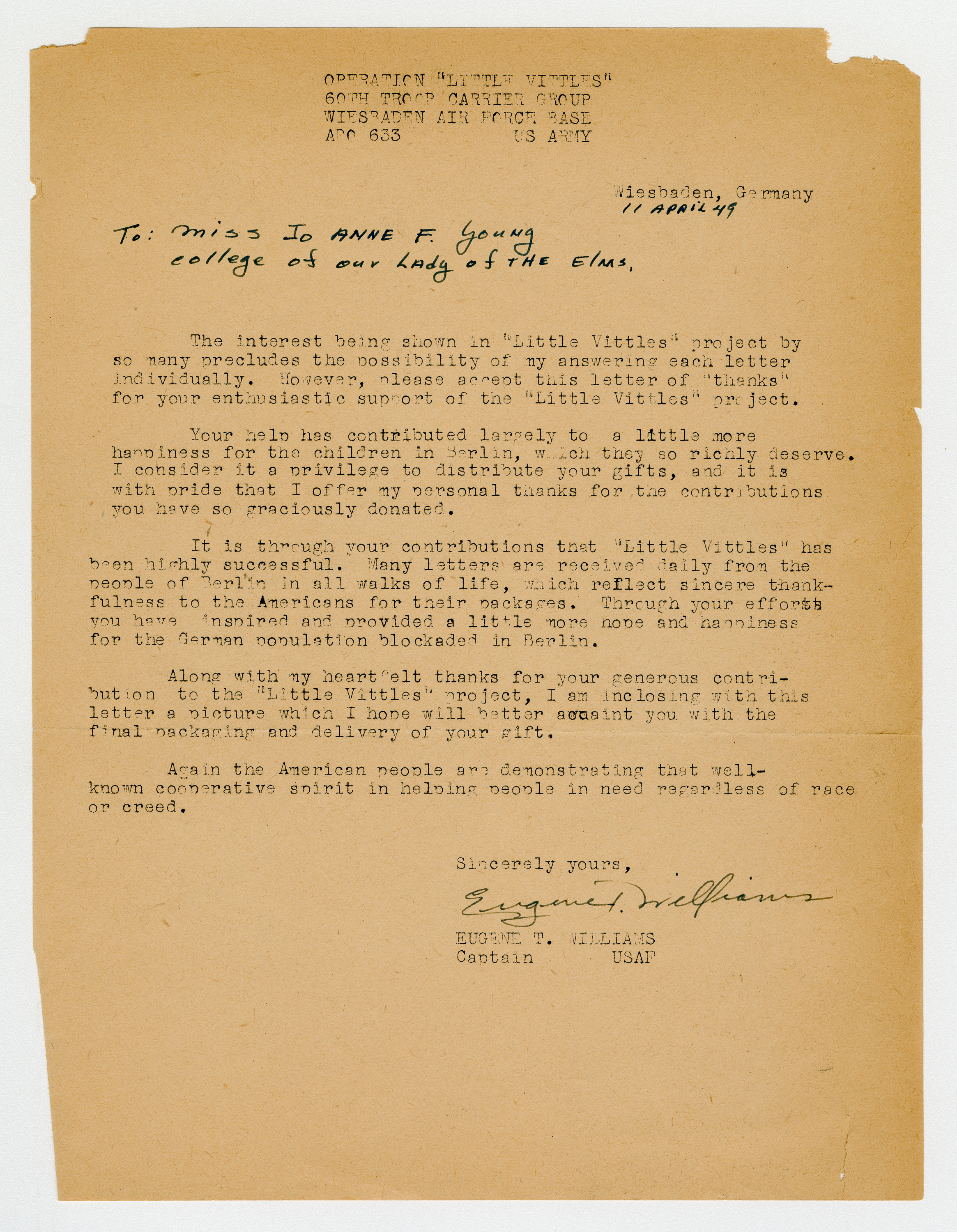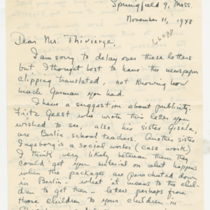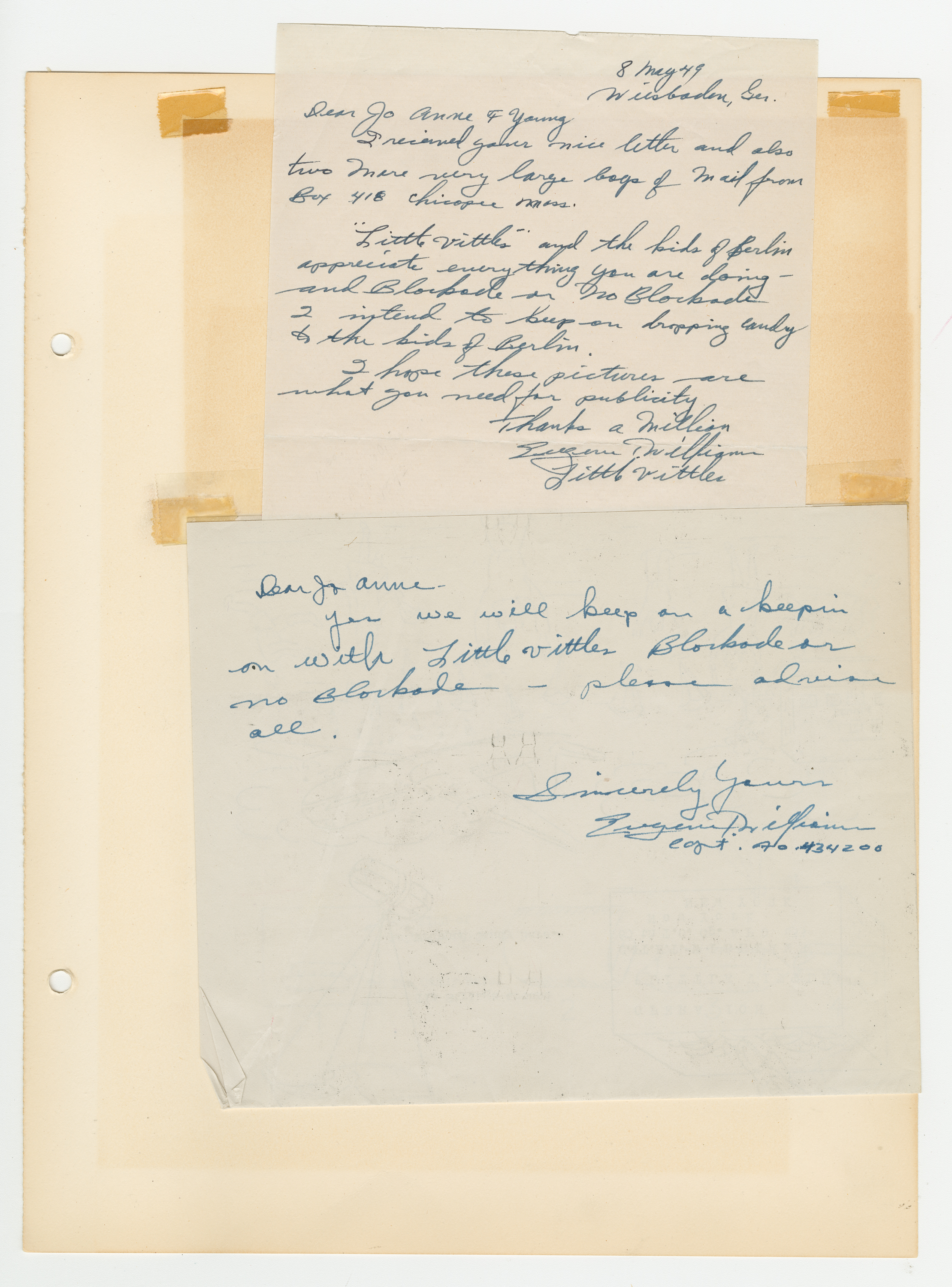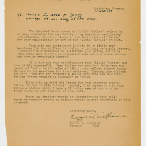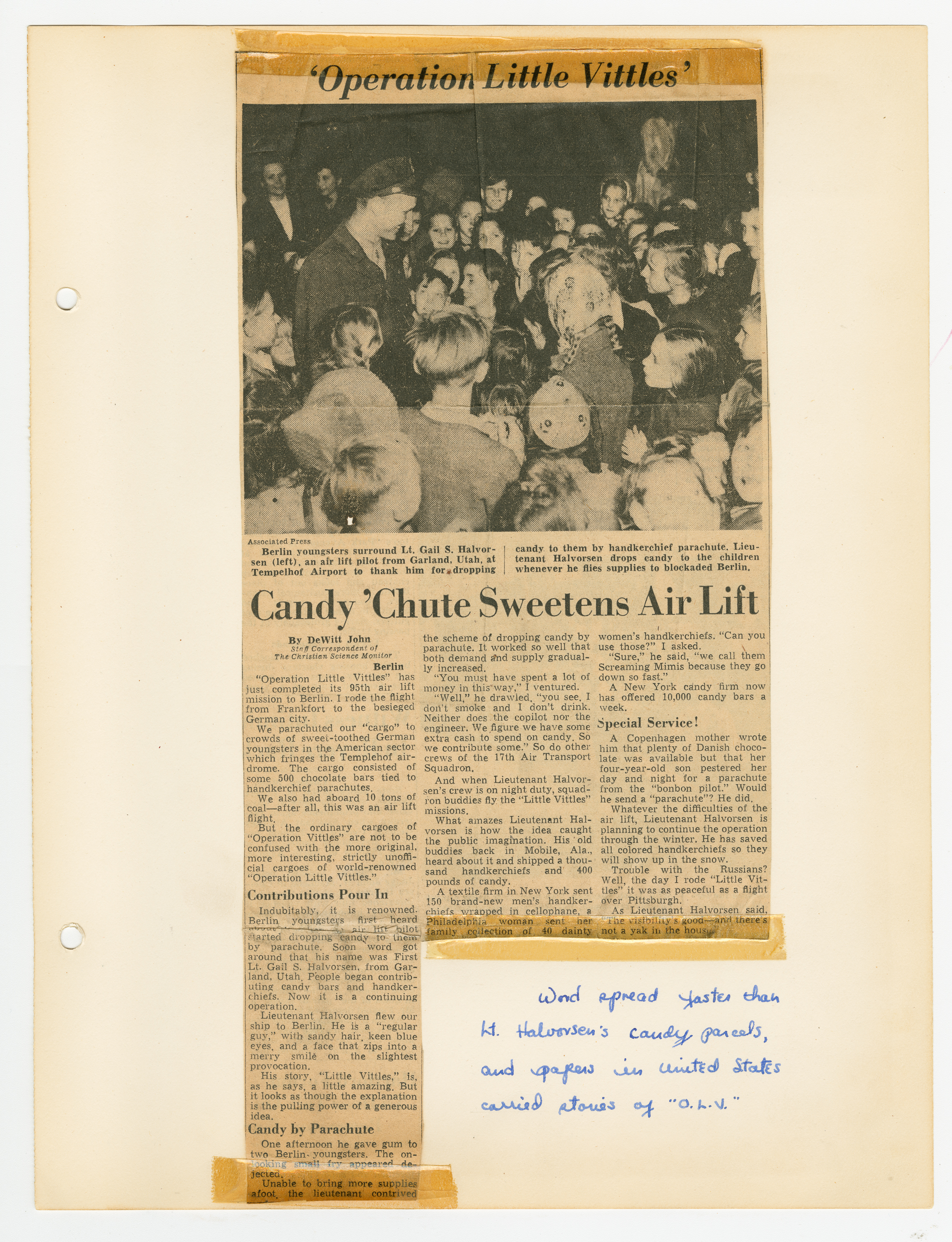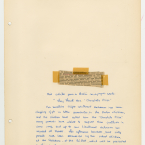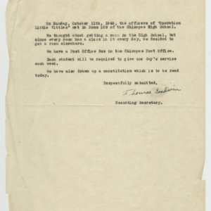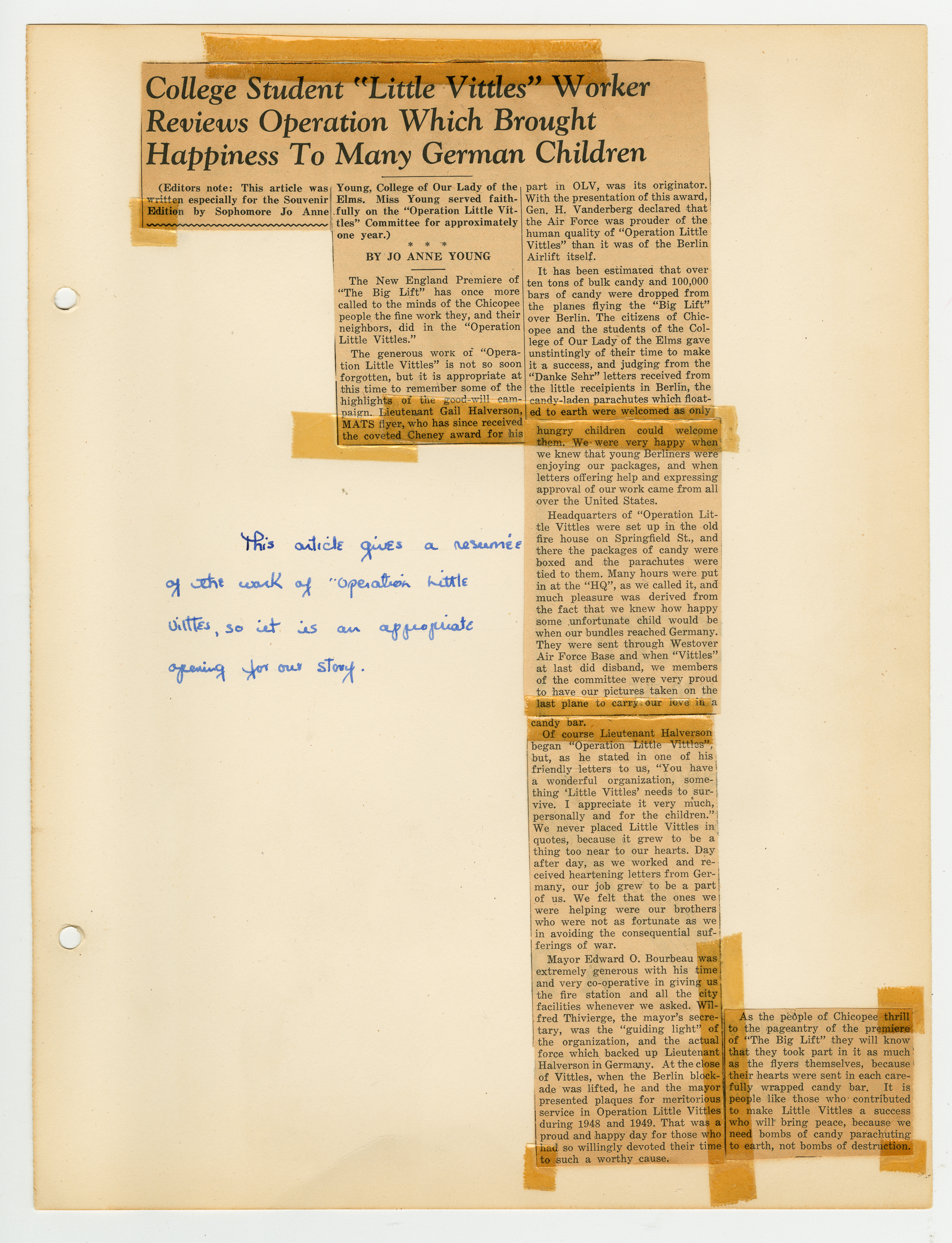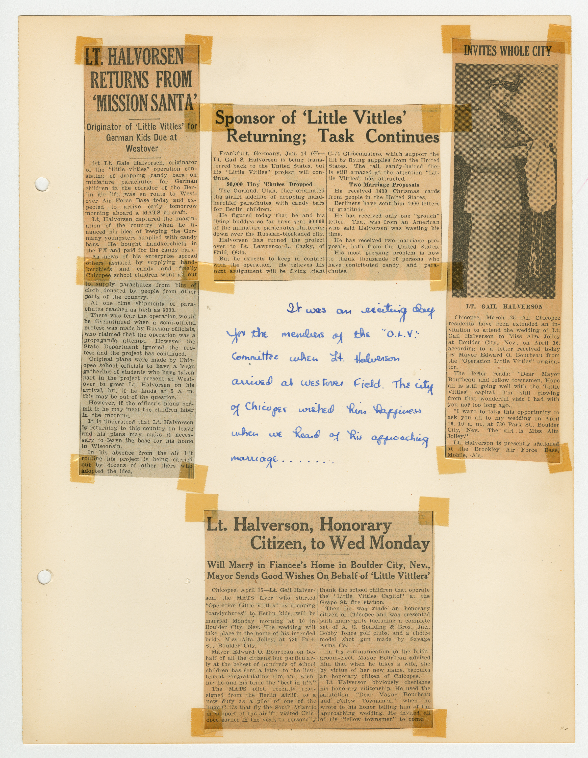 Operation Little Vittles was a goodwill mission to drop candy to German children during the Berlin Airlift of 1948-1949 and was headquartered in Chicopee, Massachusetts. This scrapbook is a record of the Operation Little Vittles Committee and provides information about the group of volunteers who were involved. The scrapbook contains official minutes of their meetings, the committee’s constitution and rules of operation, newspaper clippings, handwritten letters in German from children who received candy during the drops and a few photographs. The Little Vittles committee was responsible for coordinating and gathering candy and handkerchiefs to be delivered to Westover Air Force Base. From there the supplies were brought to Germany to be dropped to children in West Berlin.