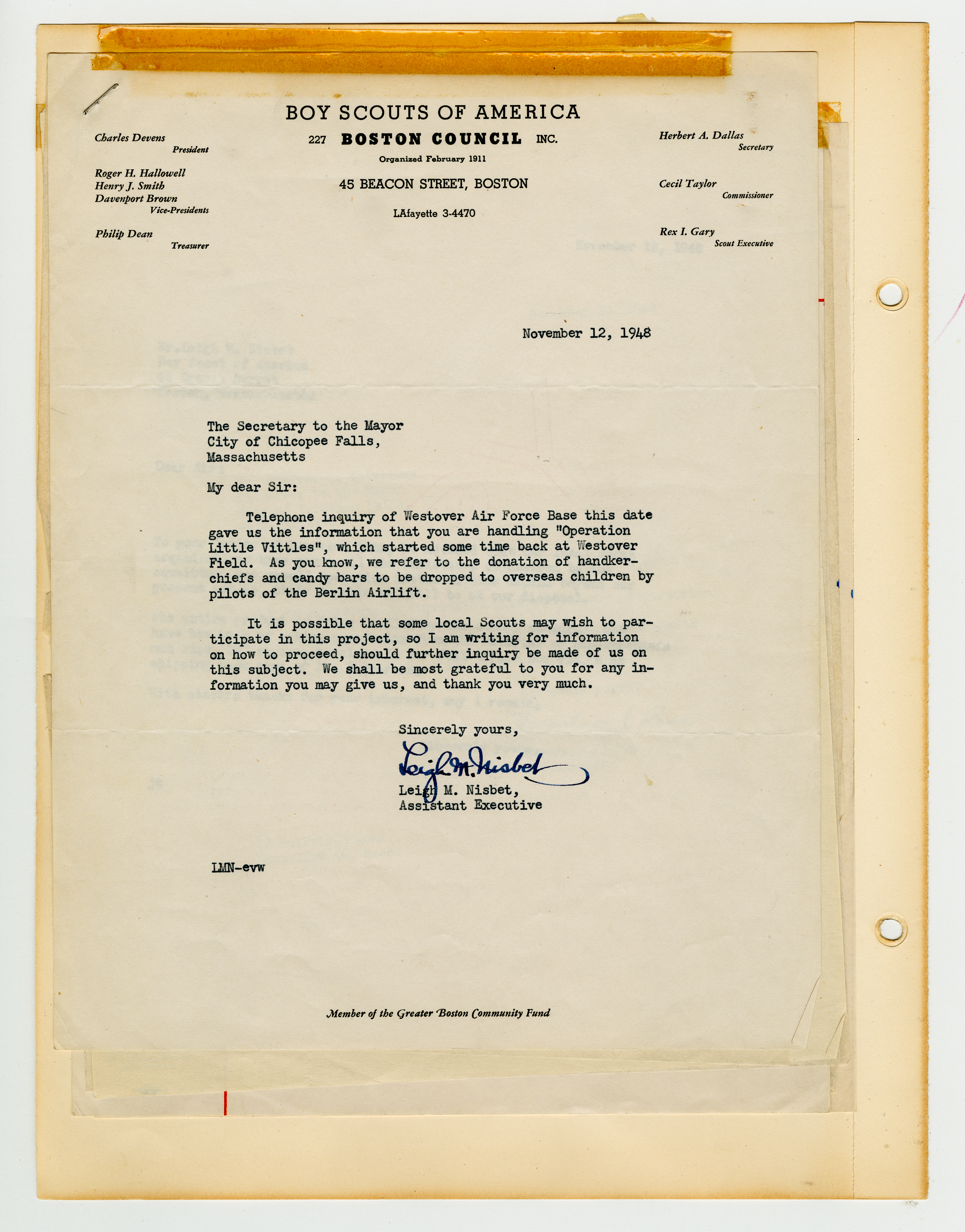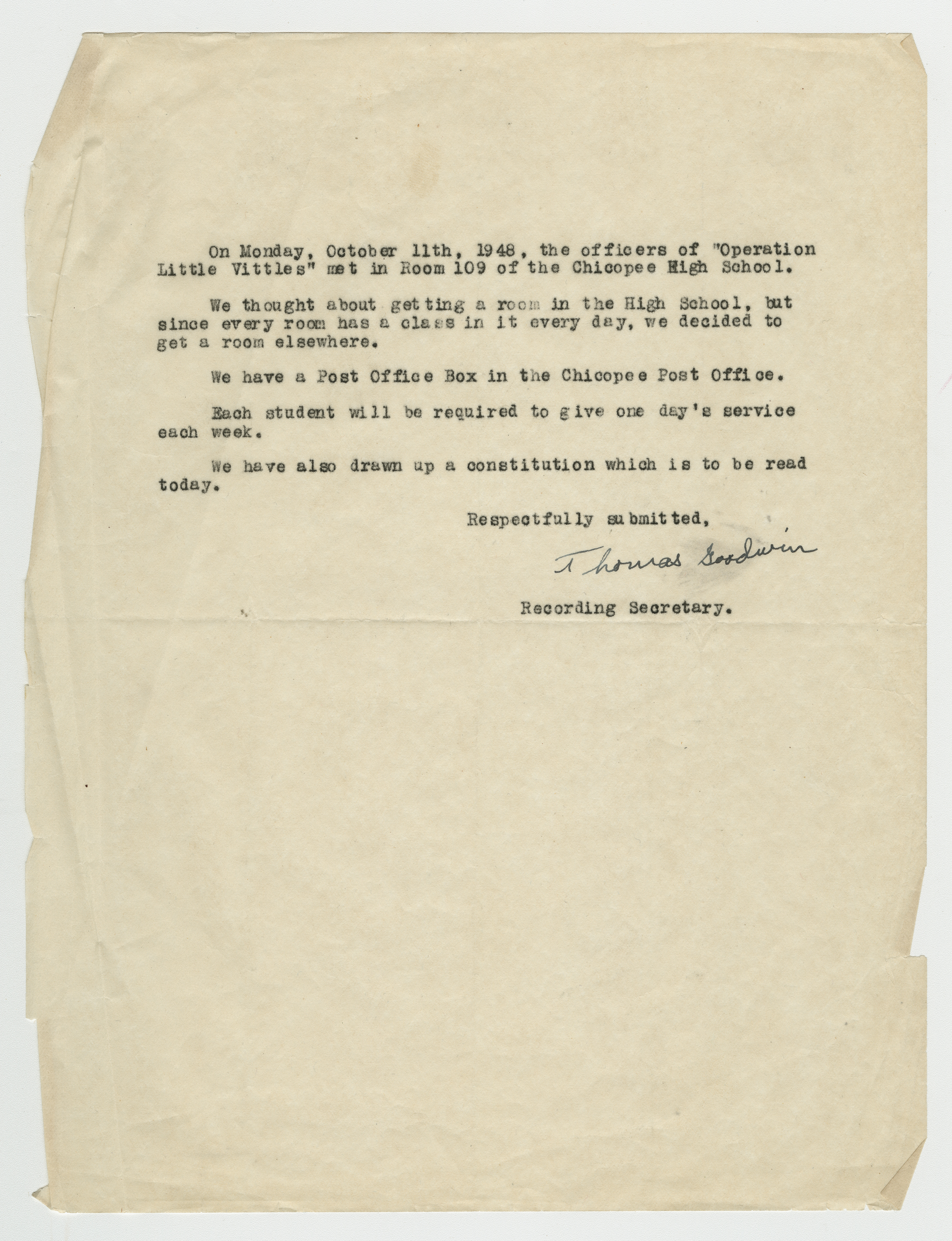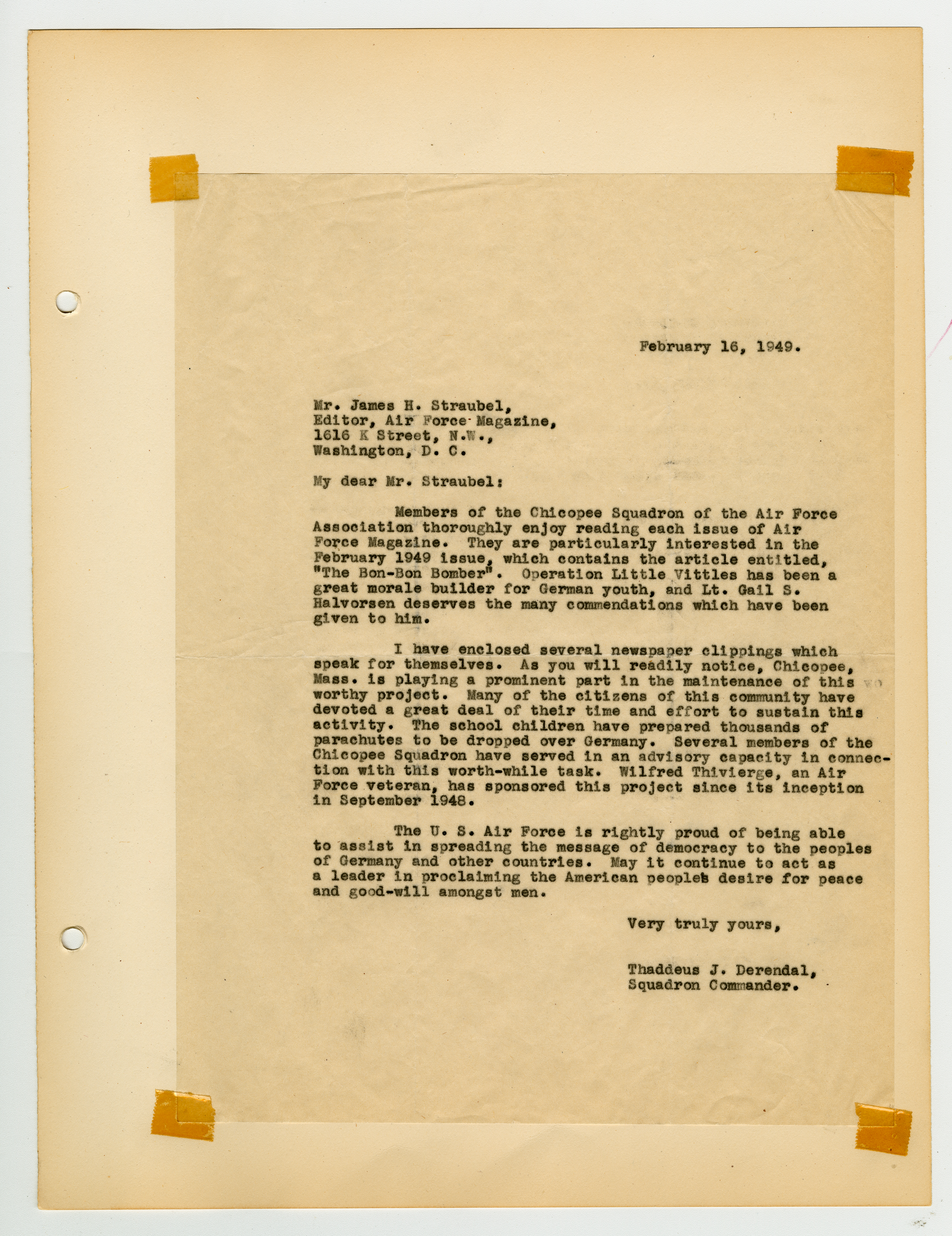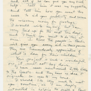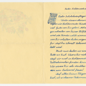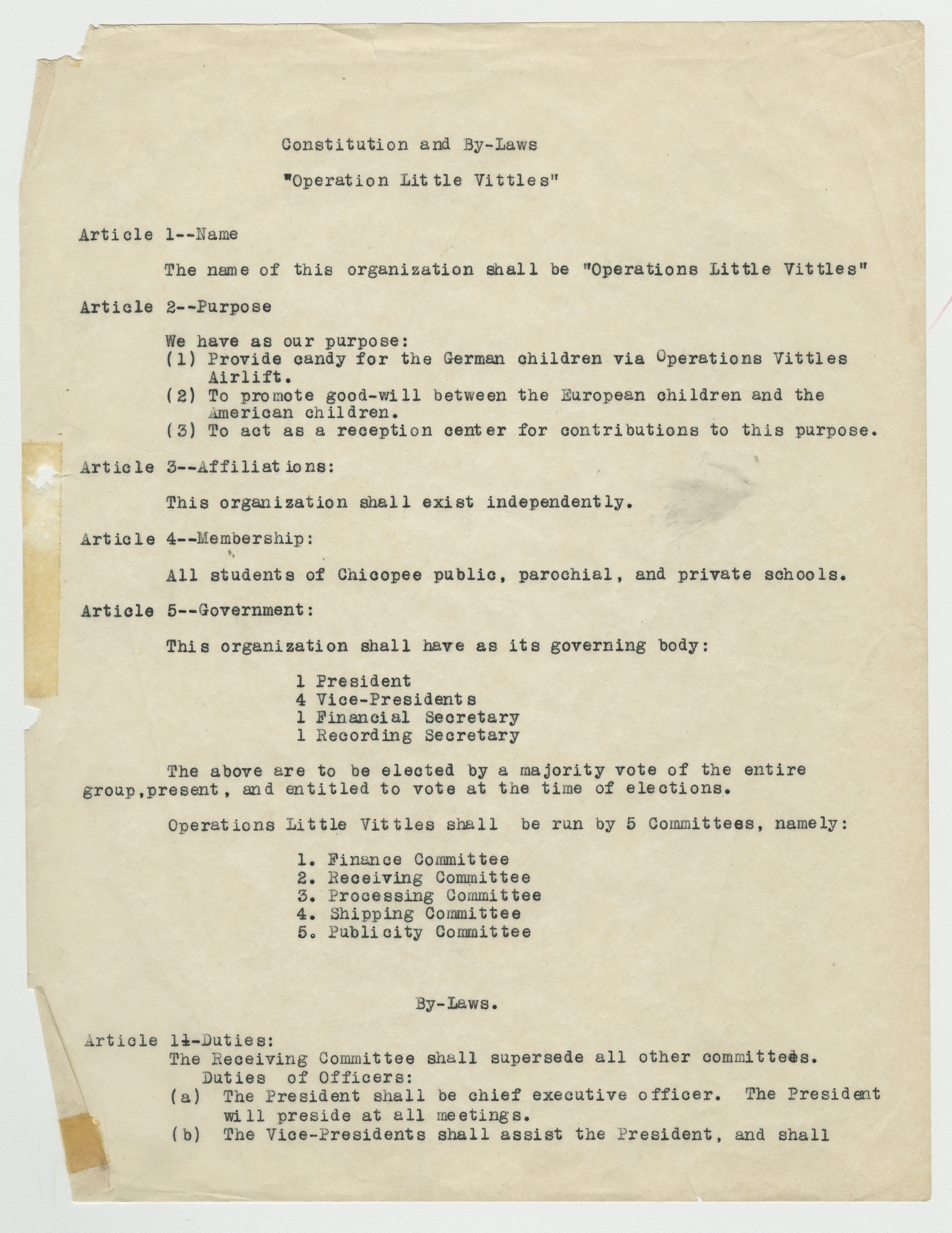 Operation Little Vittles was a goodwill mission to drop candy to German children during the Berlin Airlift of 1948-1949 and was headquartered in Chicopee, Massachusetts. This scrapbook is a record of the Operation Little Vittles Committee and provides information about the group of volunteers who were involved. The scrapbook contains official minutes of their meetings, the committee’s constitution and rules of operation, newspaper clippings, handwritten letters in German from children who received candy during the drops and a few photographs. The Little Vittles committee was responsible for coordinating and gathering candy and handkerchiefs to be delivered to Westover Air Force Base. From there the supplies were brought to Germany to be dropped to children in West Berlin.