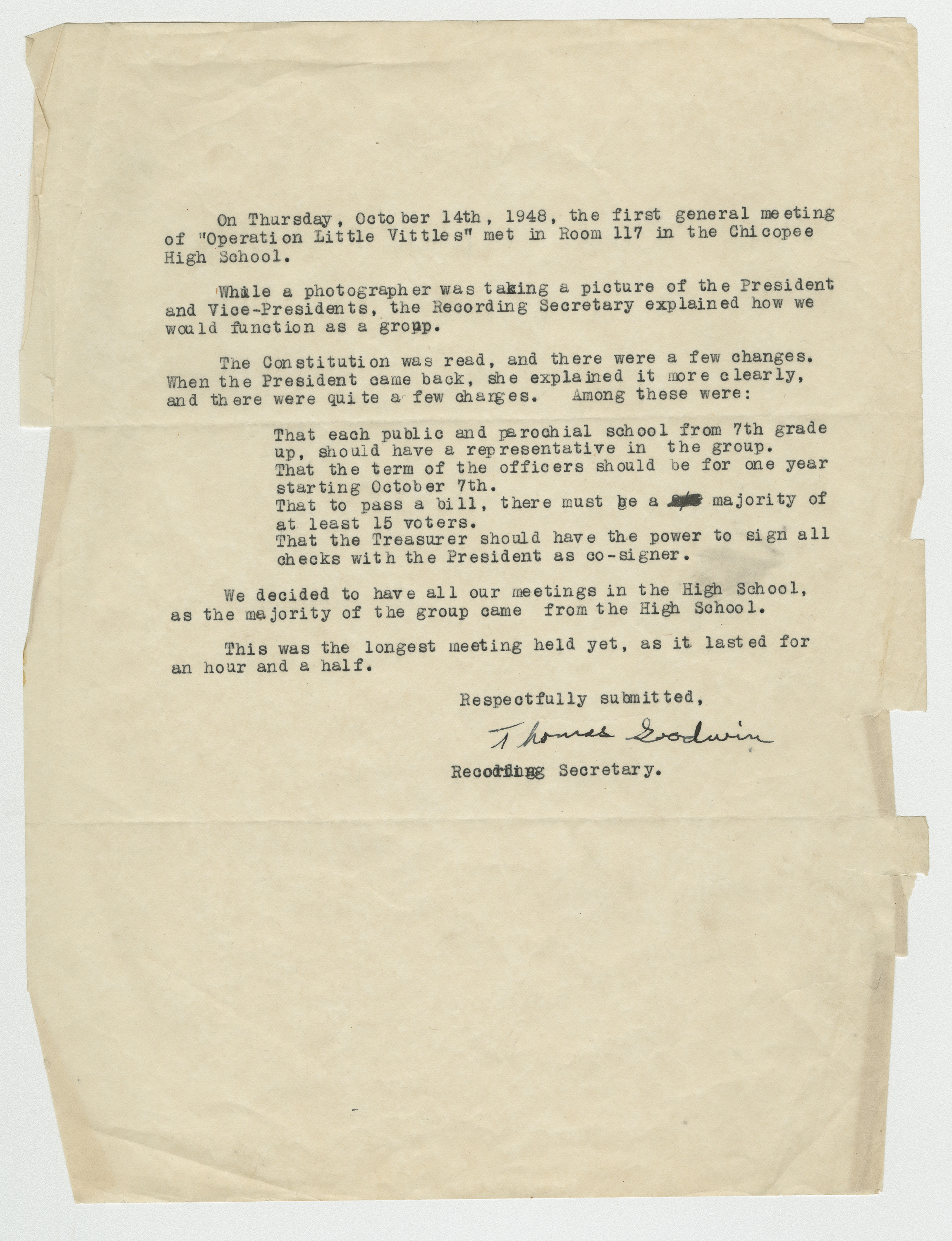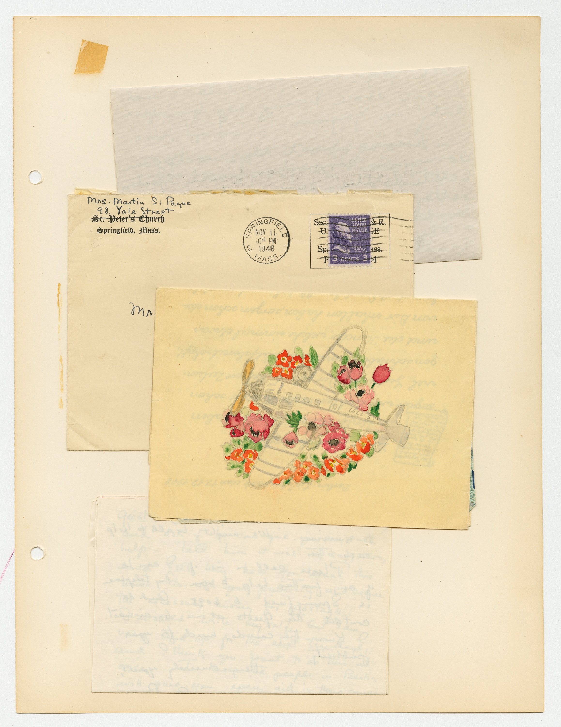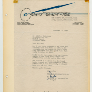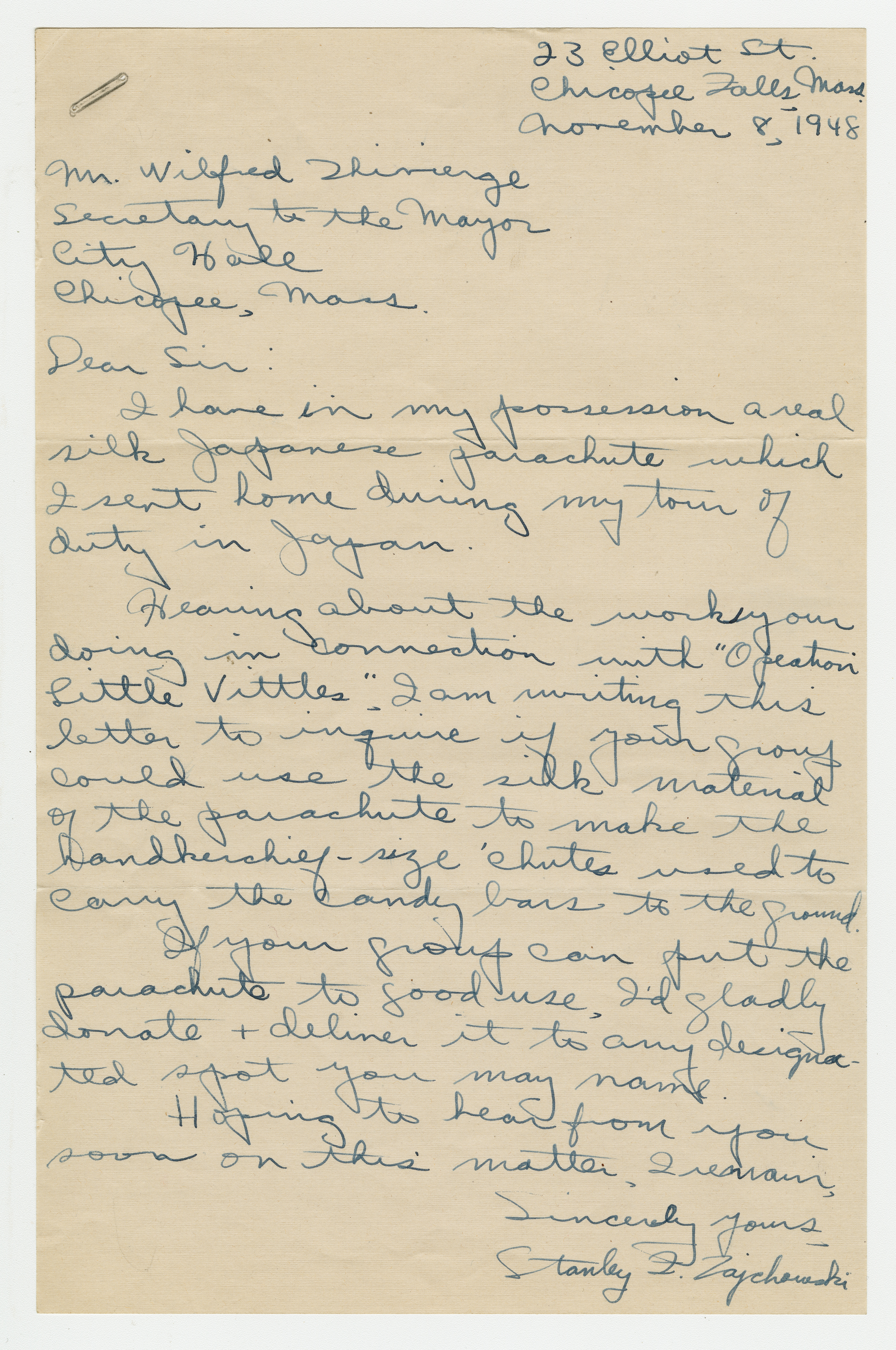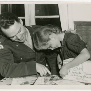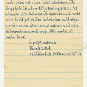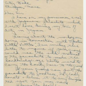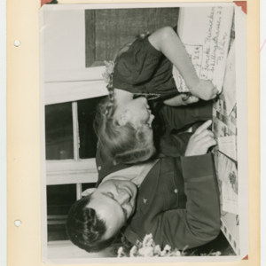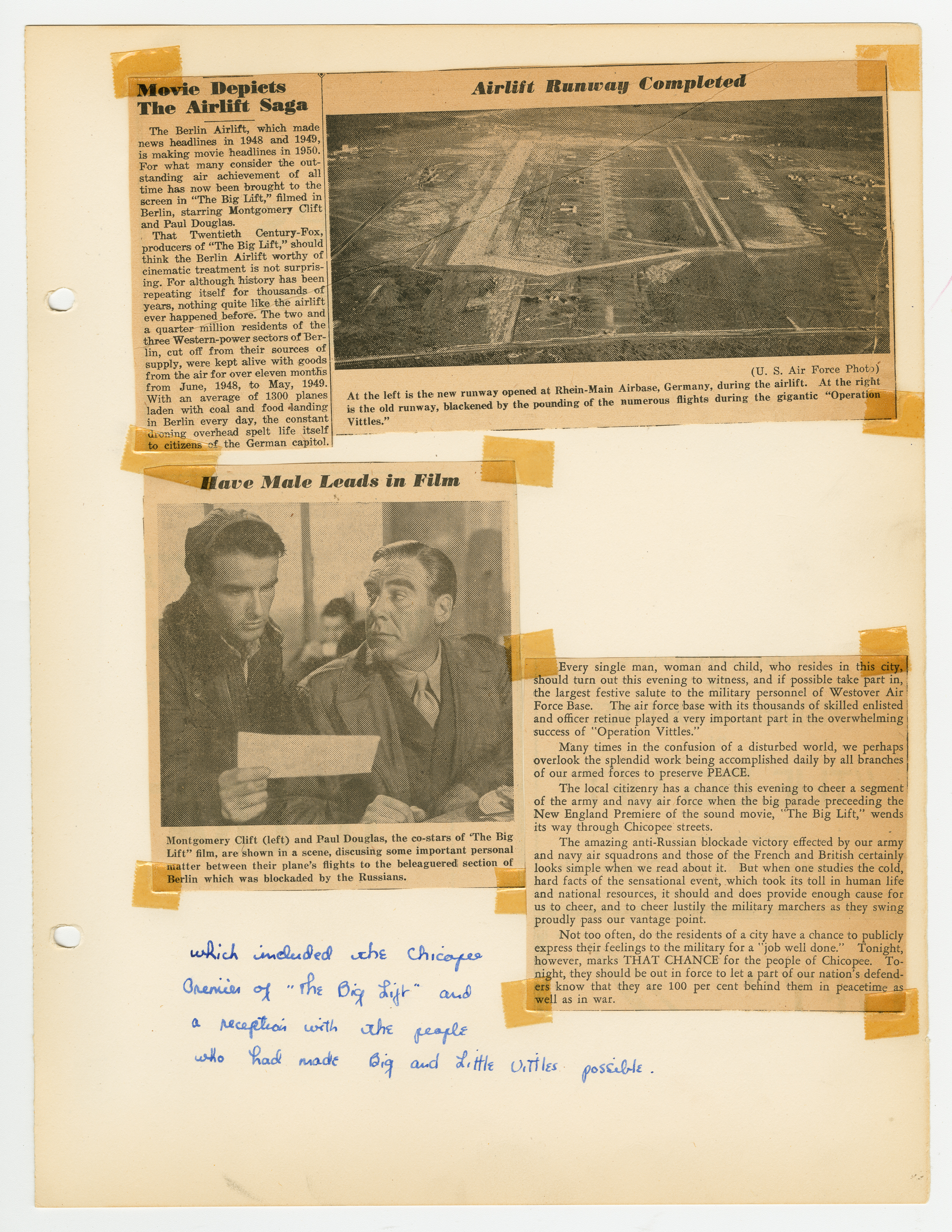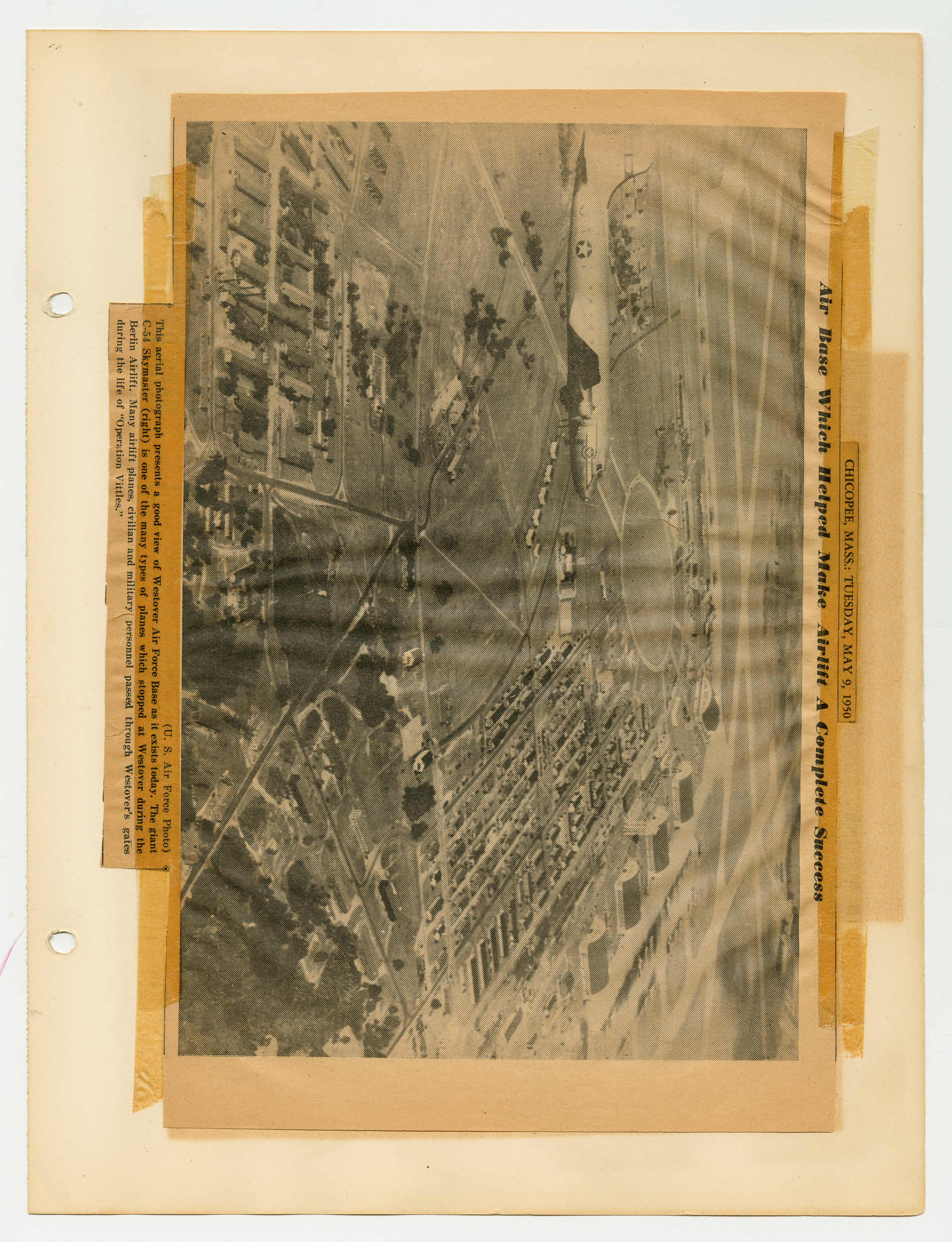 Operation Little Vittles was a goodwill mission to drop candy to German children during the Berlin Airlift of 1948-1949 and was headquartered in Chicopee, Massachusetts. This scrapbook is a record of the Operation Little Vittles Committee and provides information about the group of volunteers who were involved. The scrapbook contains official minutes of their meetings, the committee’s constitution and rules of operation, newspaper clippings, handwritten letters in German from children who received candy during the drops and a few photographs. The Little Vittles committee was responsible for coordinating and gathering candy and handkerchiefs to be delivered to Westover Air Force Base. From there the supplies were brought to Germany to be dropped to children in West Berlin.
