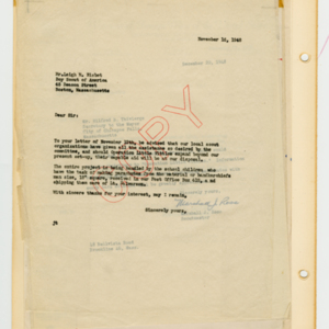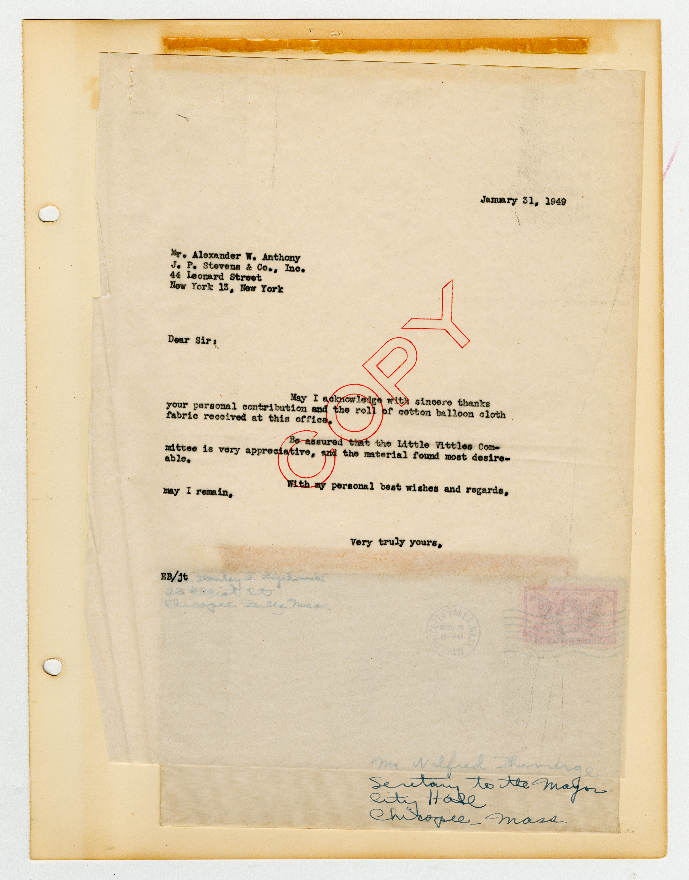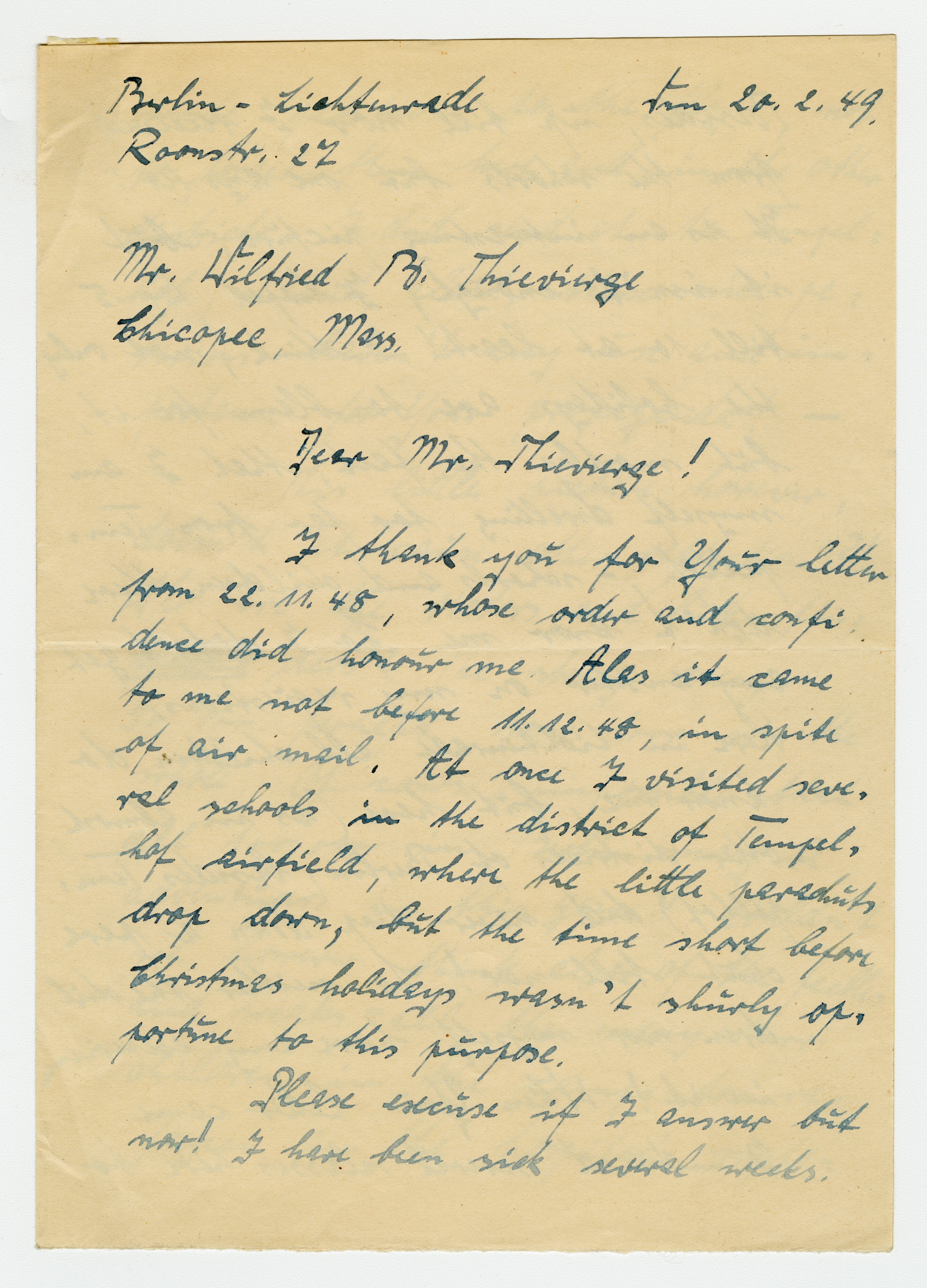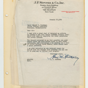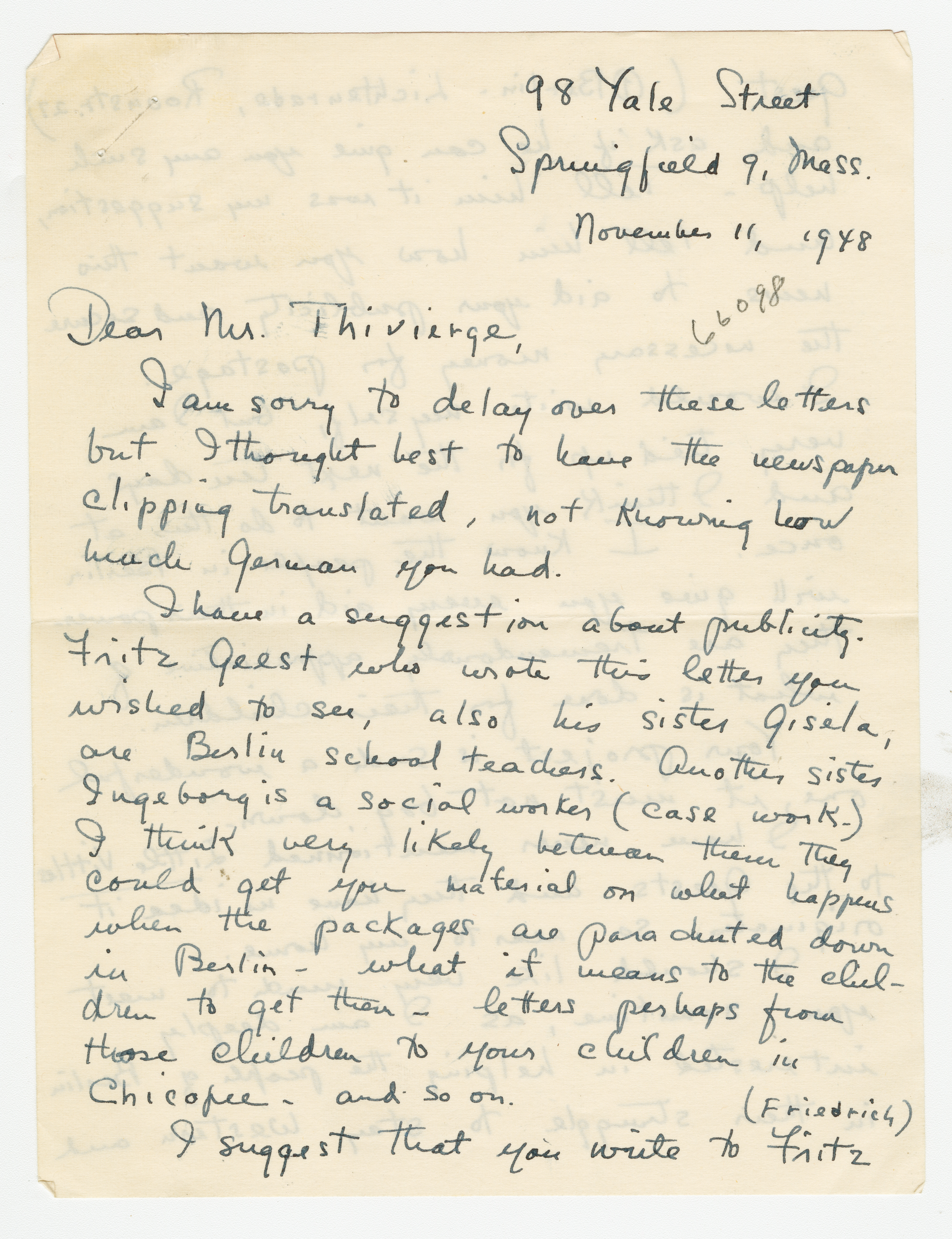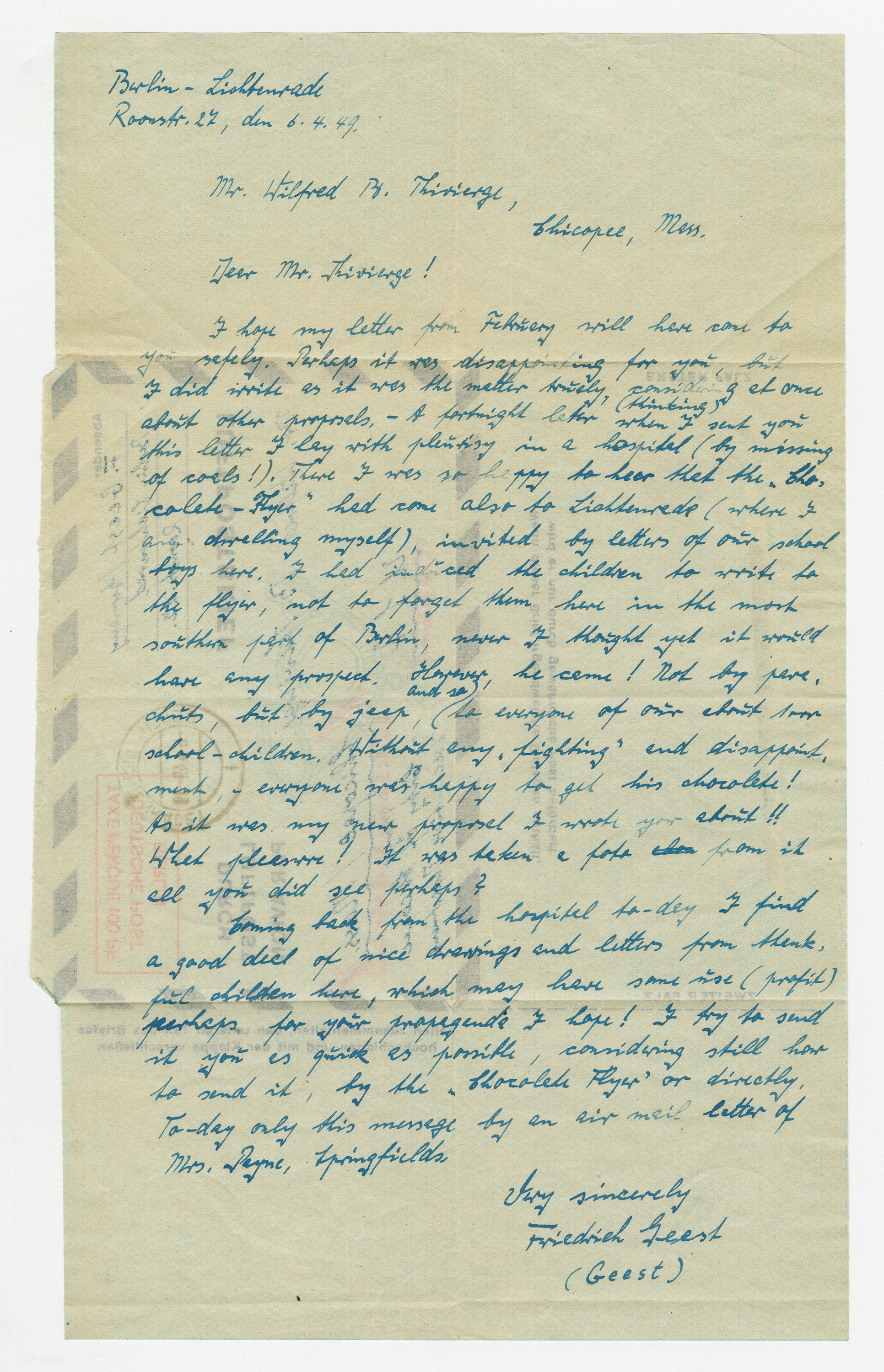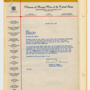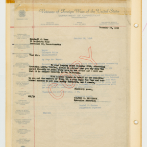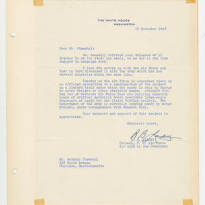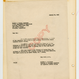 Operation Little Vittles was a goodwill mission to drop candy to German children during the Berlin Airlift of 1948-1949 and was headquartered in Chicopee, Massachusetts. This scrapbook is a record of the Operation Little Vittles Committee and provides information about the group of volunteers who were involved. The scrapbook contains official minutes of their meetings, the committee’s constitution and rules of operation, newspaper clippings, handwritten letters in German from children who received candy during the drops and a few photographs. The Little Vittles committee was responsible for coordinating and gathering candy and handkerchiefs to be delivered to Westover Air Force Base. From there the supplies were brought to Germany to be dropped to children in West Berlin.