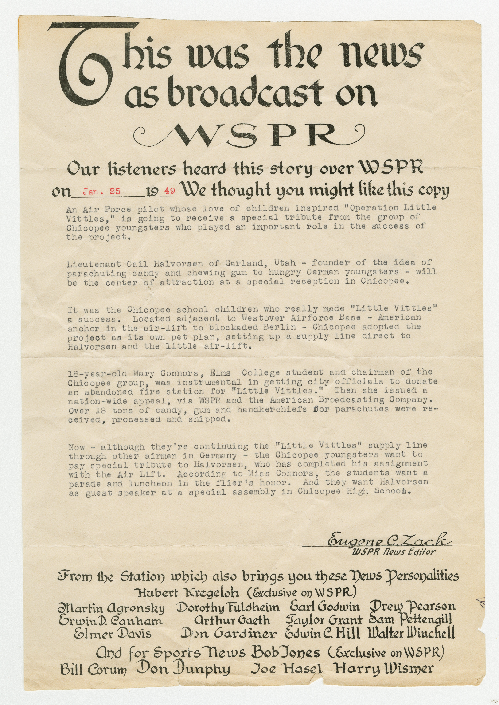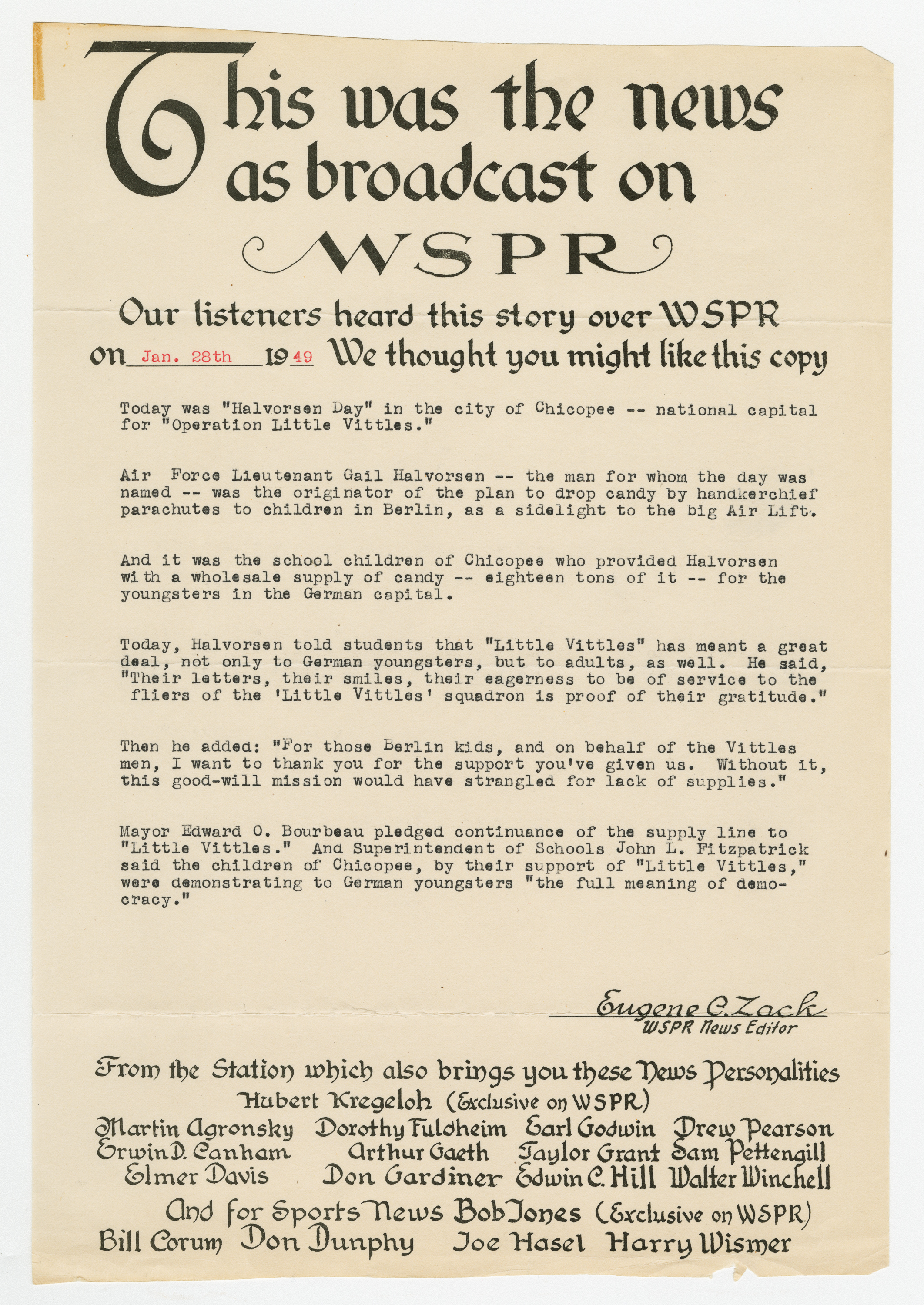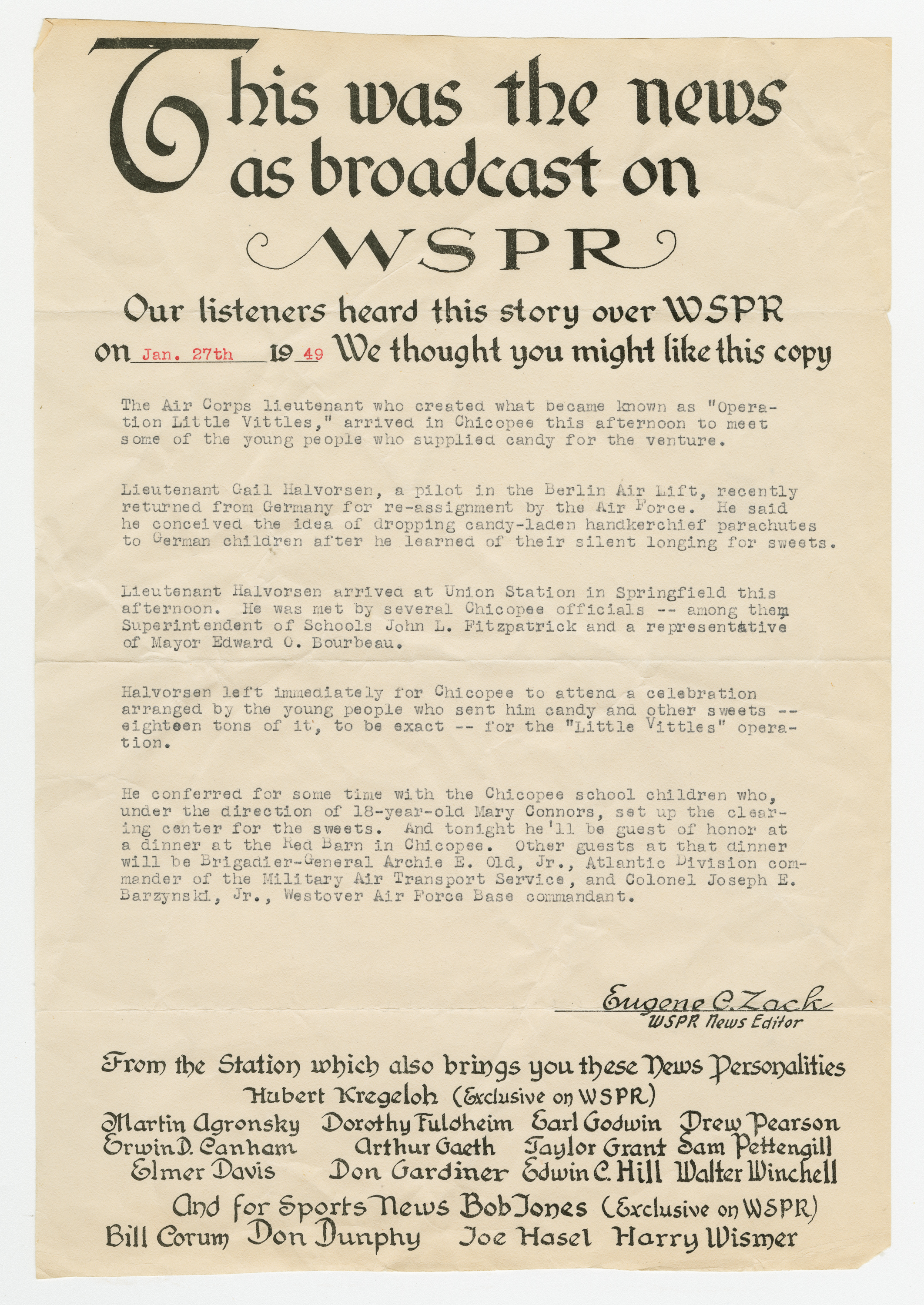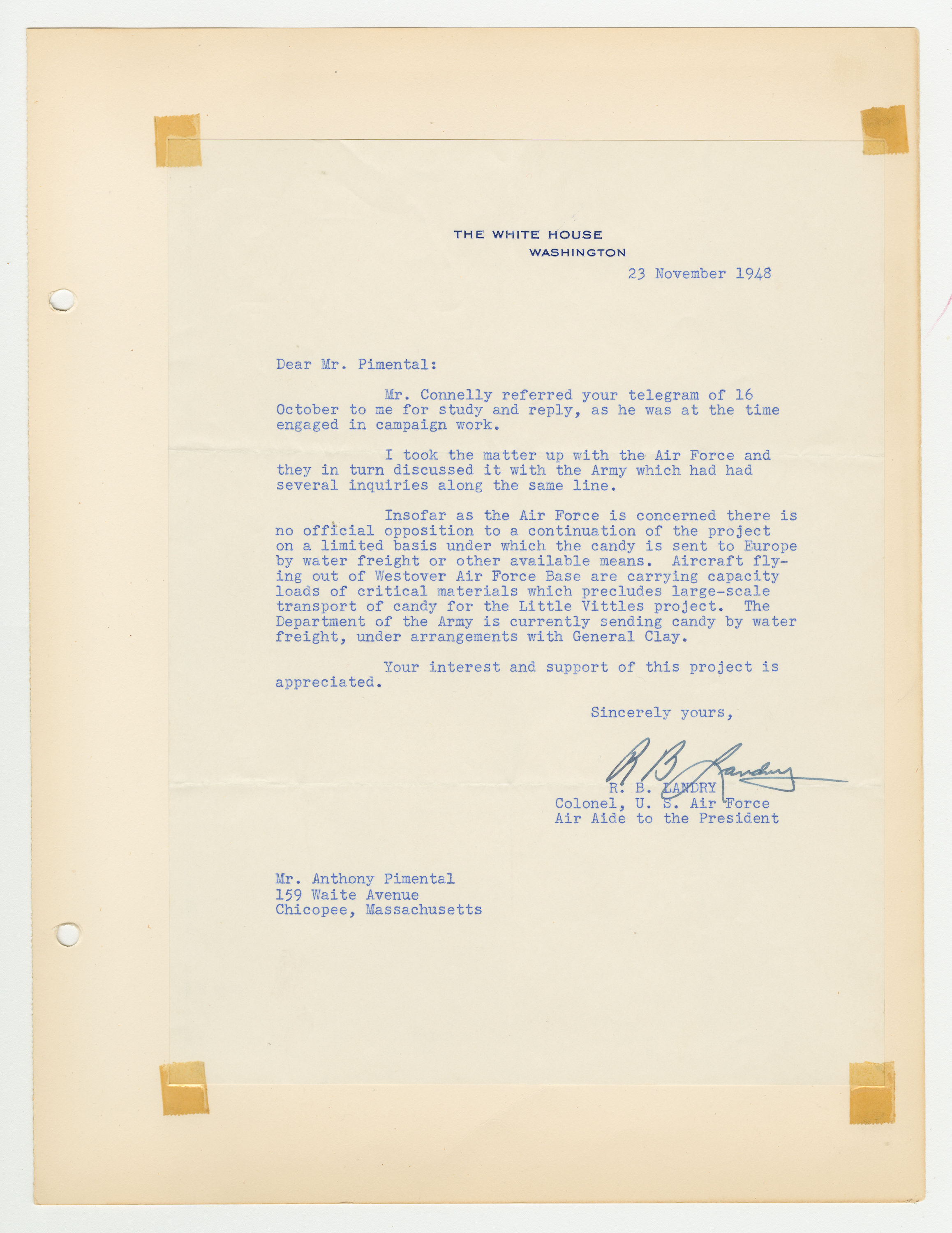 Operation Little Vittles came out of the Berlin Airlift, an operation by the United States and England that brought food to the people of West Berlin during the Soviet Blockade of Germany. Little Vittles was started by Air Force Pilot Gail S. Halvorsen after he handed out candy to a group of children and saw their reaction to his gesture. On the next flight he dropped candy tied to handkerchief parachutes. This grew to regular drops of candy by Halvorsen and his crew. As news spread of the operation in the United States the Little Vittles Committee was formed to handle the volume of candy and handkerchief donations as well as bring the supplies to the air force base in Chicopee.
