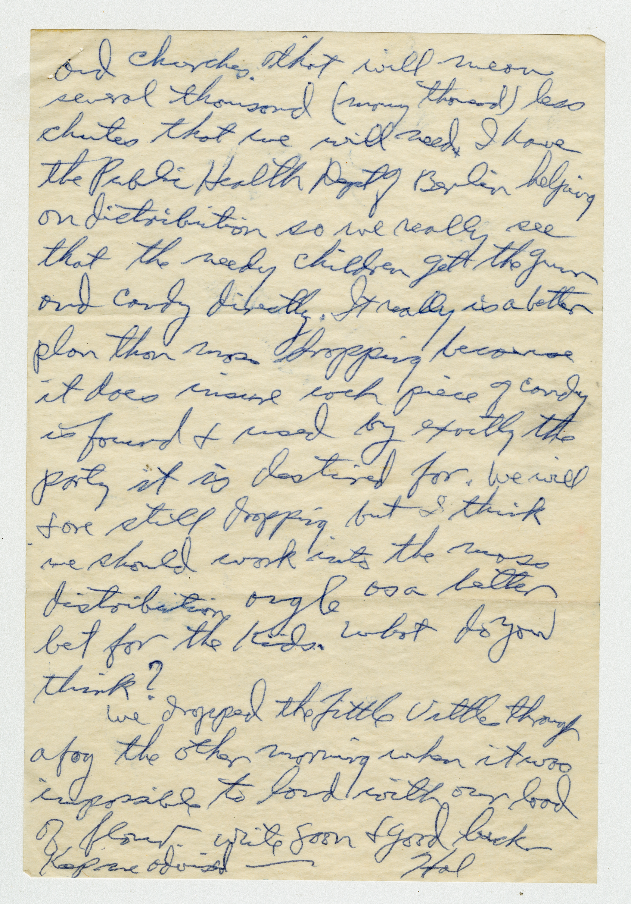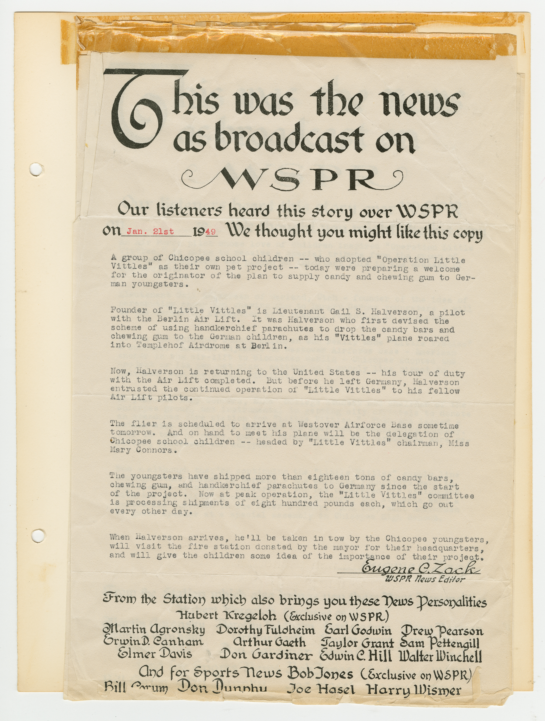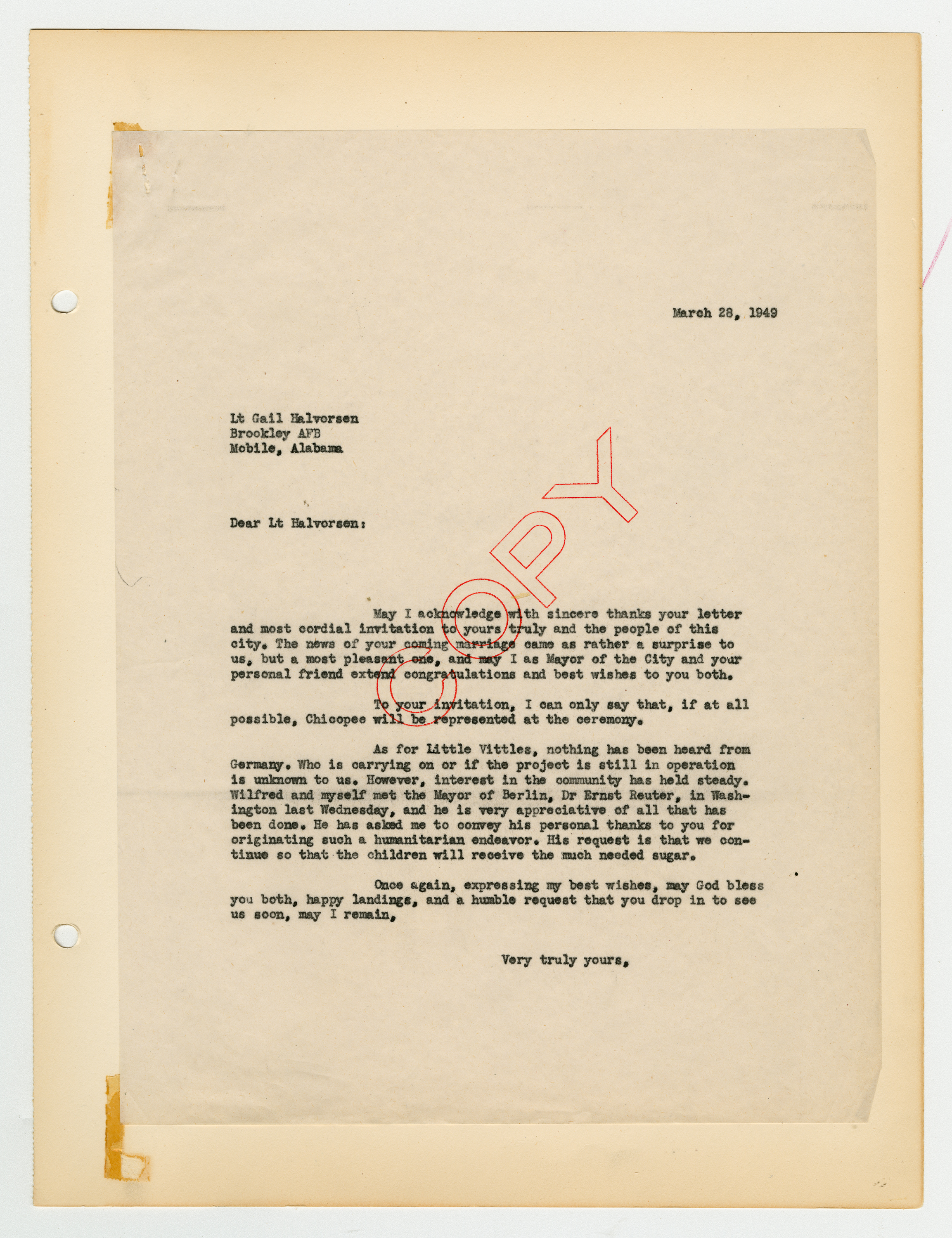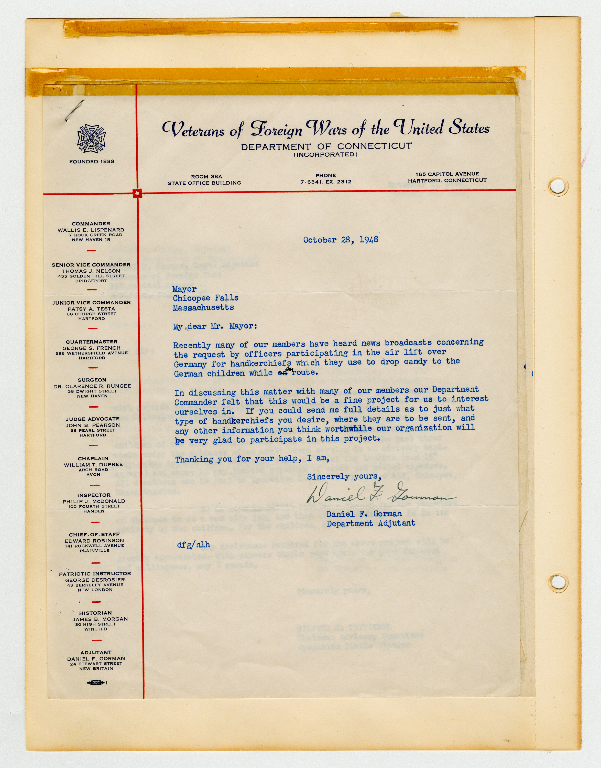 Operation Little Vittles came out of the Berlin Airlift, an operation by the United States and England that brought food to the people of West Berlin during the Soviet Blockade of Germany. Little Vittles was started by Air Force Pilot Gail S. Halvorsen after he handed out candy to a group of children and saw their reaction to his gesture. On the next flight he dropped candy tied to handkerchief parachutes. This grew to regular drops of candy by Halvorsen and his crew. As news spread of the operation in the United States the Little Vittles Committee was formed to handle the volume of candy and handkerchief donations as well as bring the supplies to the air force base in Chicopee.