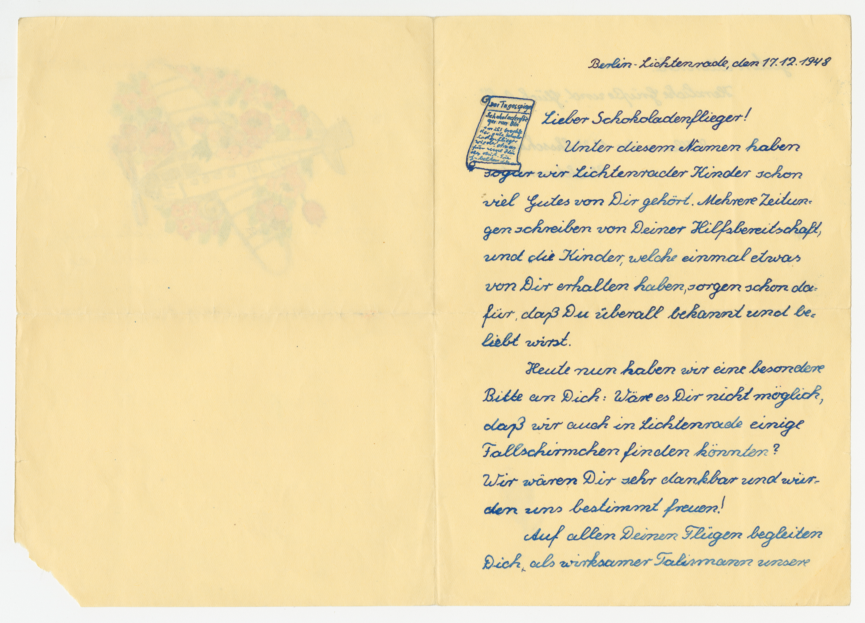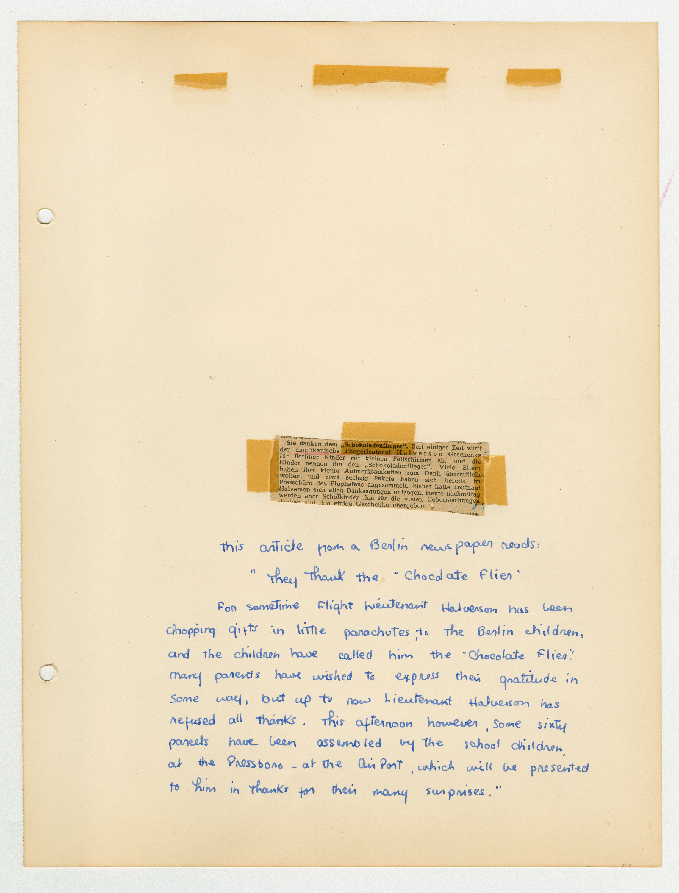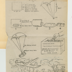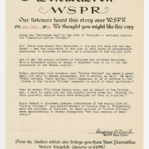 85 pages with a few photographs and several newspaper articles about Operation Little Vittles. There are also several letters from officials in the United States, adults and children in Germany and illustrations of the drops by recipients.