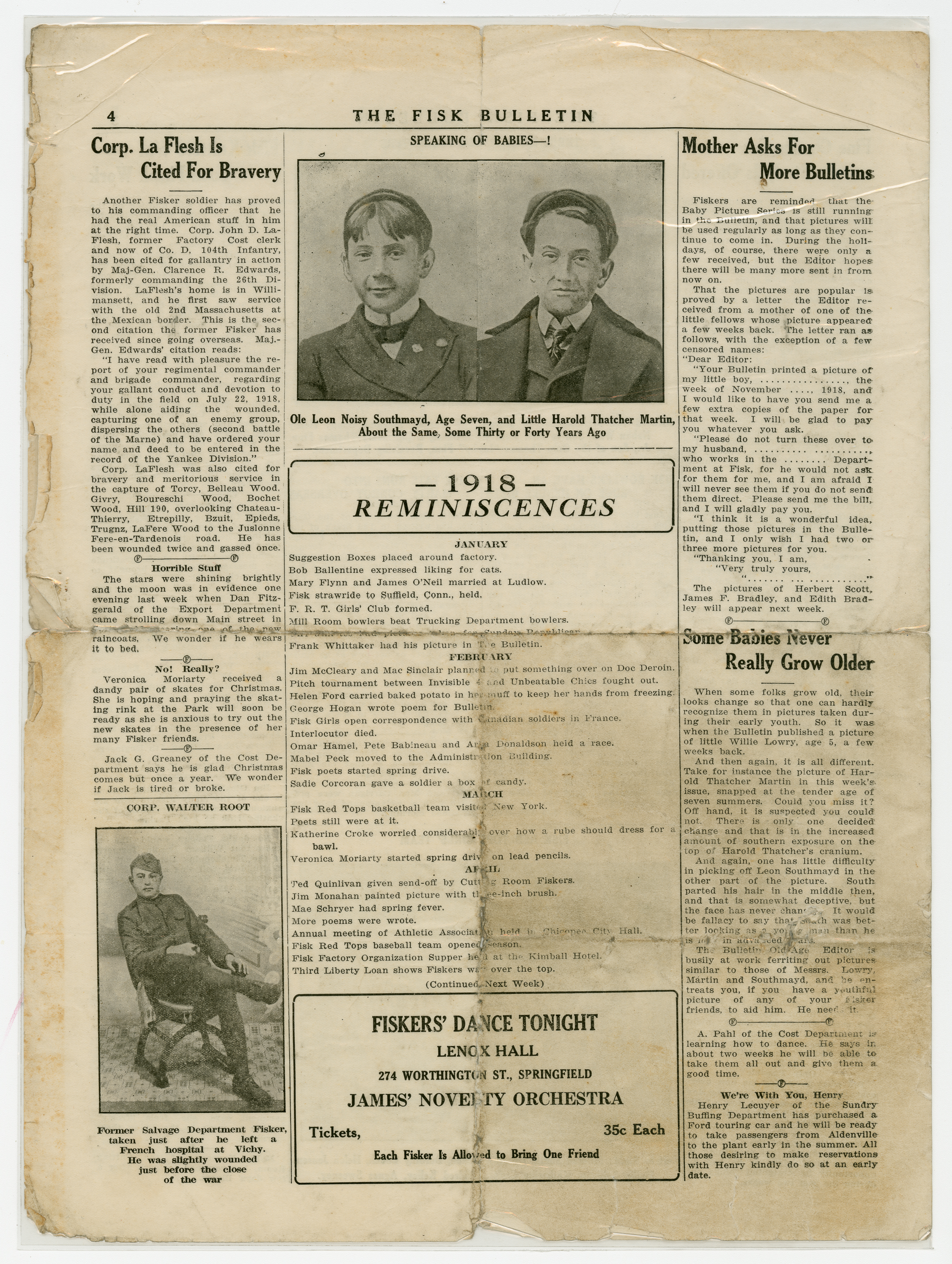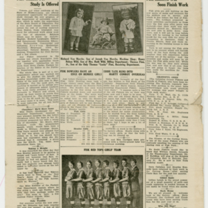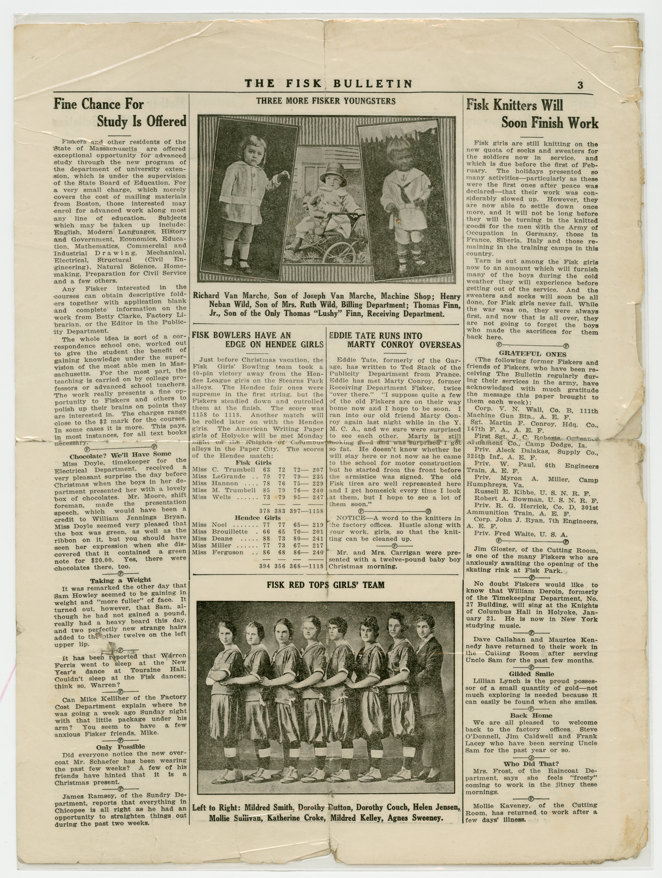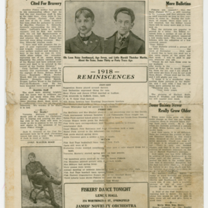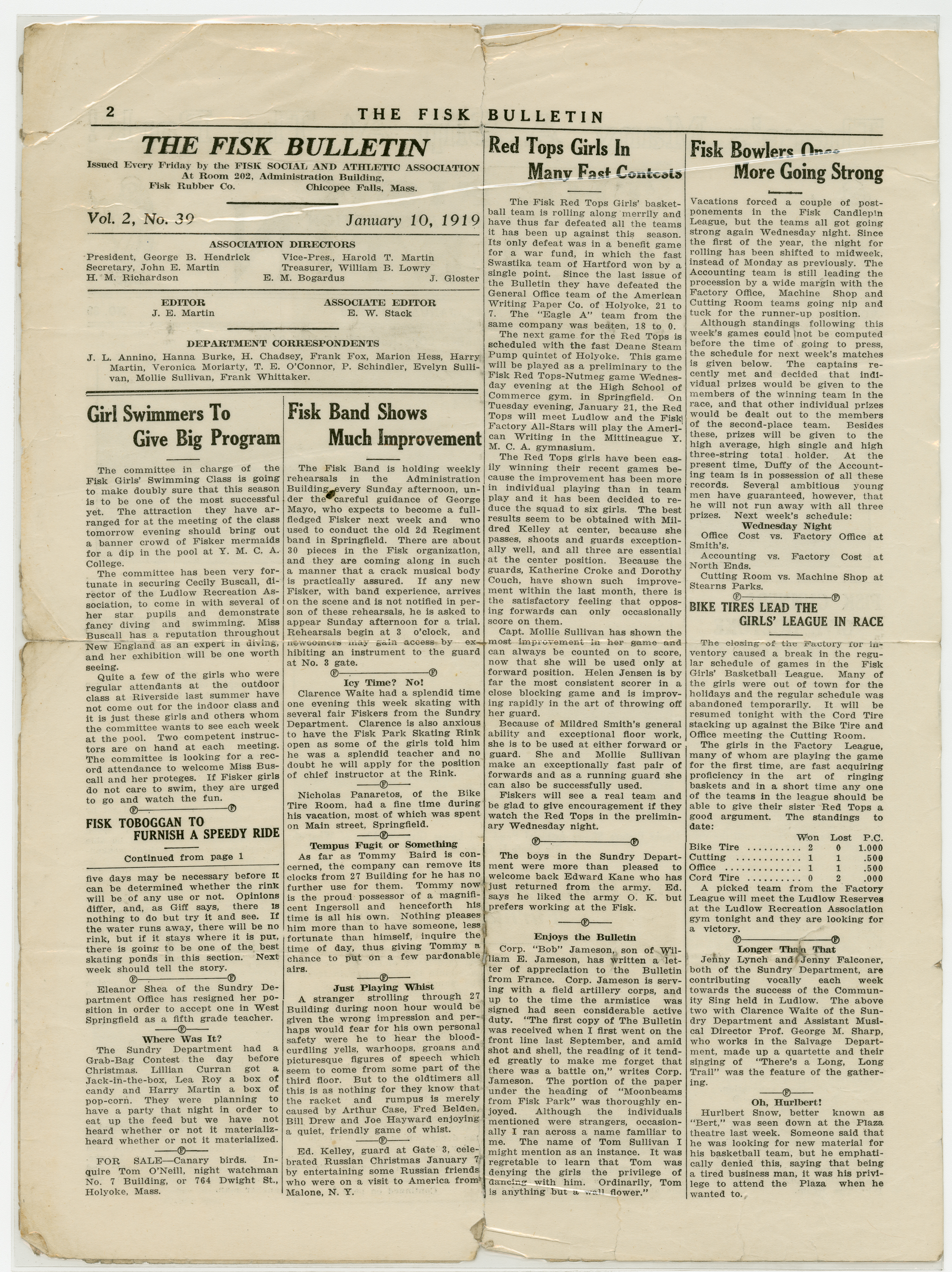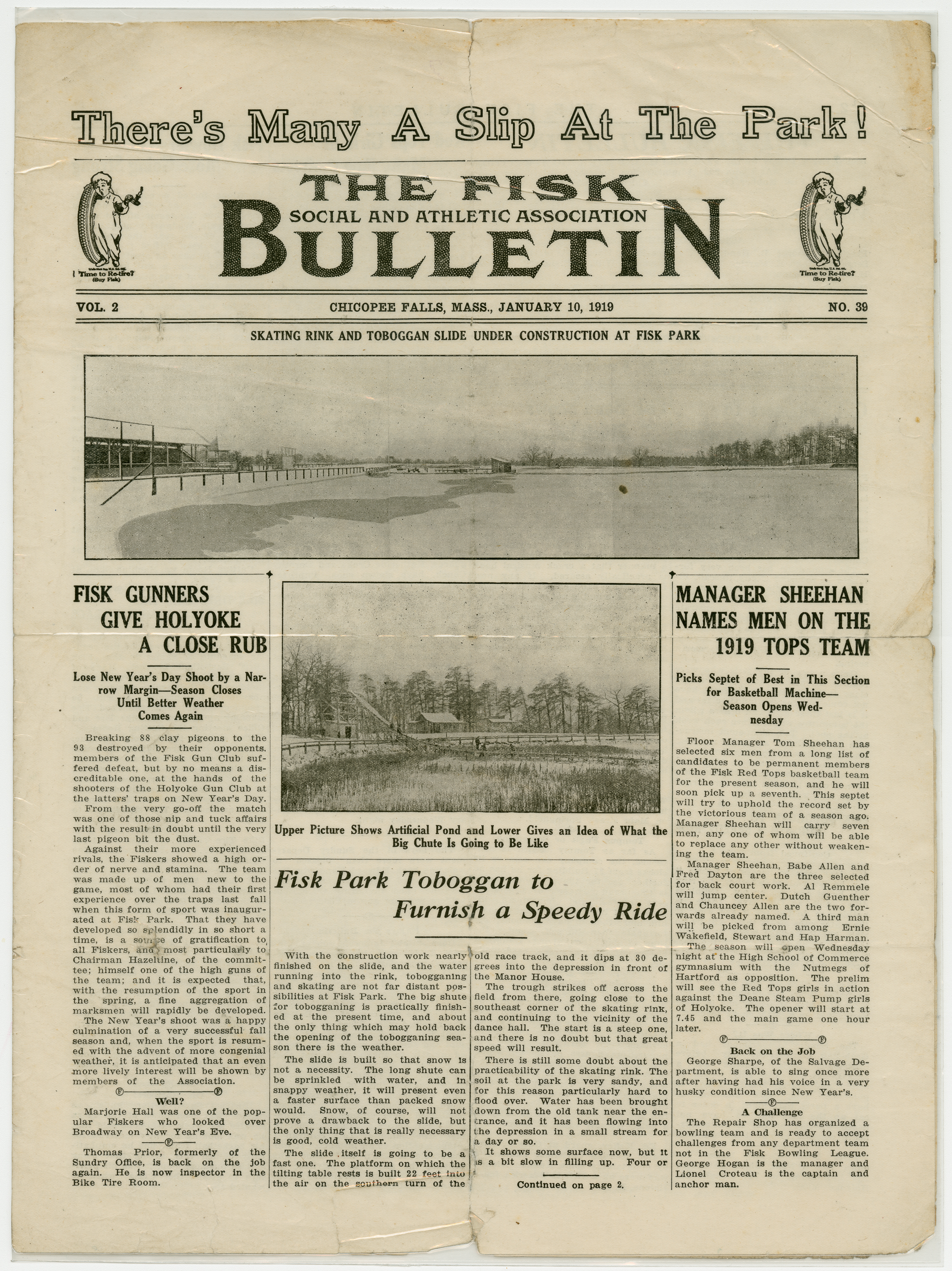 A four page newspaper describing the events related to the social groups and athletic clubs of the Fisk Tire Company for the week of January 10, 1919. Page one highlights include two photographs showing the progress of the construction of the Fisk Park skating rink and toboggan slide, with story. The 1919 Fisk Red Tops Men's Basketball team is the subject of one story and the shooting club loss to Holyoke rounds out the coverage. Page two and three are filled with tidbits about Fisk employees and their doings. The "Young Fiskers" photograph column appears again. Also, a short story about the Fisk knitters continuing to knit socks for the Army of Occupation and others stationed overseas and in the service. Page four includes a story about the experiences of John LaFlesh during his time fighting on the front lines in France in 1918. A column on some of the 1918 reminiscences and an announcement for the Fisker's Dance (tickets 35 cents) are given space on the page.