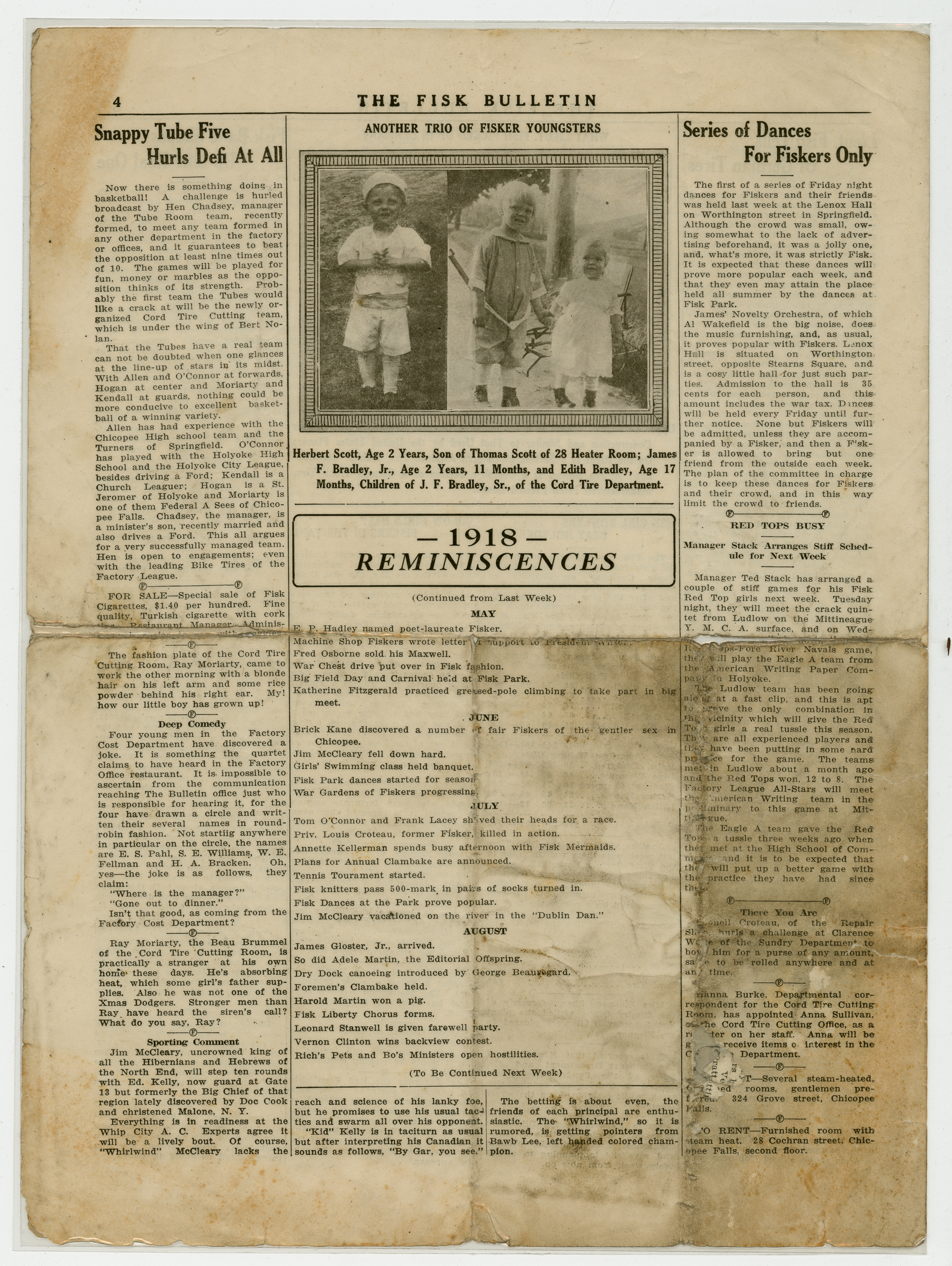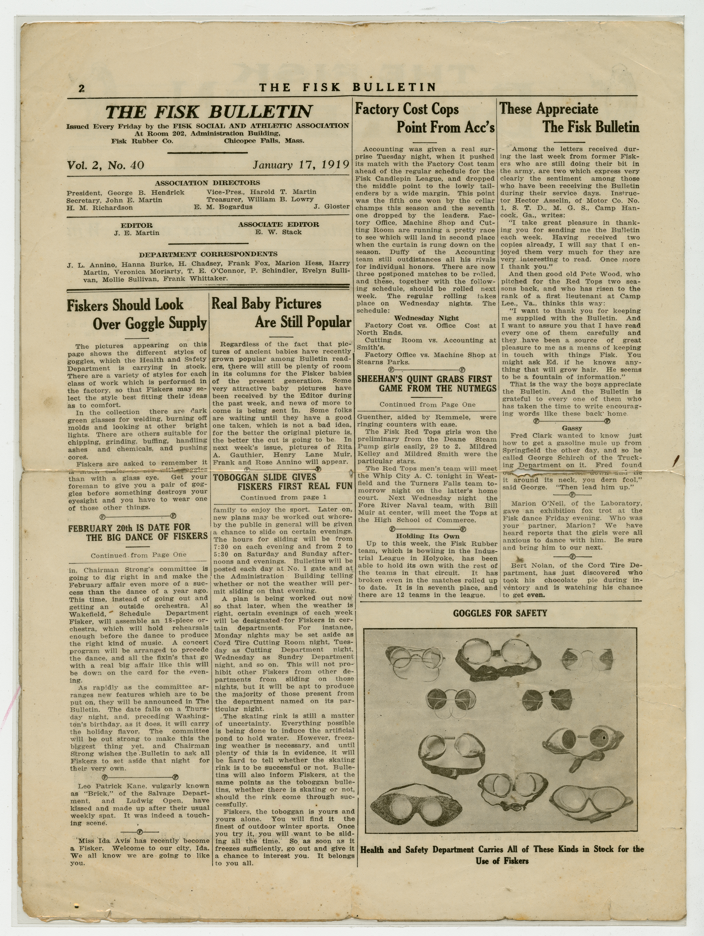 A four page newspaper describing the events related to the social groups and athletic clubs of the Fisk Tire Company for the week of January 17, 1919. Included in the page one coverage is a story and photographs of the company toboggan slide's first day, details of the "Dance of the Fiskers" and the first game of the company basketball team. Page two is dedicated to stories about safety and page three is general coverage of other clubs and employees. Page four includes photographs of Fisk employee children and additional stories of club and team achievements.