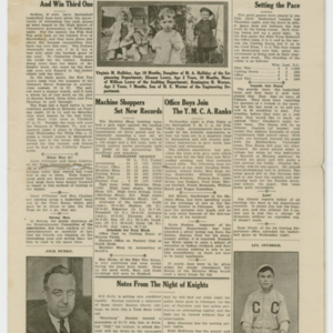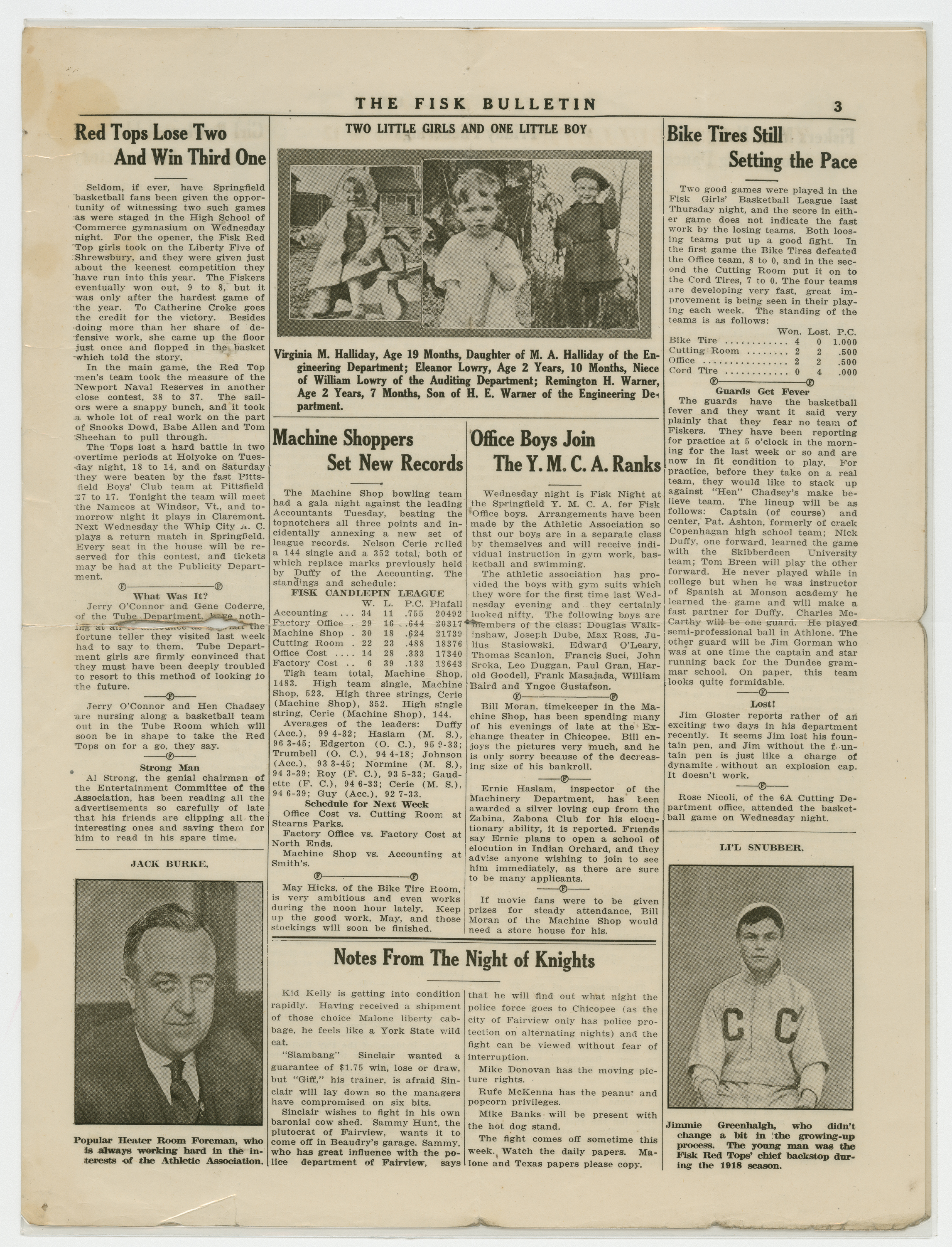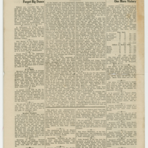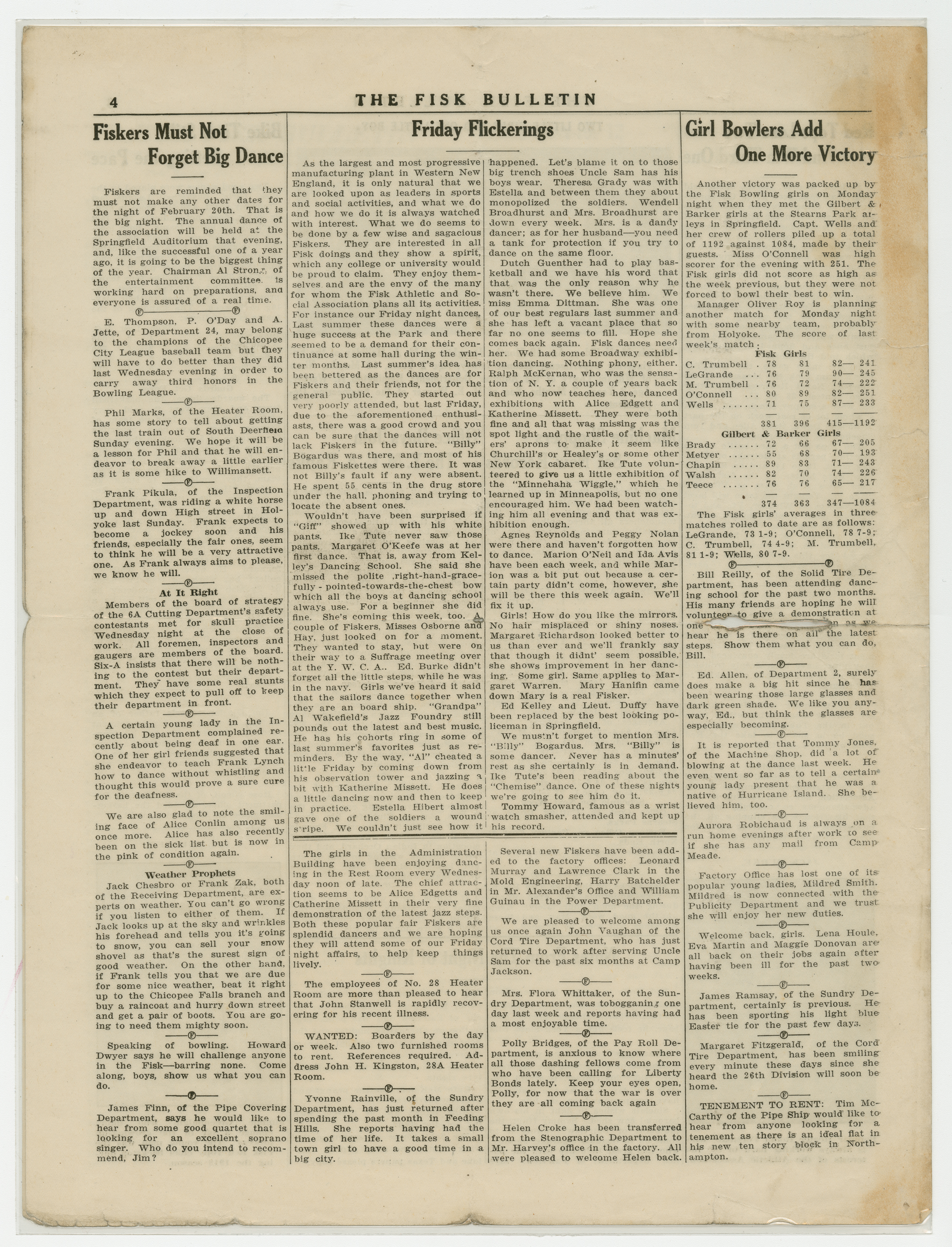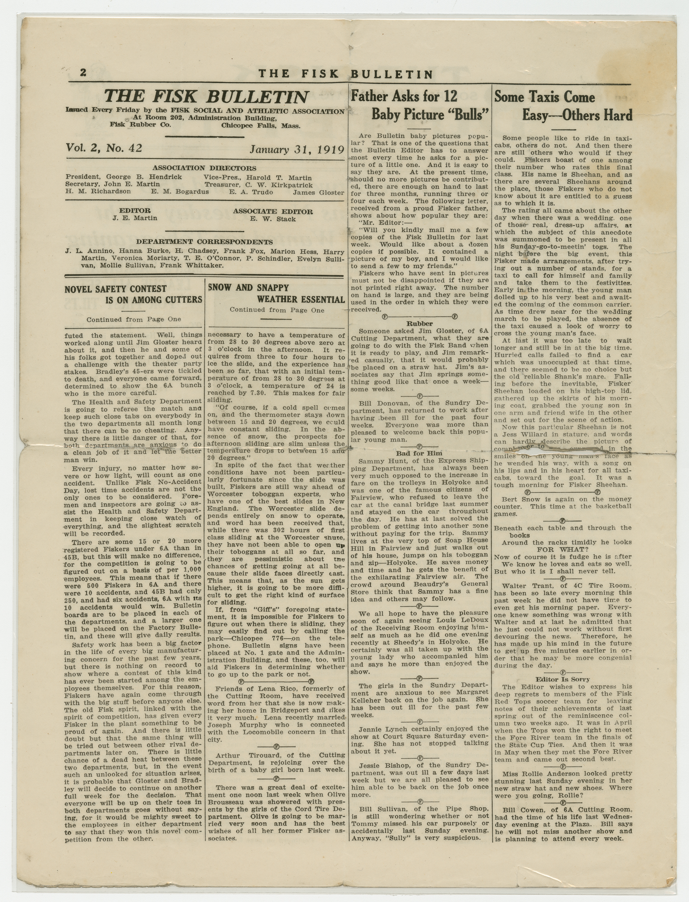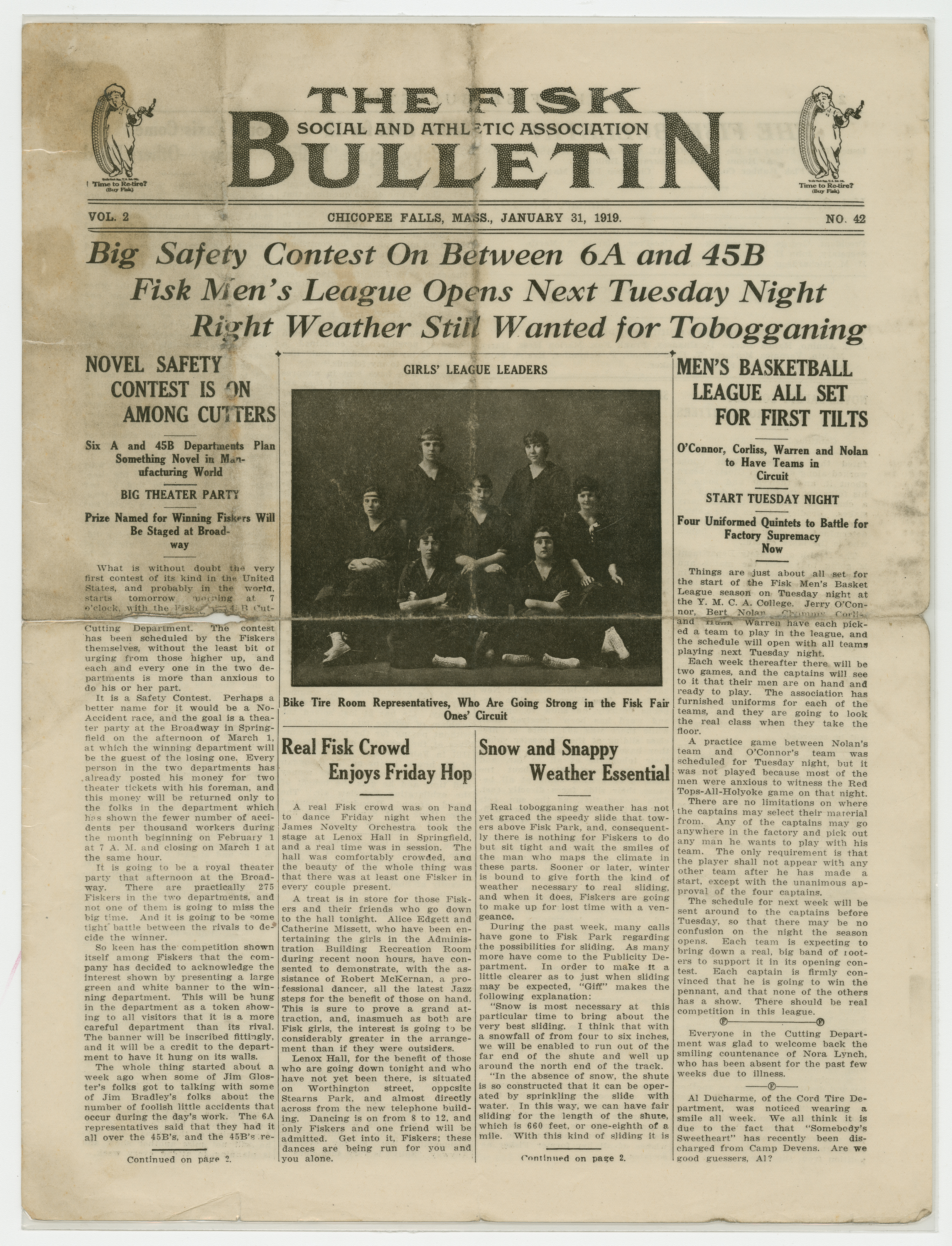 A four page newspaper describing the events related to the social groups and athletic clubs of the Fisk Tire Company for the week of January 31, 1919. "Big Safety Contest On Between 6A and 45B," "Fisk Men's League Opens Next Tuesday Night" and "Right Weather Still Wanted for Tobogganing" are the top headlines for page one of this week's edition of the Bulletin. Page two is for the page one jumps and other employee announcements and news. Page three stories include news of the Fisk basketball team, the bowling team and inter-company women's basketball league. Employee notices and a reminder about the upcoming "big dance" round out page four.