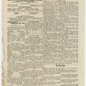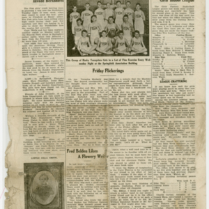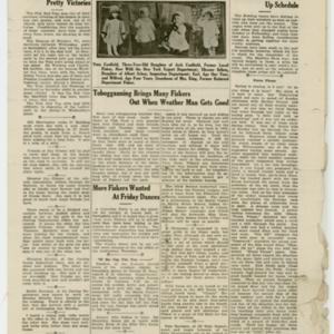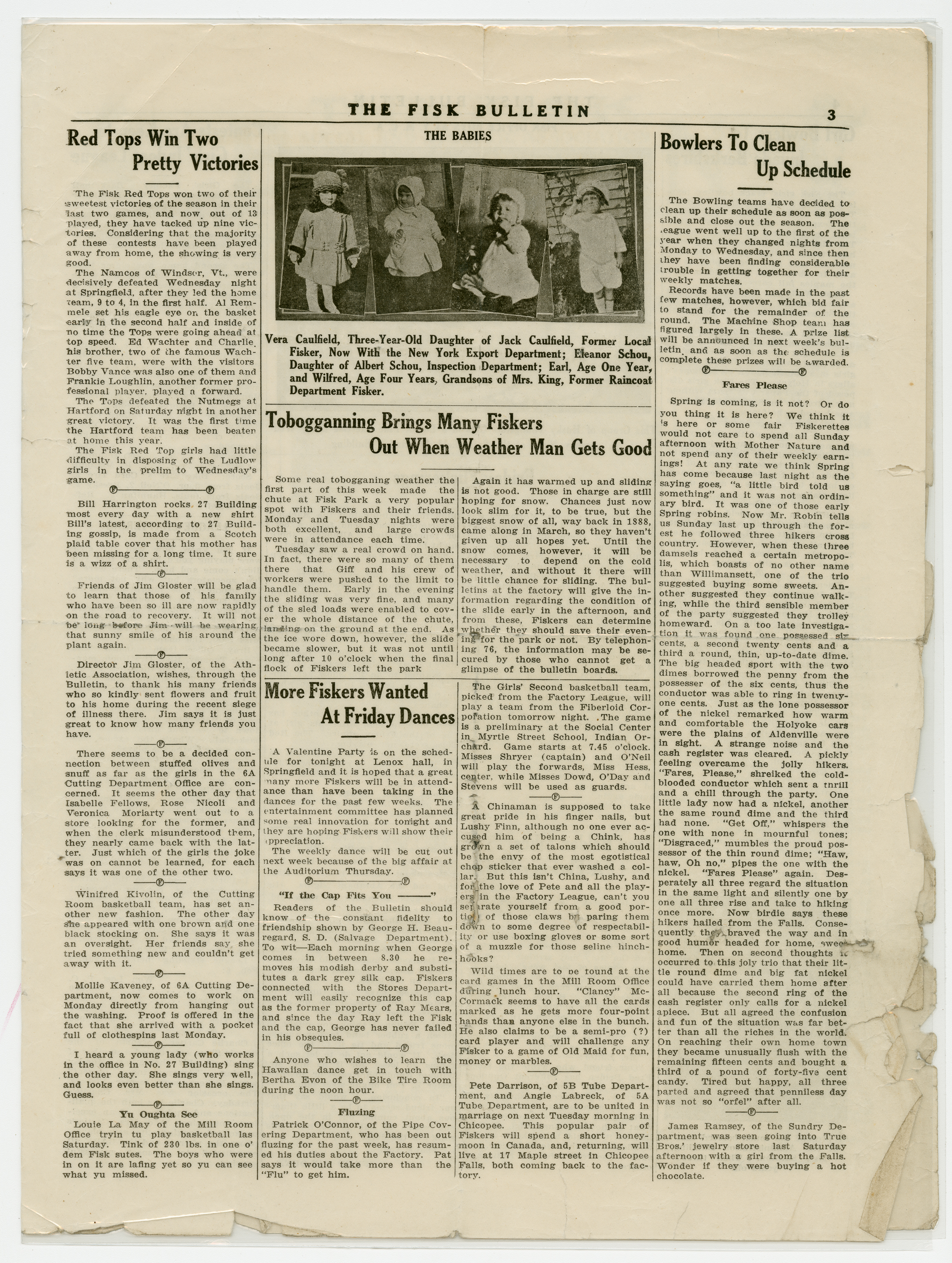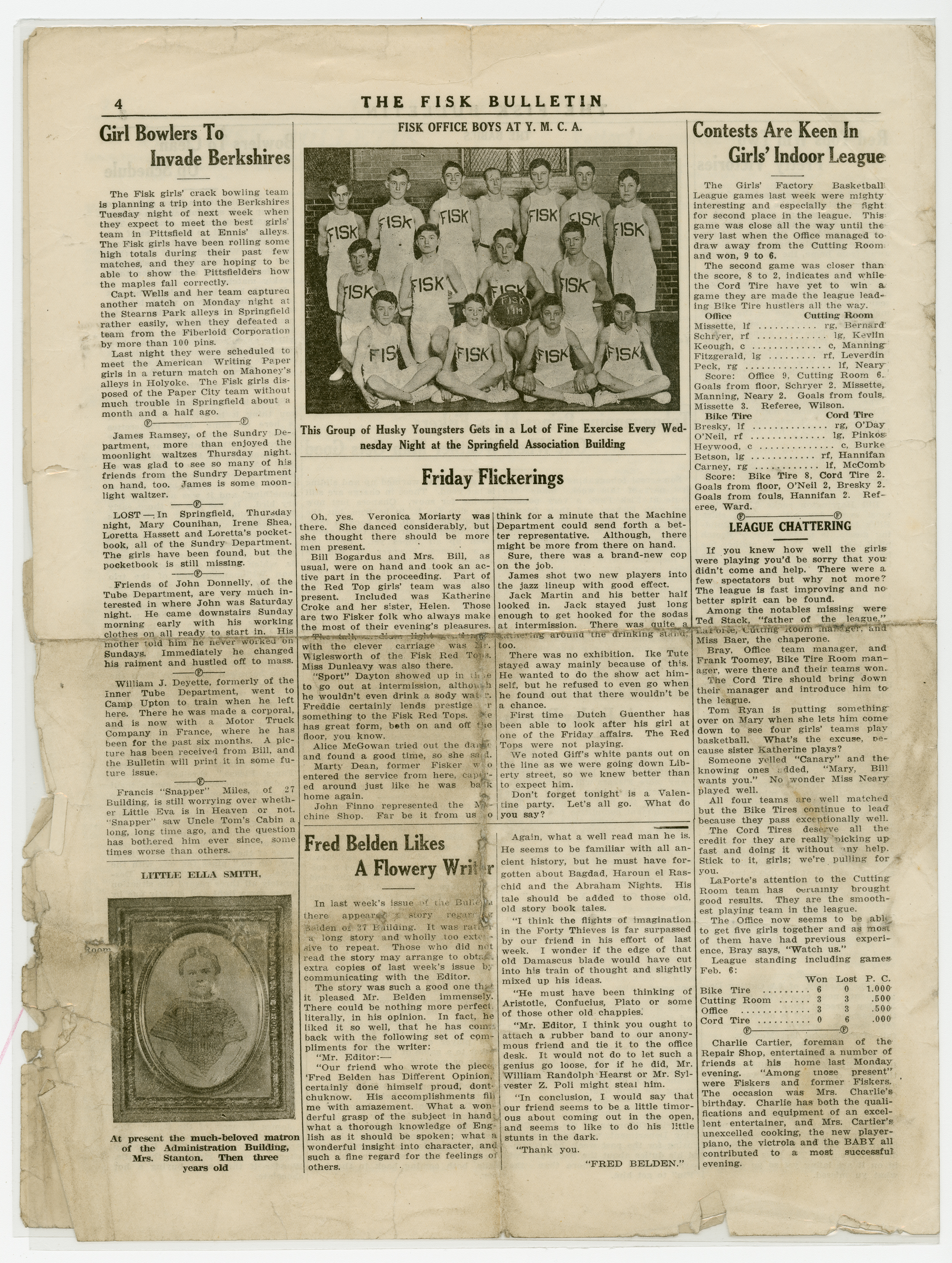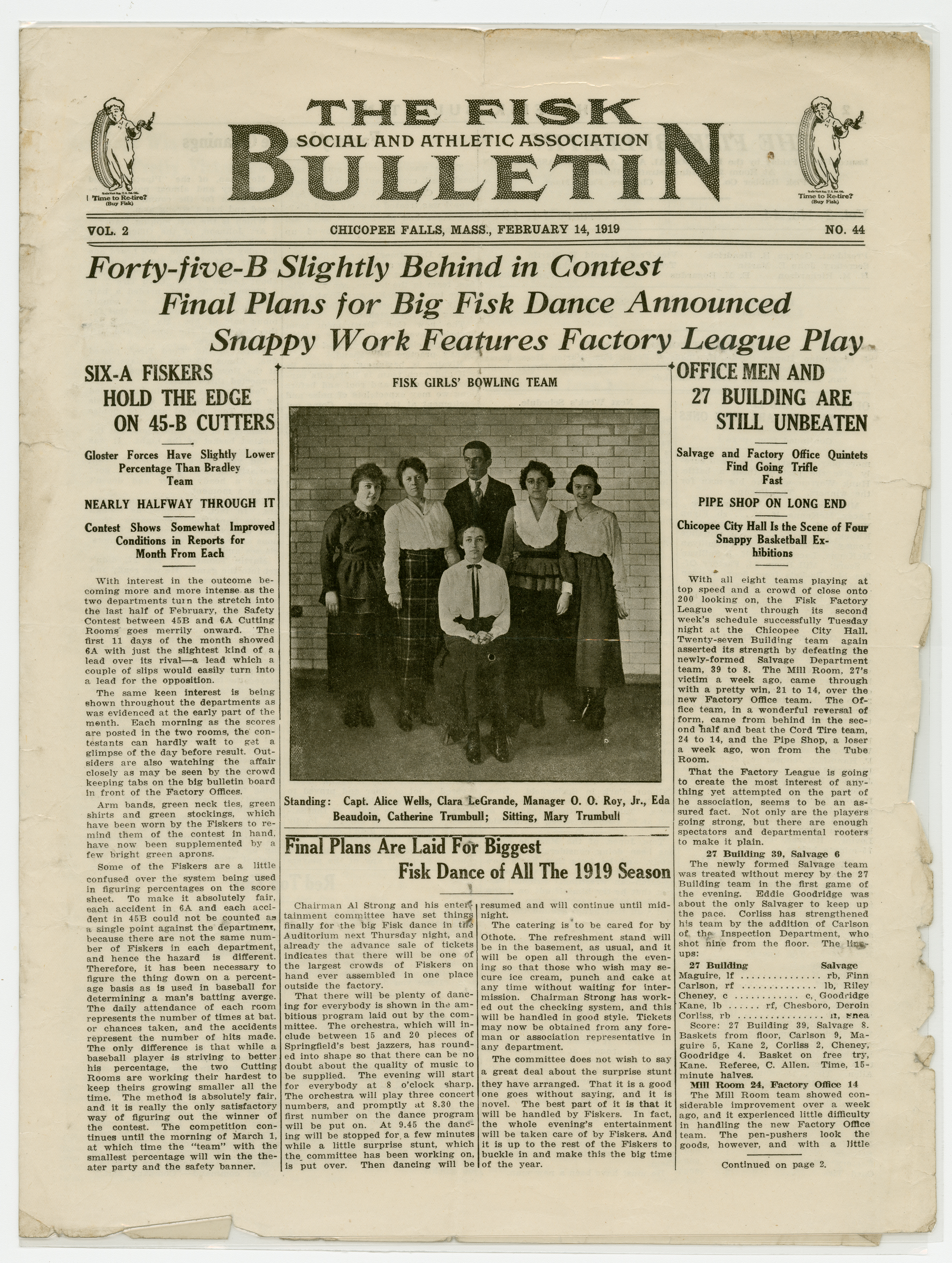 A four page newspaper describing the events related to the social groups and athletic clubs of the Fisk Tire Company for the week of February 14, 1919. The Page One photograph is of the Fisk Women's Bowling team. Headlines include "Six-A Fiskers Hold Edge on 45-B Cutters" and "Office Men and 27 Building Are Still Unbeaten." Also on the page is a story on the final planning of the "biggest Fisk Dance of all the 1919 season." Page two has a long roundup on the factory league and its many teams, page one jumps and employee notes. Page three highlights a Red Tops basketball team victory, more employee notes, the bowling team schedule and a tobogganing weather update. Page four has the social news column "Friday Flickerings" and two stories on the women's bowling teams.