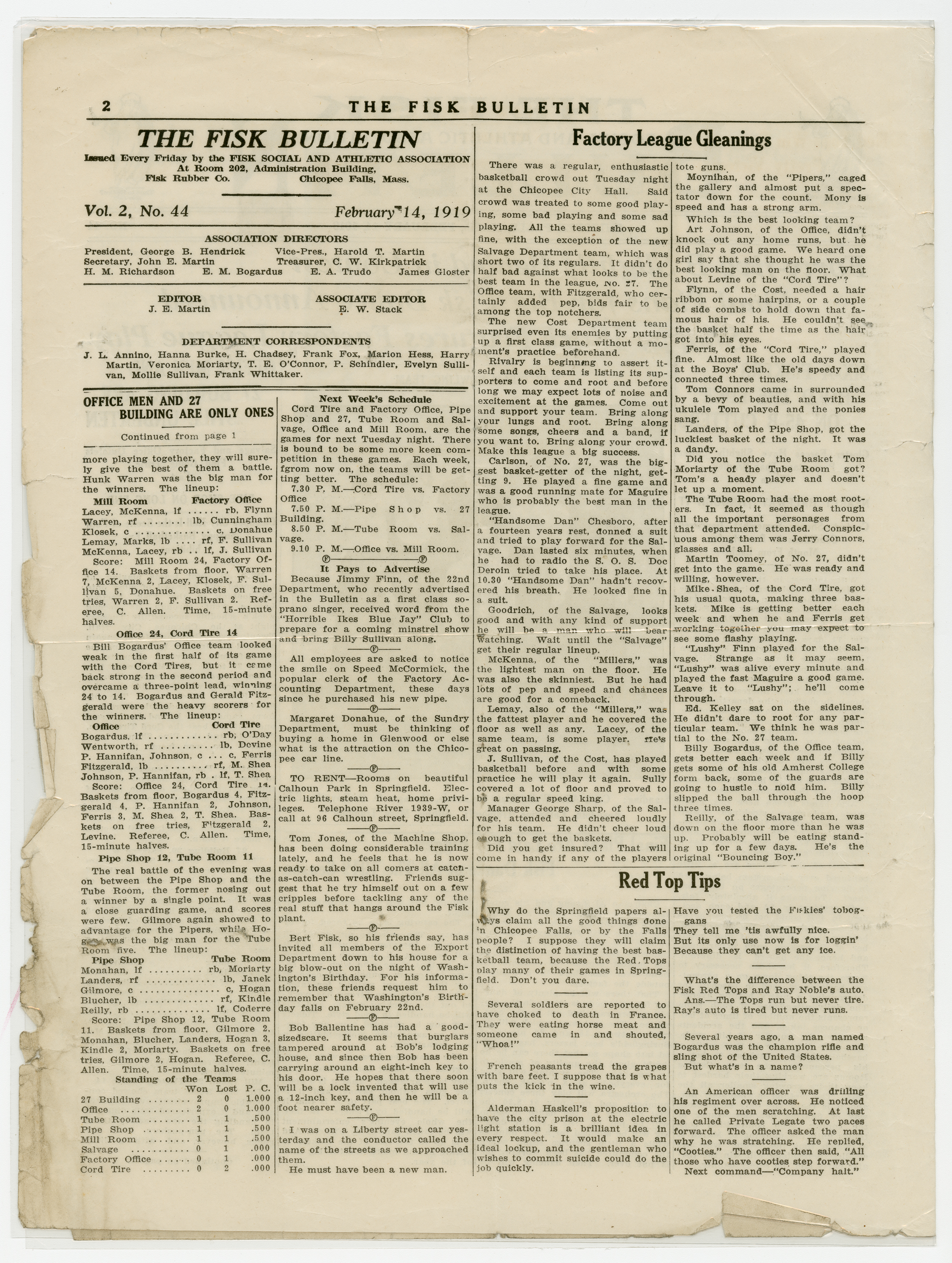 The Fisk Tire Company's Social and Athletic Association events and happenings for the week of February 14, 1919.