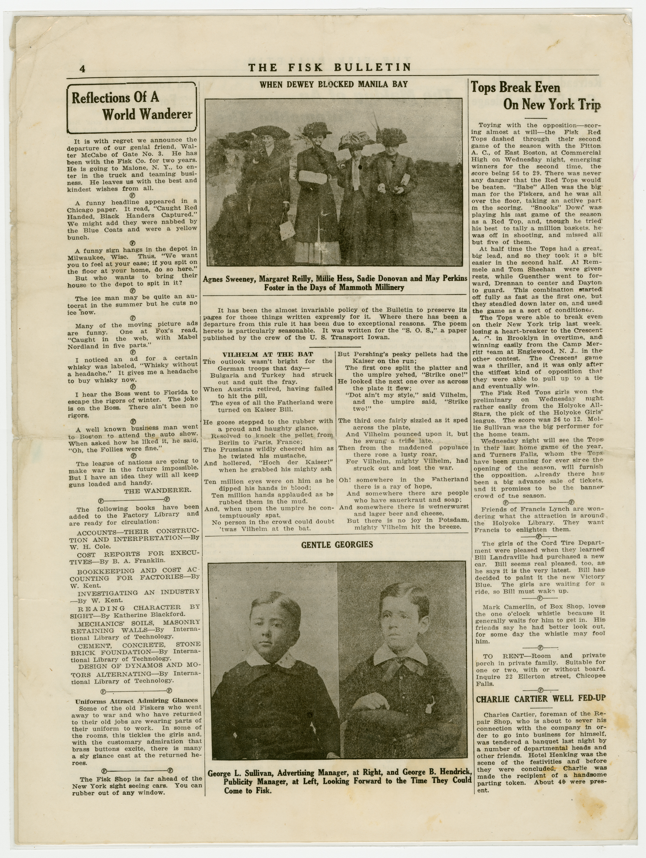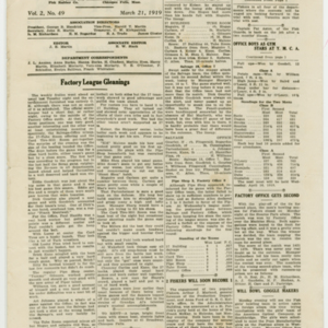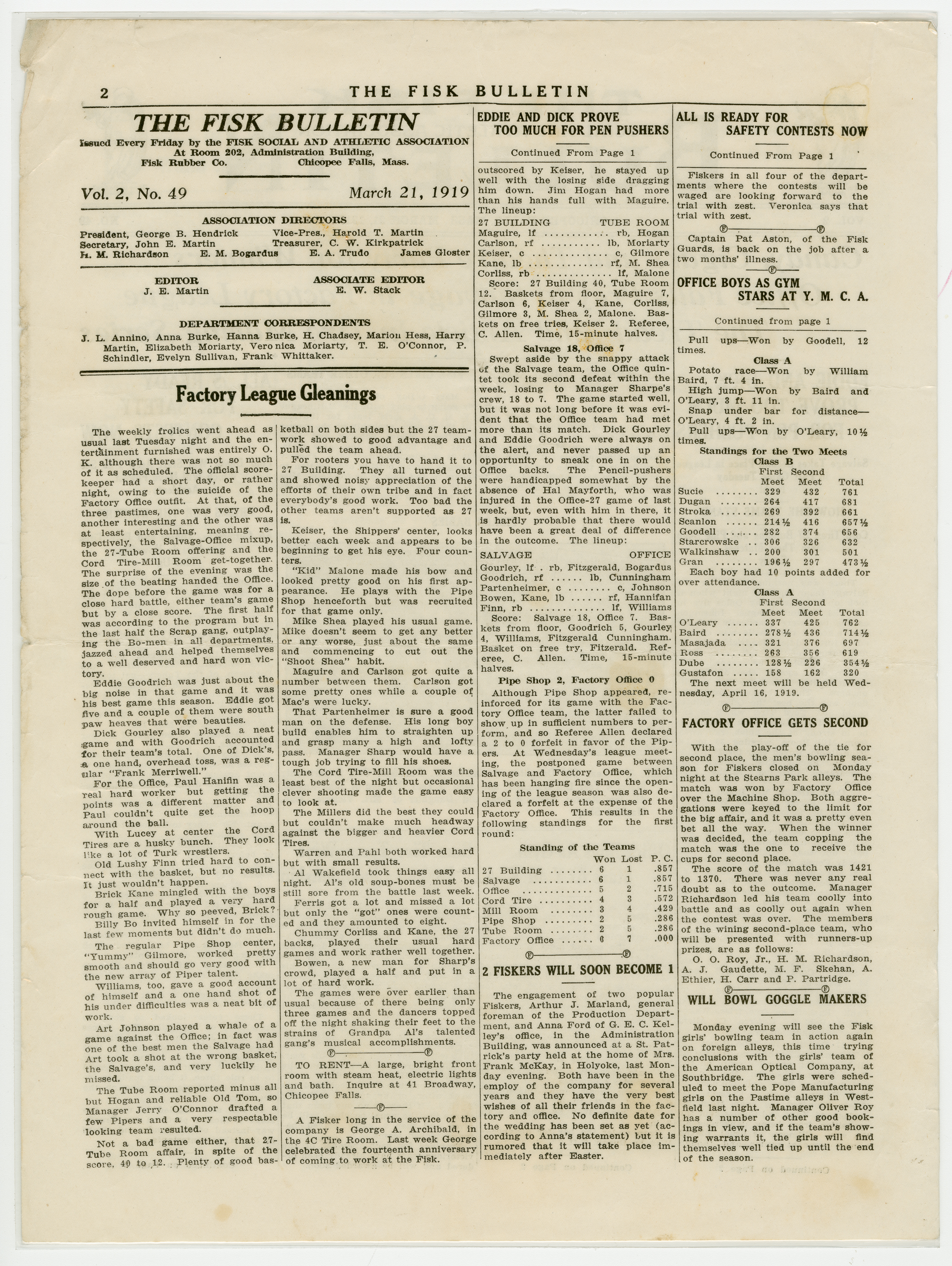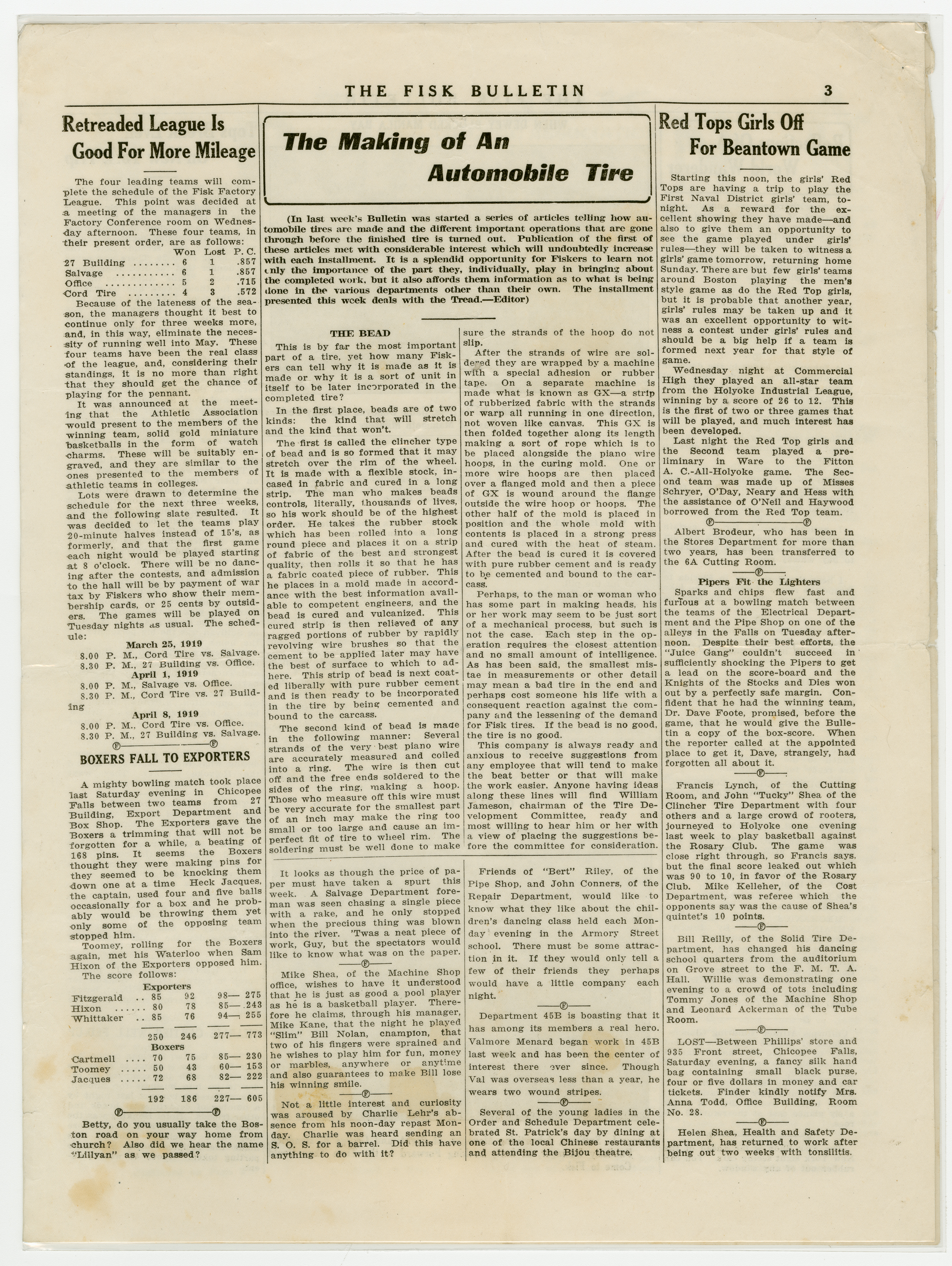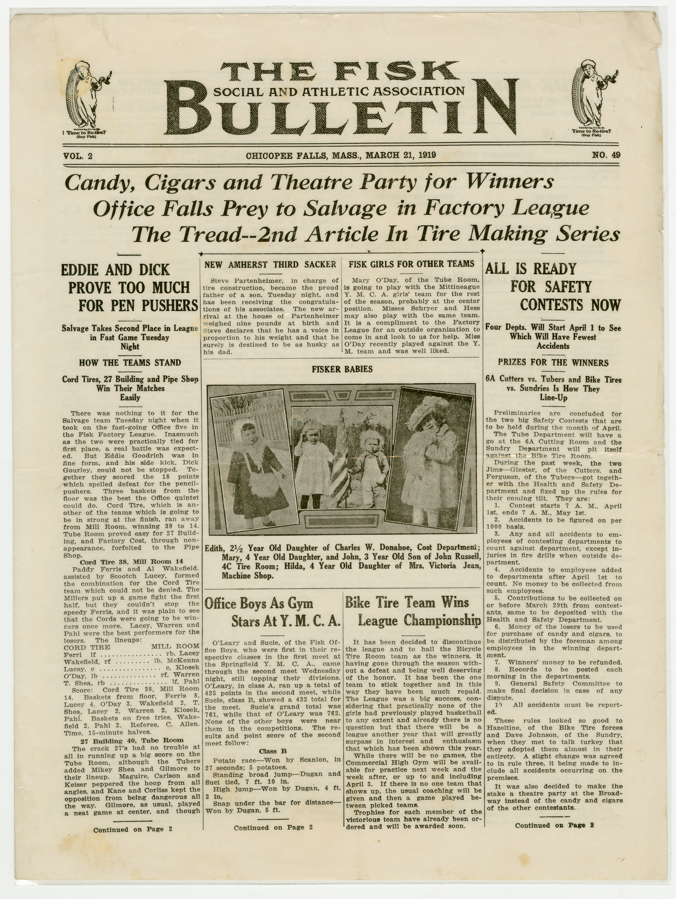 A four page newspaper describing the events related to the social groups and athletic clubs of the Fisk Tire Company for the week of March 21, 1919. Interfactory League play dominates the front page with the Salvage team, 27 Building and Cord Tire all winning their games. Fisker Babies is the art for page one and the Bike Tire women's basketball team winning its league championship gets coverage. Factory League Gleanings and page one jumps are on page two. The Making of an Automobile Tire column covers 'The Bead" on page three. Page four is a mash-up of employee notes and photographs.