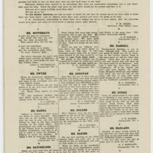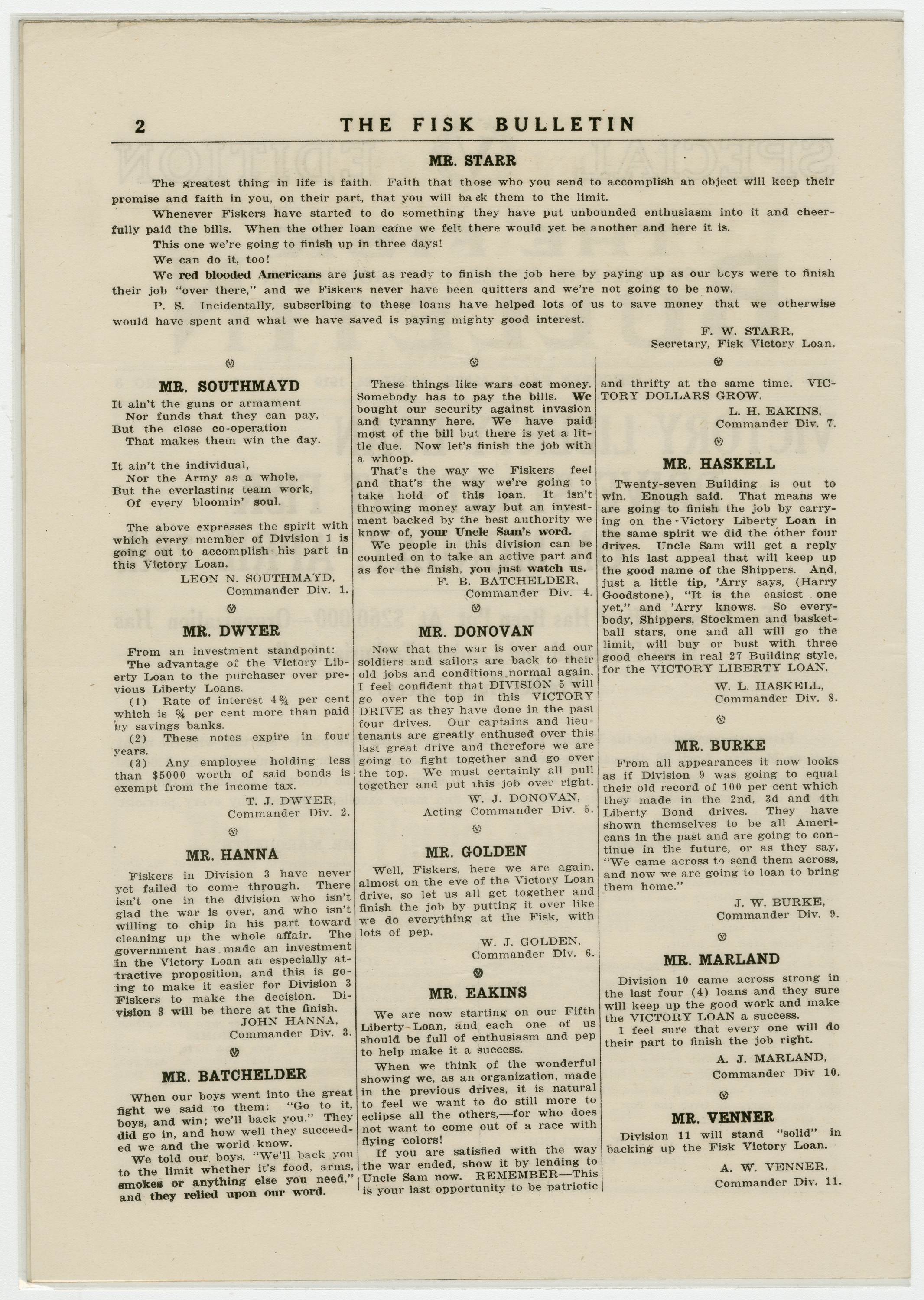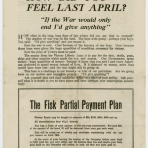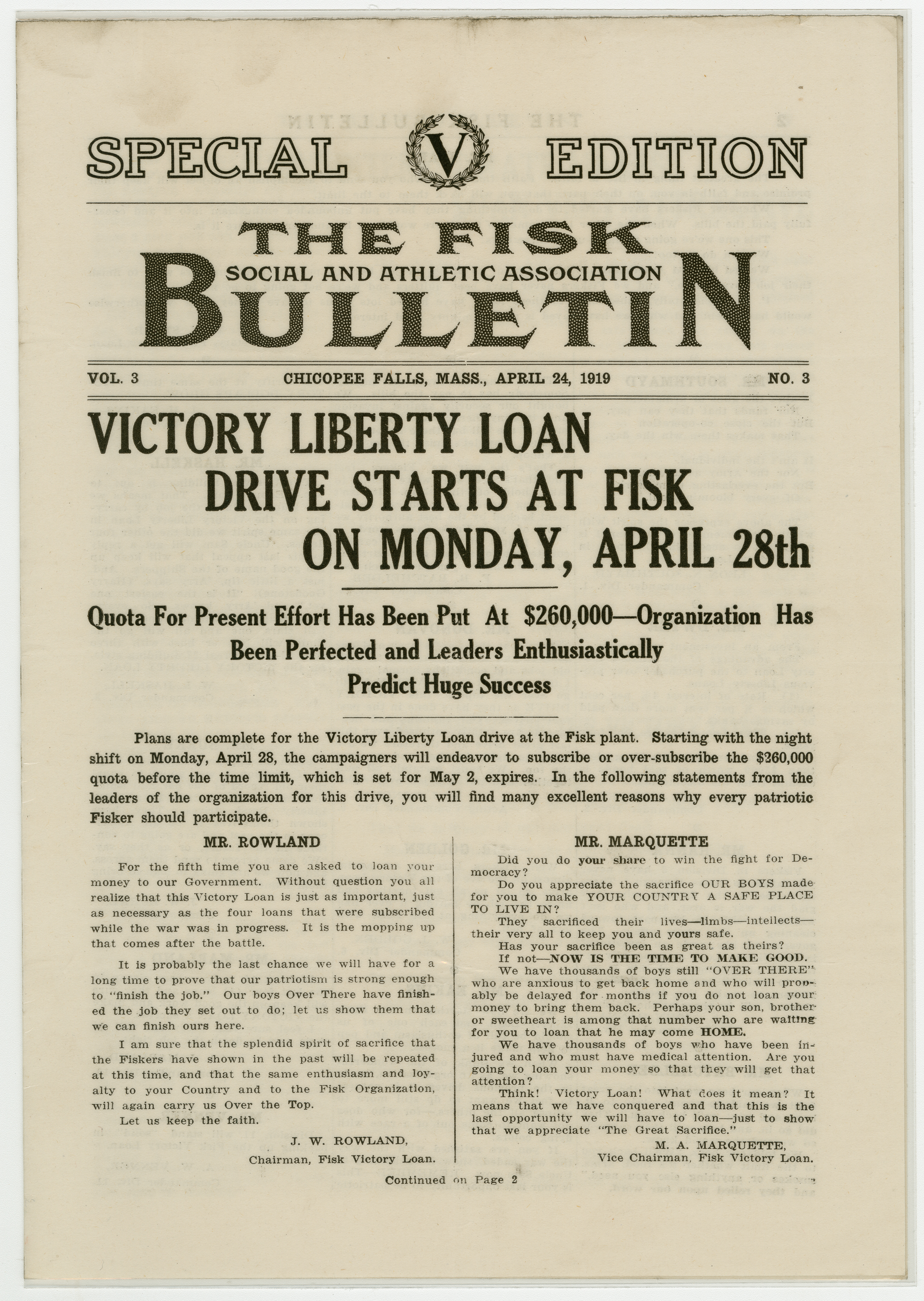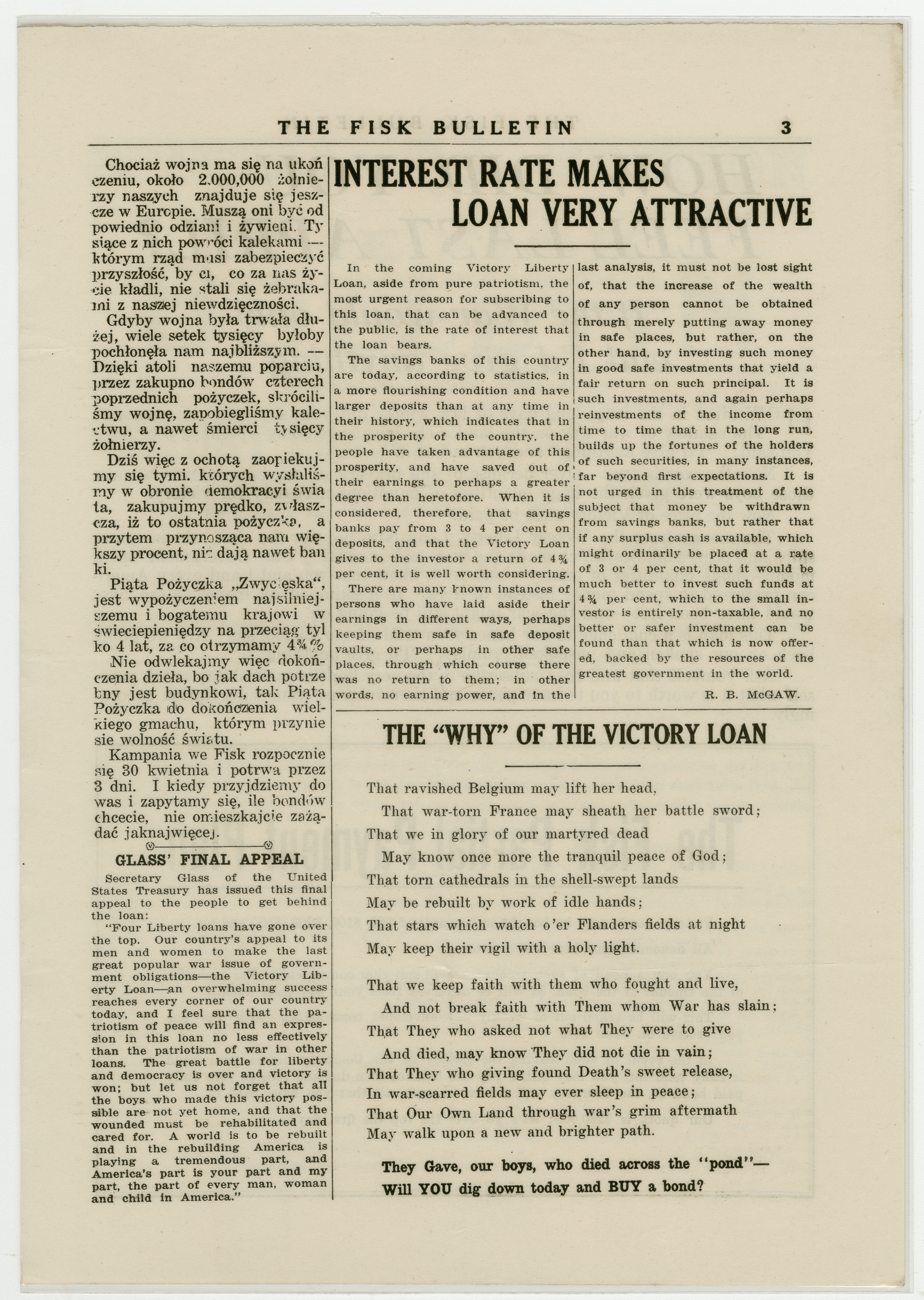 A four page special edition of the Fisk Bulletin dedicated to the announcement of Victory Liberty Loan Drive. This is the fifth year of the drive and the focus is buying bonds to help the government in the clean-up after The Great War in Europe. Letters of appeal from the management of the Fisk Company fill the first two pages. A letter in Polish and one from the U.S. Secretary of the Treasury are on page three. The back page explains the payment plan of buying the bonds. The goal of the drive: $260,000.