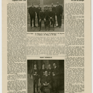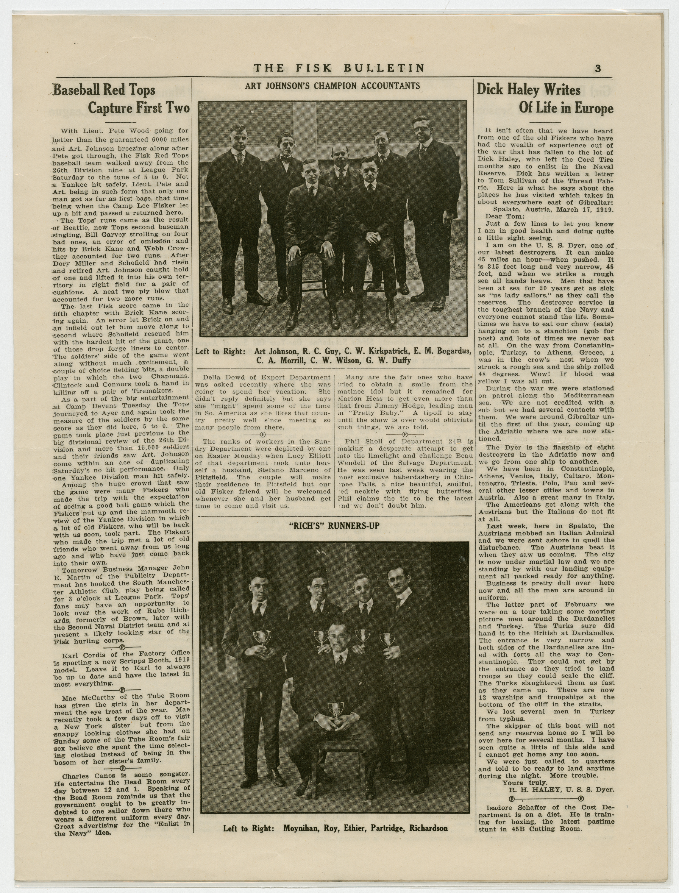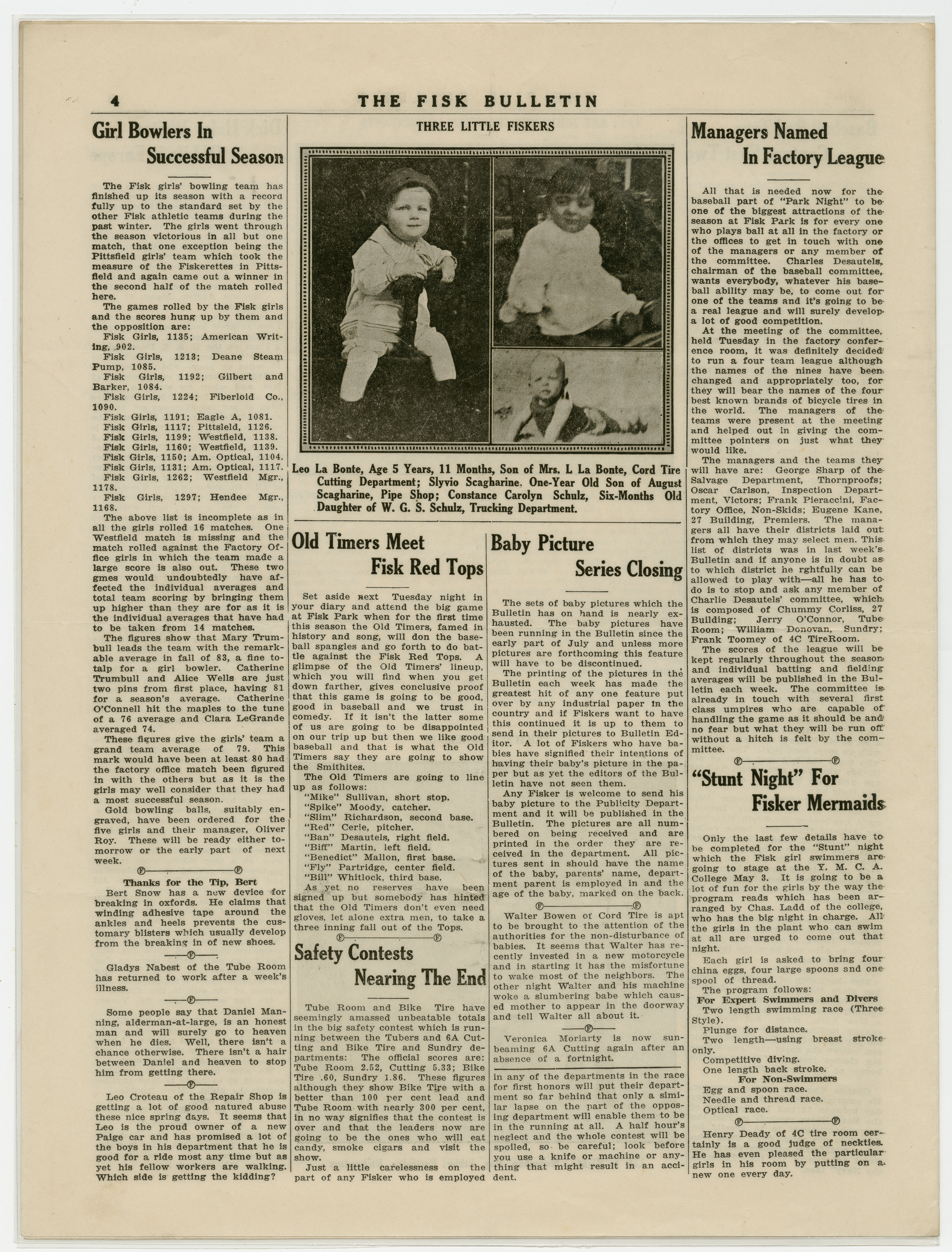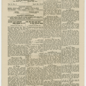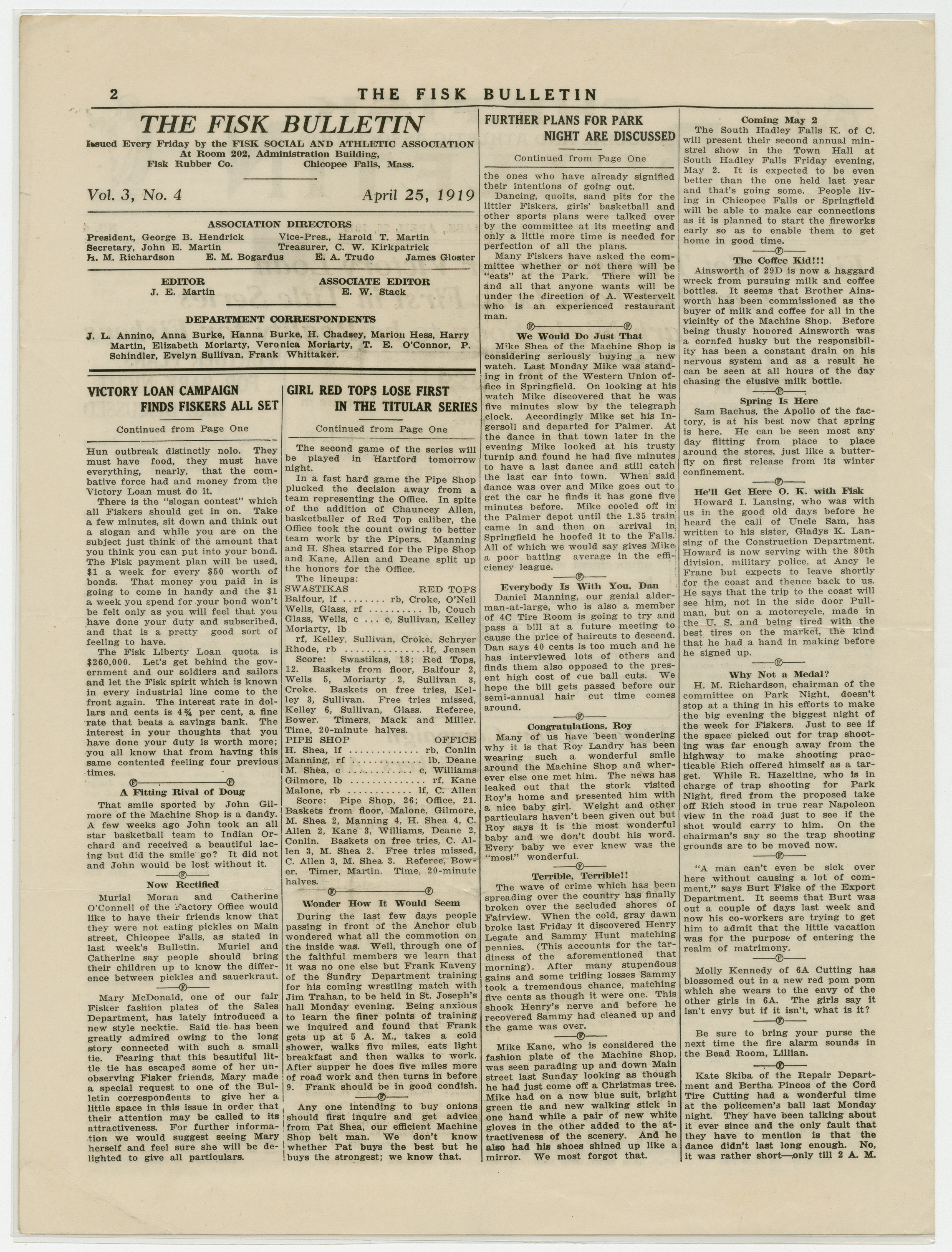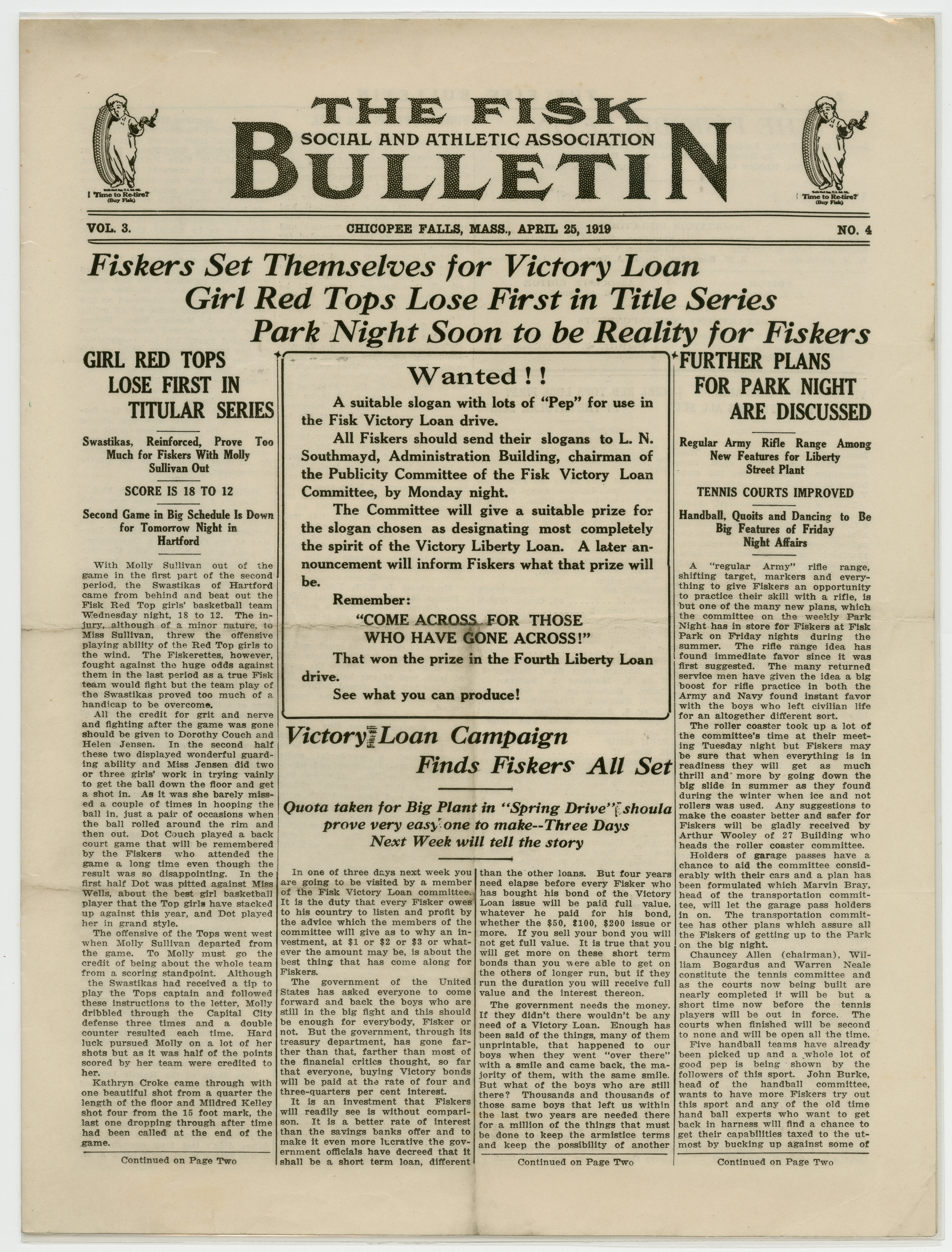 A four page newspaper describing the events related to the social groups and athletic clubs of the Fisk Tire Company for the week of April 25, 1919. Page one features include the opening of the Victory Loan Drive, the women's basketball team loss in the title series and the progress on the Park Night plans. Also, the slogan contest for the Victory Loan Drive is open for all employees. Page two is where the page one jumps landed and employee notes fill out the remainder of the space. Page three highlights the Red Tops baseball team win over the Yanks of Camp Devens. And, a letter from Dick Haley of the Cord Tire division on his travels in the Navy in the aftermath of World War I fills the right hand column of the page. Page four stories include one on the successful women's bowling team, one on the Baby Picture feature ending and one on the managers being named for the factory baseball league.