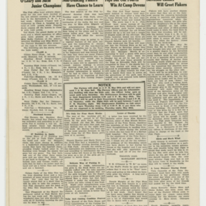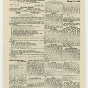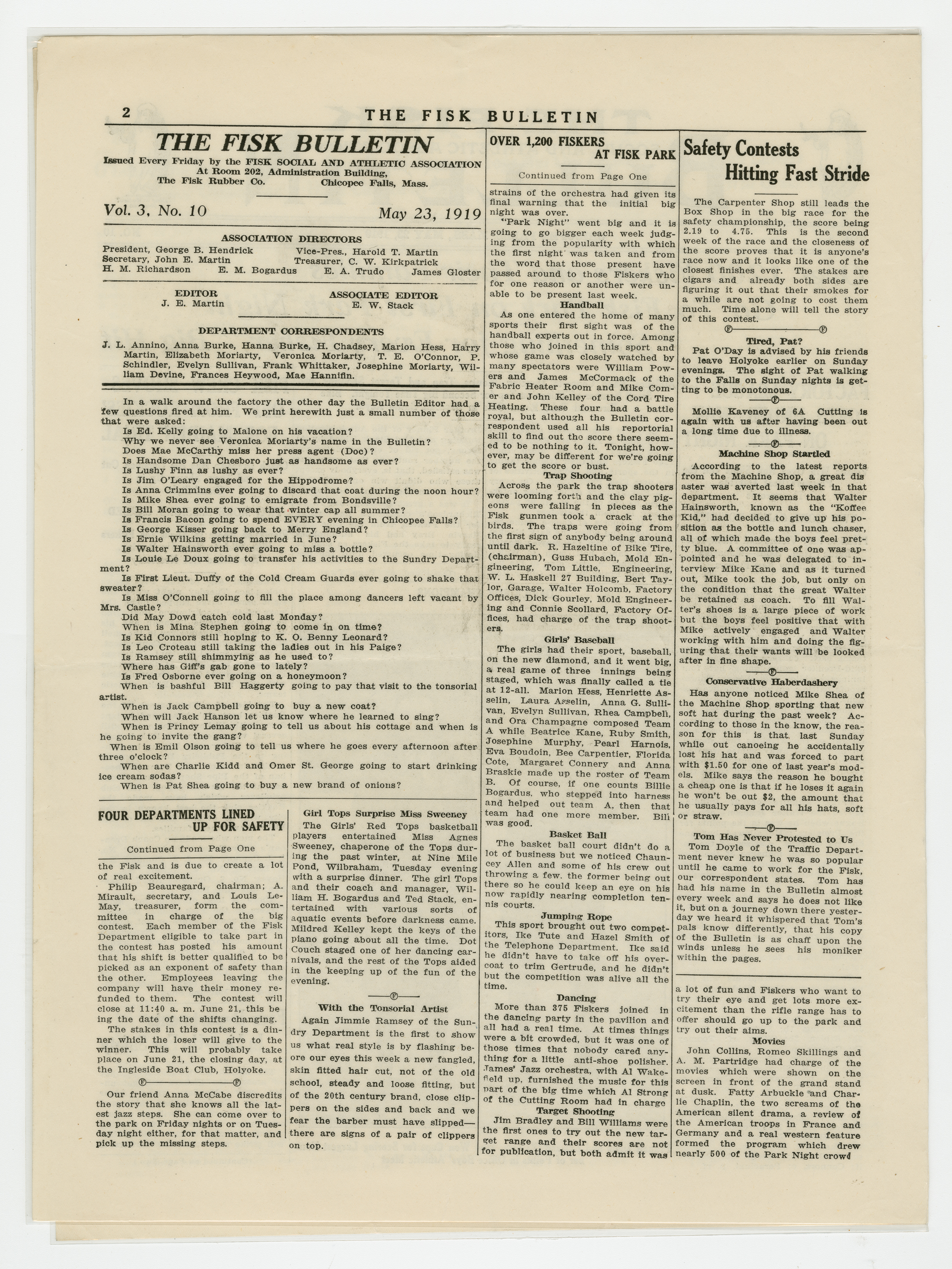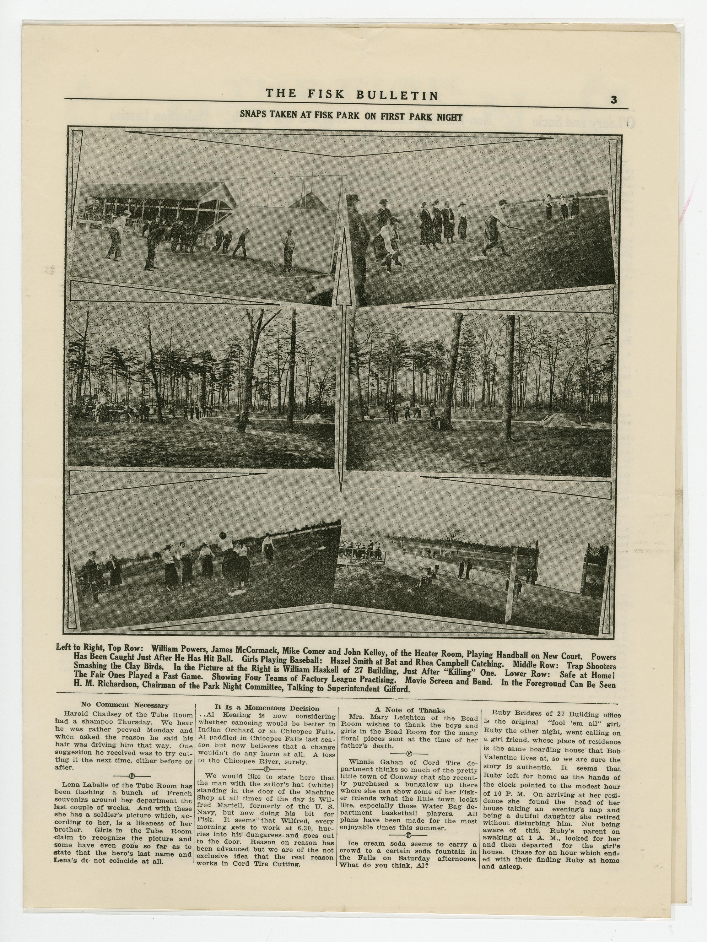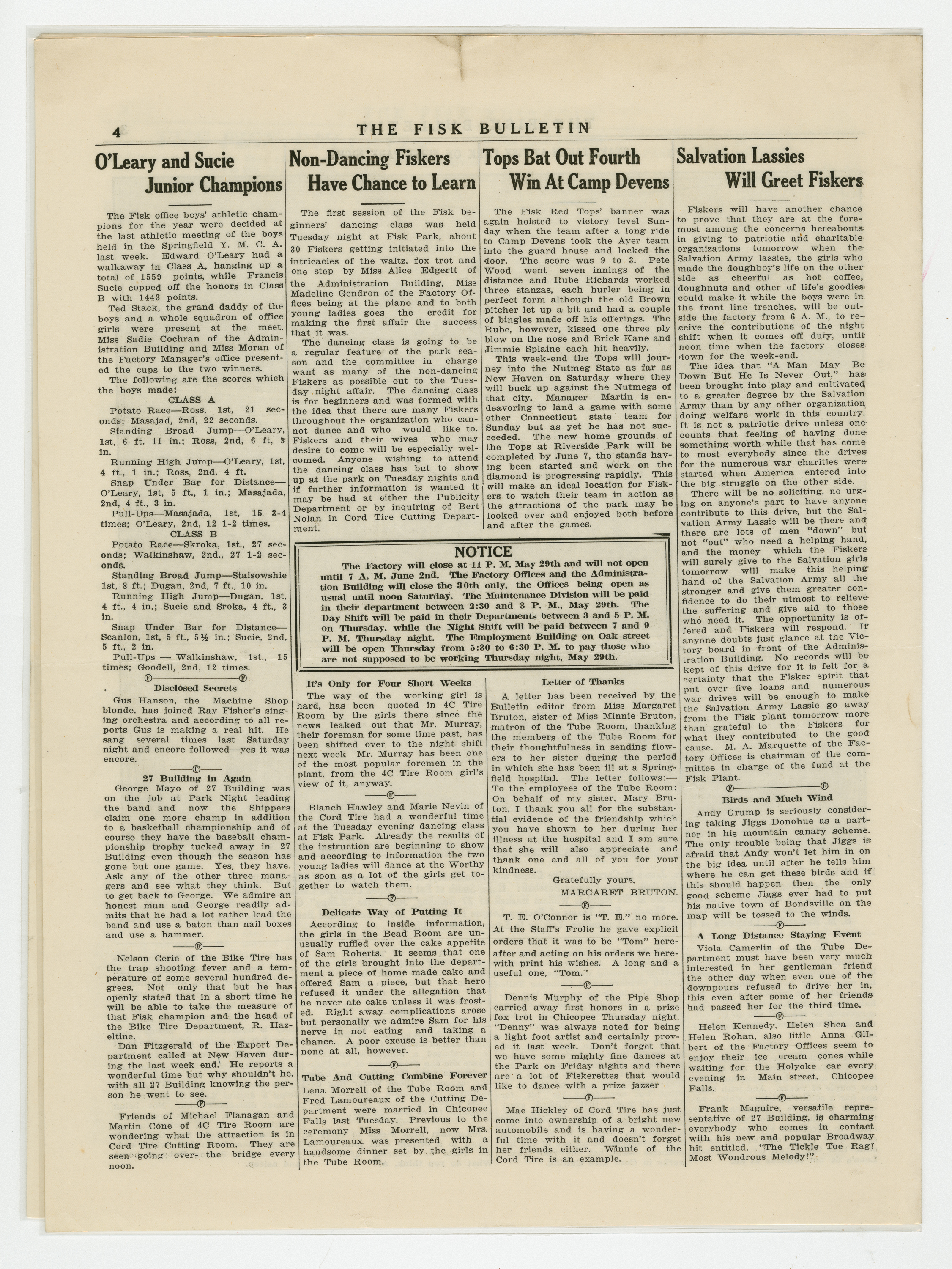 A four page newspaper describing the events related to the social groups and athletic clubs of the Fisk Tire Company for the week of May 23, 1919. The page one banner headline reads "Over 1200 Fiskers and Their Families Go to Fisk Park on First Park Night." Other stories on weekend events include items on the start of the summer factory league and the first practice of the Fisk Crew Team. A photograph of Francis Sucie and Edward O'Leary, who both received the highest points in the Office Boy's Athletic Meet, completes the page. Page two and three have the continuation of stories from Park Night and a package of photographs from the events at Fisk Park. On the back page is a story on Sucie and O'Leary and the office boys' meet. The dance class held its first session and over 30 showed up to learn the waltz, the foxtrot and the one step. Alice Edgertt, of the Admin Building, was the teacher and Madeline Gendron, of the Factory Offices, was on the piano. The Red Tops traveled to Fort Devens and won their fourth game of the season. Finally, the Salvation Army will be taking donations from Fiskers from 6 a.m. to noon on Saturday.