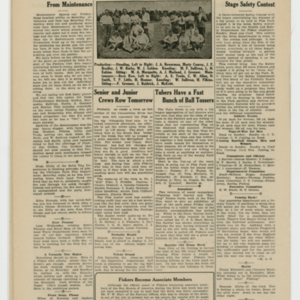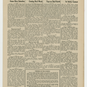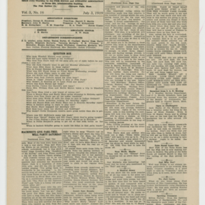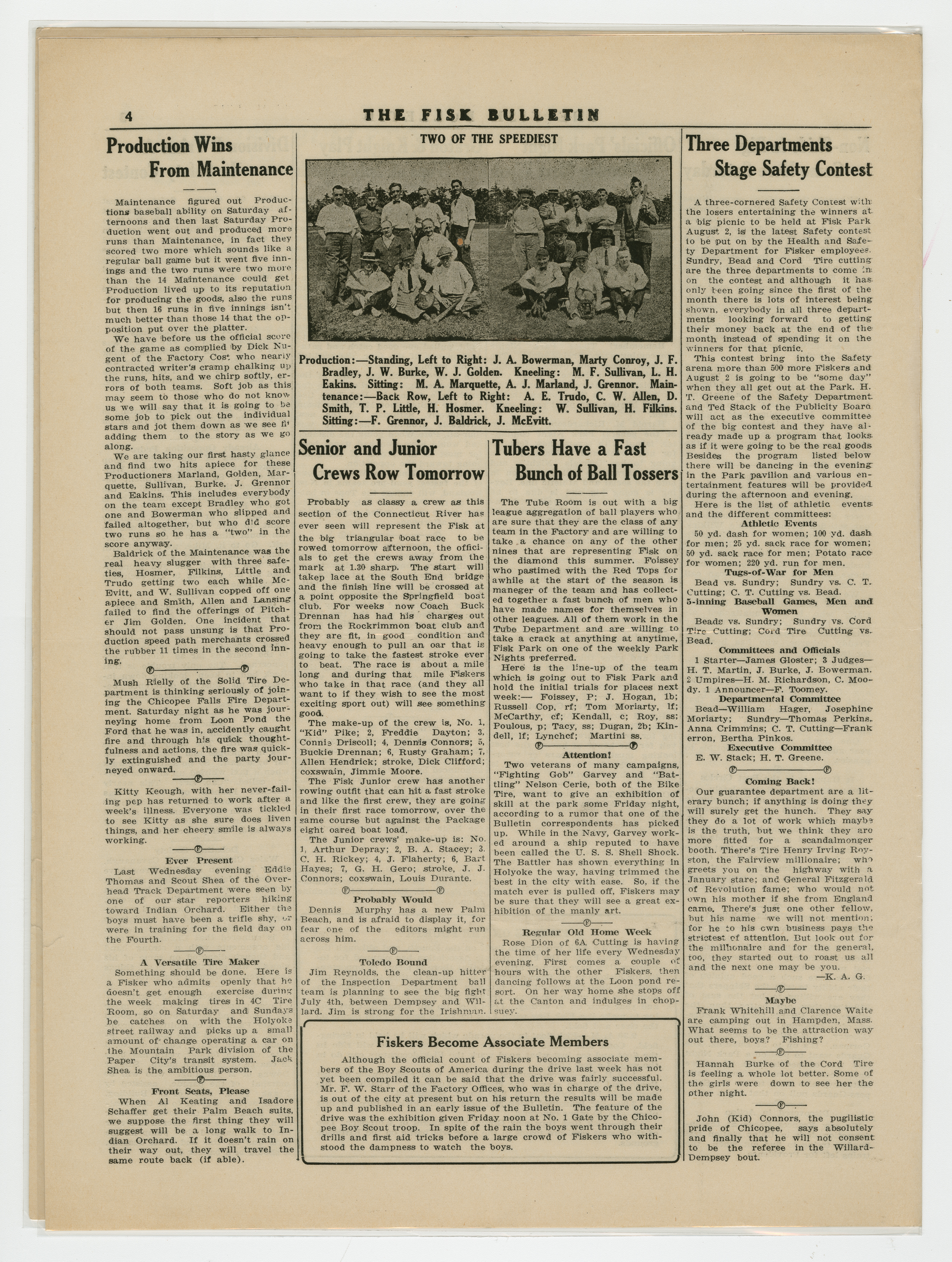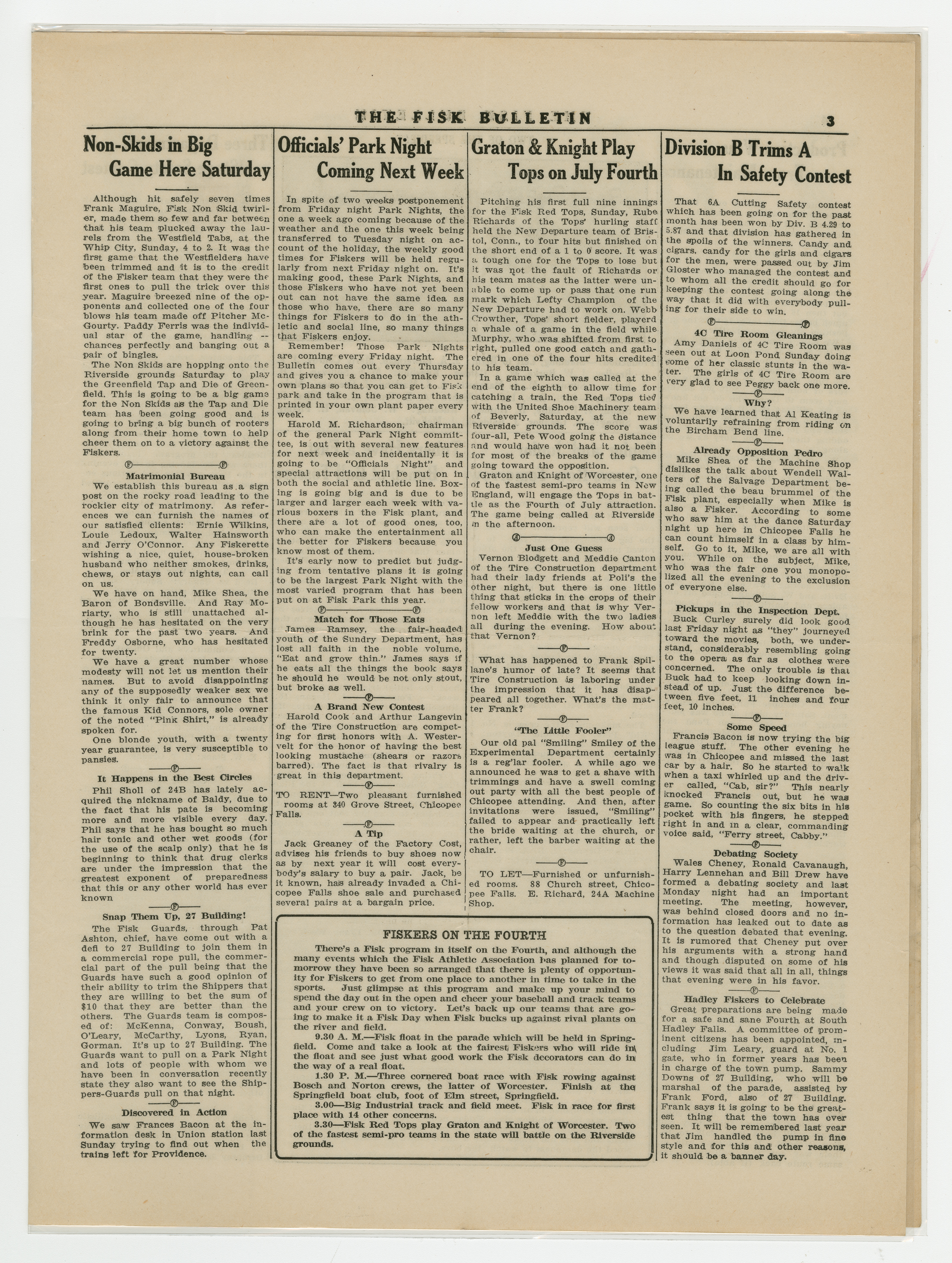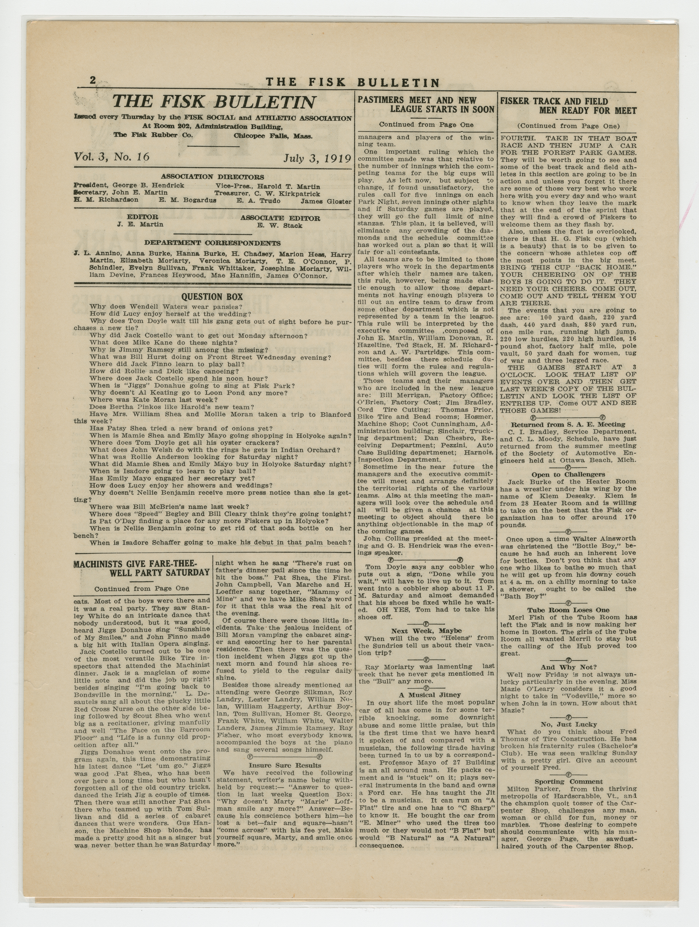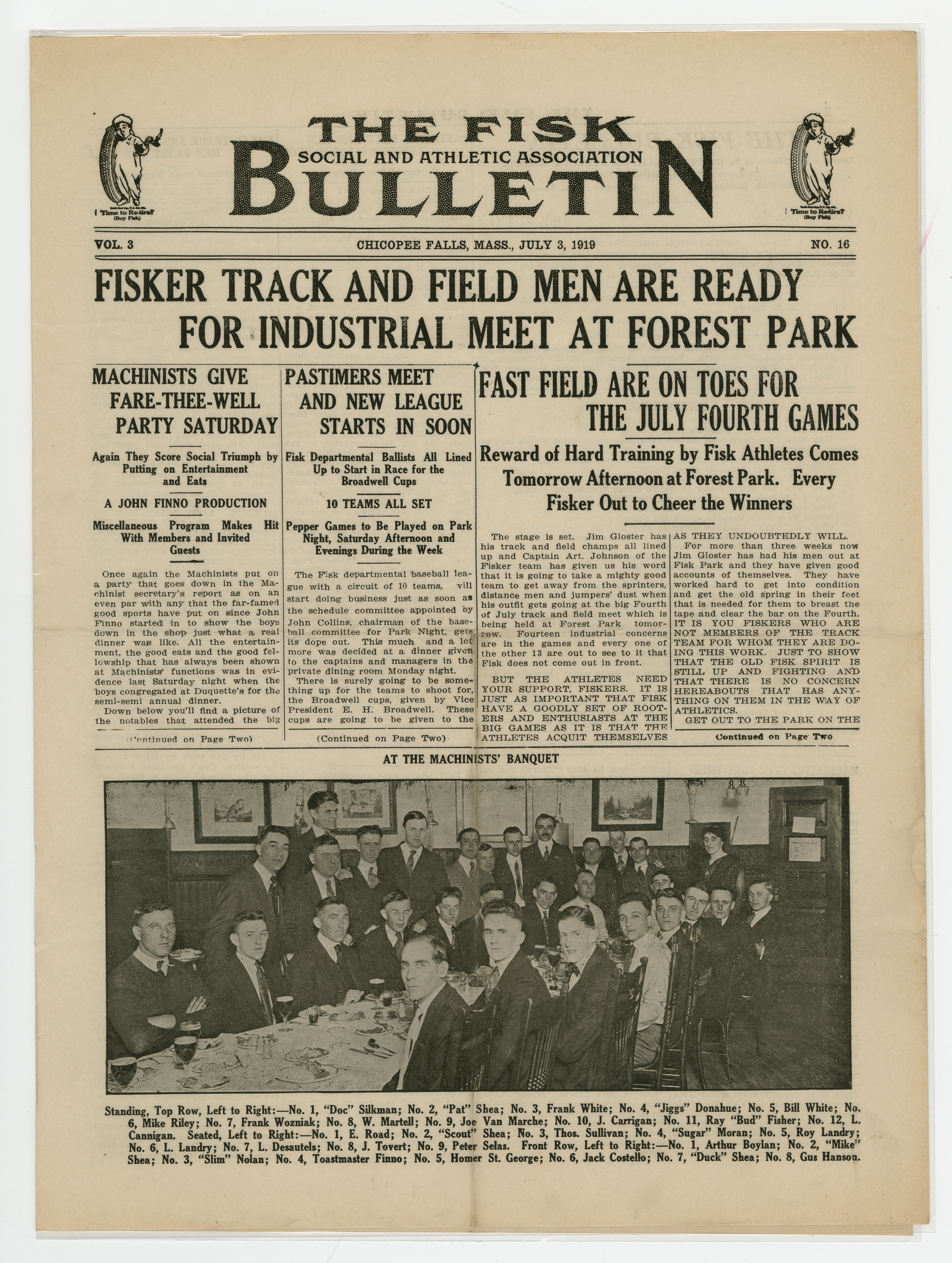 A four page newspaper describing the events related to the social groups and athletic clubs of the Fisk Tire Company for the week of July 03, 1919. "Fisker Track and Field Men Are Ready For Industrial Meet at Forest Park" is the banner headline on page one this week. Other headlines read, "Machinists Give Fare-Thee-Well Party Saturday" and "Pastimers Meet and New League Starts Soon." A large photograph from the machinists dinner stretches across the bottom of the page. Page two has jumps and employee notes. Page three stories include one on the Non-Skids next game, one on the Red Tops games against the Graton & Knight team form Bristol, Connecticut and one on Division B trimming Division A in the safety contest. Plus, a wide variety of employee notes. Page four highlights the inter-department game between the Production team and the Maintenance team. The Production team wins. The senior and junior crew teams will row in a tri-meet and it looks like the Tube Room "has a fast bunch of ball tossers."