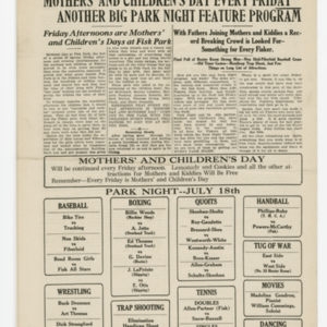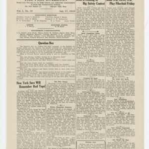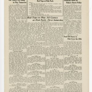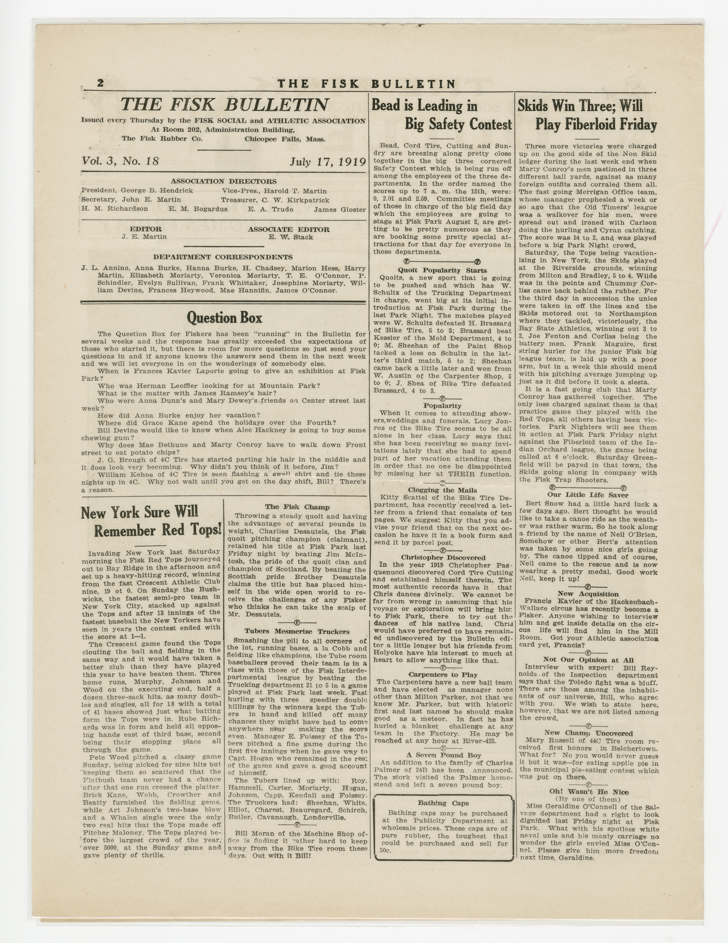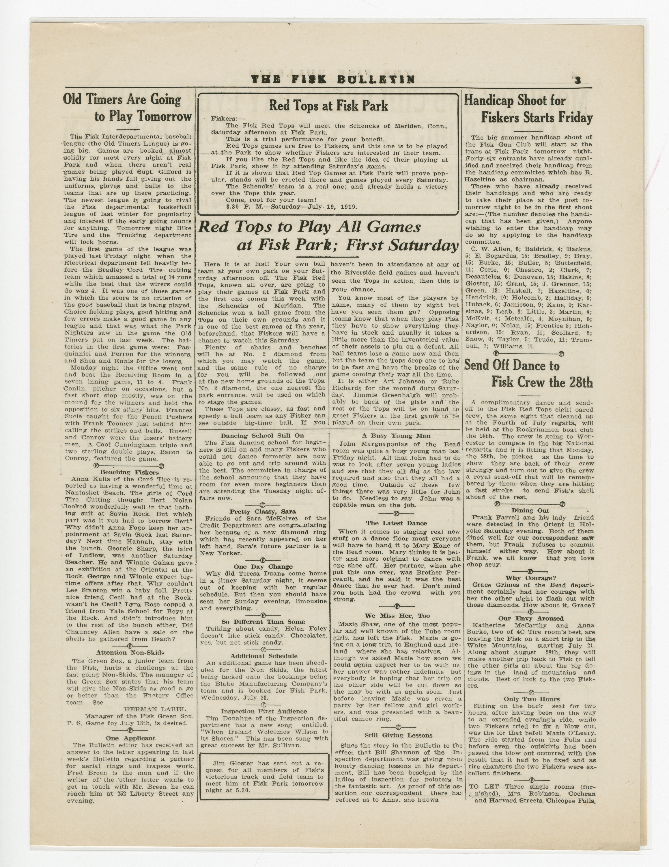 A four page newspaper describing the events related to the social groups and athletic clubs of the Fisk Tire Company for the week of July 17, 1919. Page one is almost all photographs from the Mothers and Children's day at Fisk Park. The lone story on the page says the last Park Night was the largest to date. In addition to all the employee notes on page two there are stories about the Red Tops trip to New York and the Non-Skids winning three games in a row. Also, the Safety Contest is very close between the Bead, Cord Tire, Cutting and Sundry departments. Page three headlines read "Old Timers Are Going to Play Tomorrow," "Red Tops to Play All Games at Fisk Park," "Send Off Dance to Fisk Crew the 28th" and "Handicap Shoot for Fiskers Starts Friday." On page four it is another Mother's and Children's night at Fisk Park, not only that, but every Friday is Mother's and Children's night at Fisk Park. Schedule at bottom of the page.