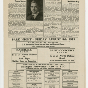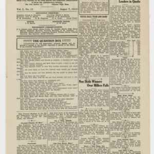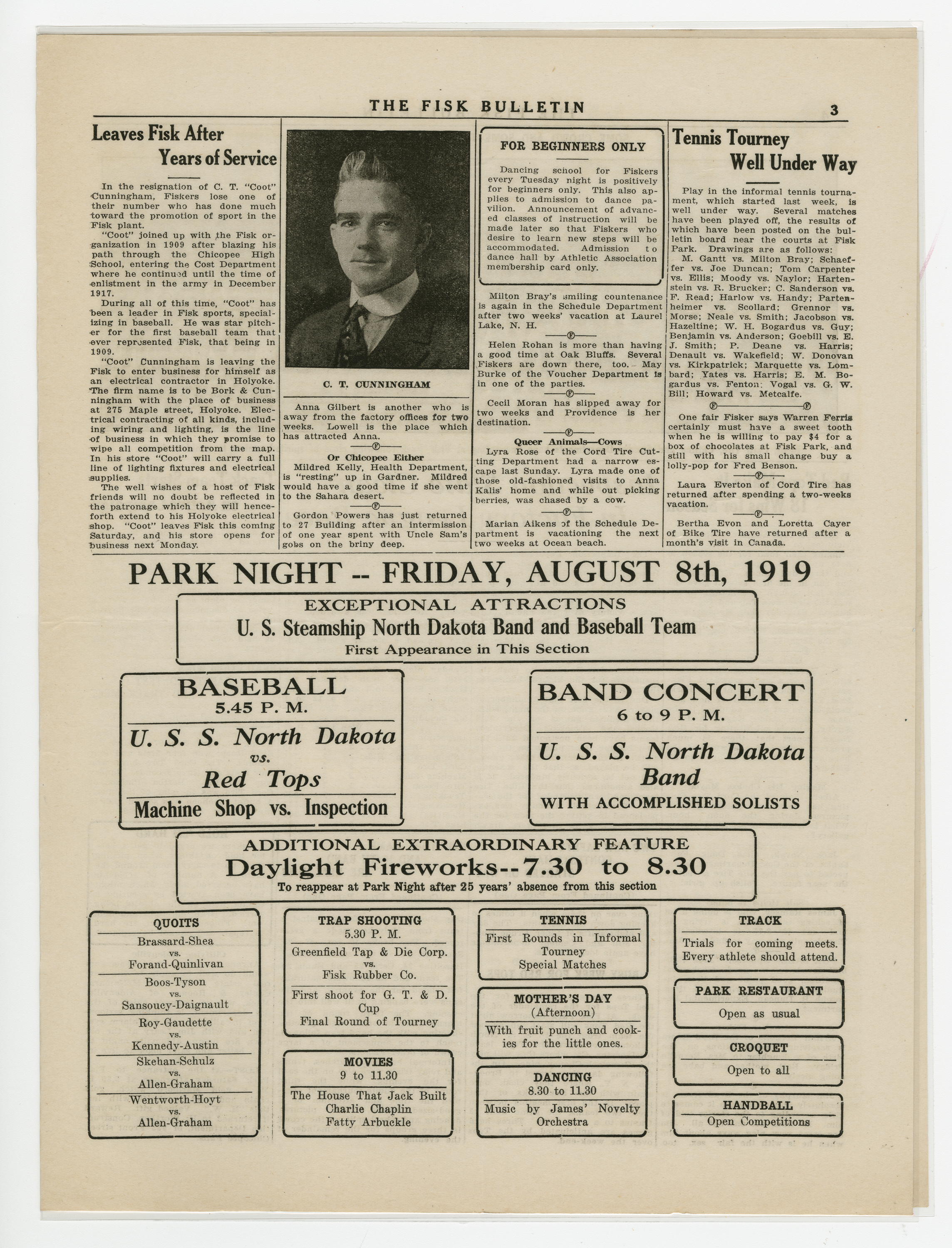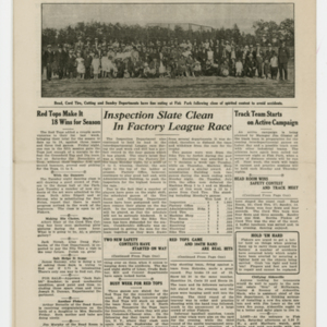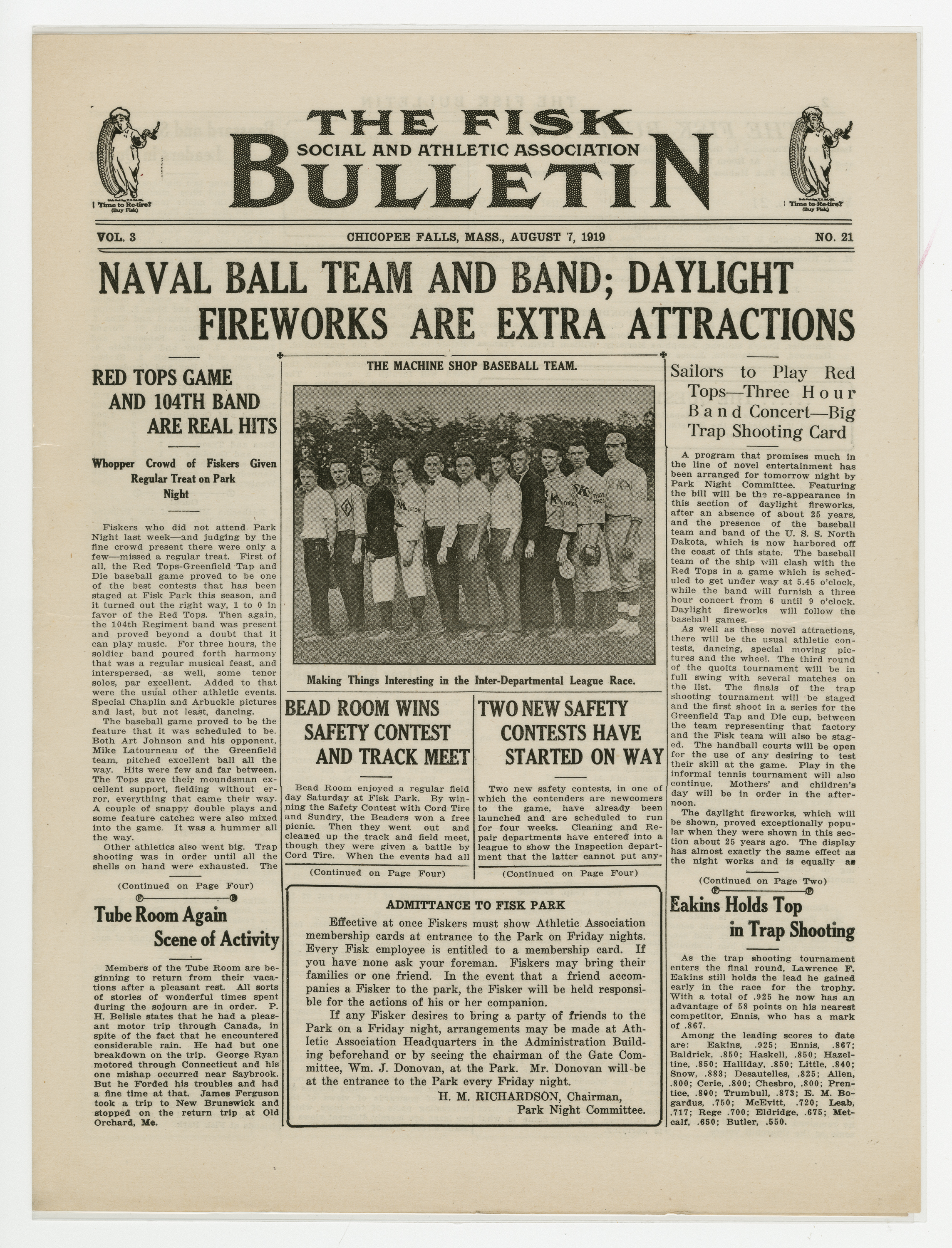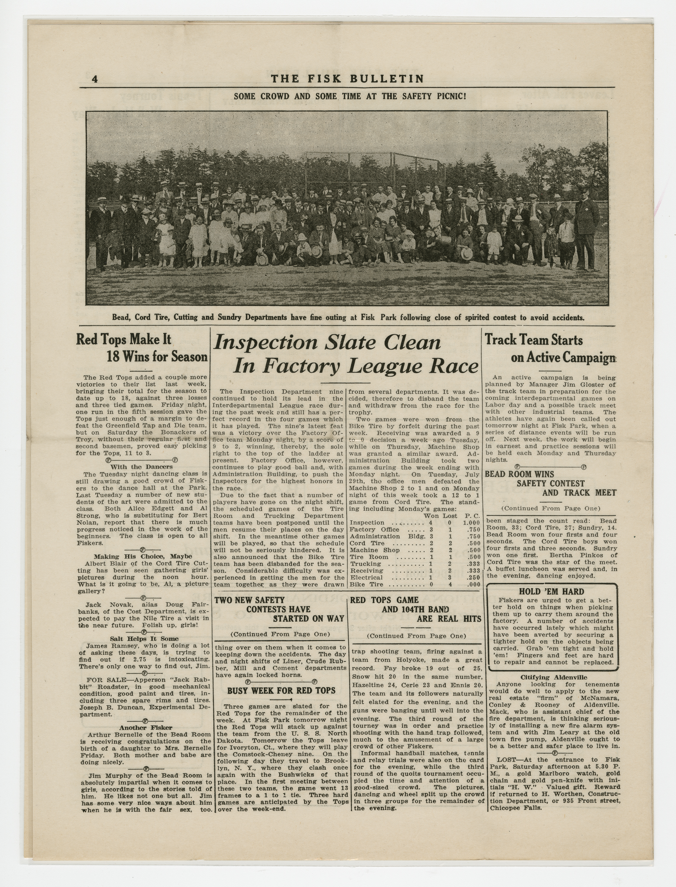 A four page newspaper describing the events related to the social groups and athletic clubs of the Fisk Tire Company for the week of August 7, 1919. As reported in last week's edition, the 104th Regiment Band performed and drew a "whopper" of a crowd. The page one story has all the details. Also, another military band is coming to the park. The Naval Band will perform and the Red Tops will play the Navy baseball team at the next Park Night. In other page one news, the Bead Room wins the safety contest and the also the interfactory track meet and the Tube Room employees have returned from their vacation well rested. After the page one jumps and a slew of employee notes there is only room on page two for a story about the Non-Skids win over the Millers Falls team. Page three has the complete Park Night schedule and stories about C.T. Cunningham leaving Fisk to start his own electrical business in Holyoke and the results of the ongoing tennis tournament. Some employee notes fill in the gaps. On the top of page four is a four column photograph of the safety contest winners' picnic. Stories include one on the Red Tops gaining their eighteenth victory, one on the Inspection team keeping the top spot in the factory league and one on the track team practicing for the Labor Day meet.