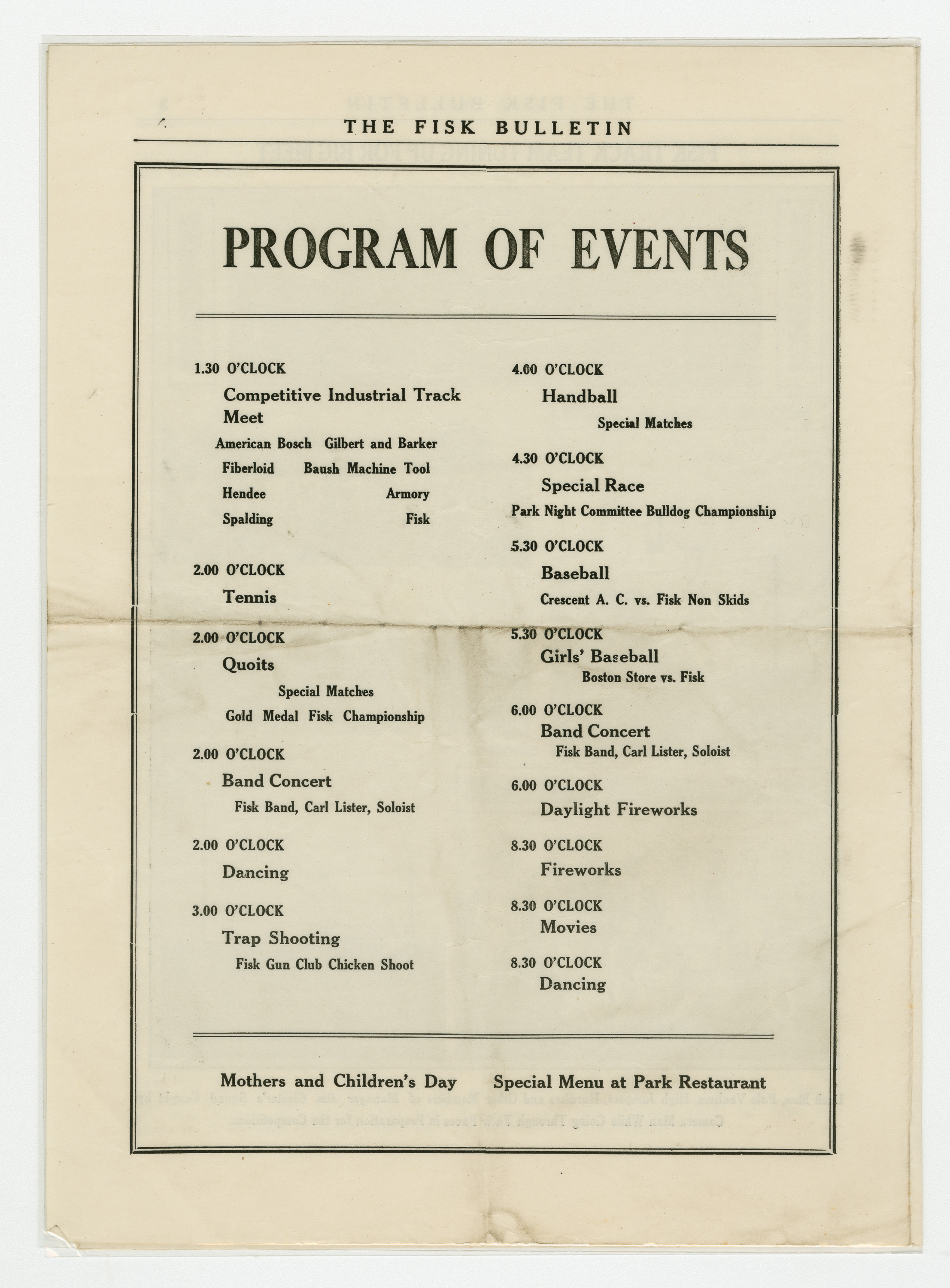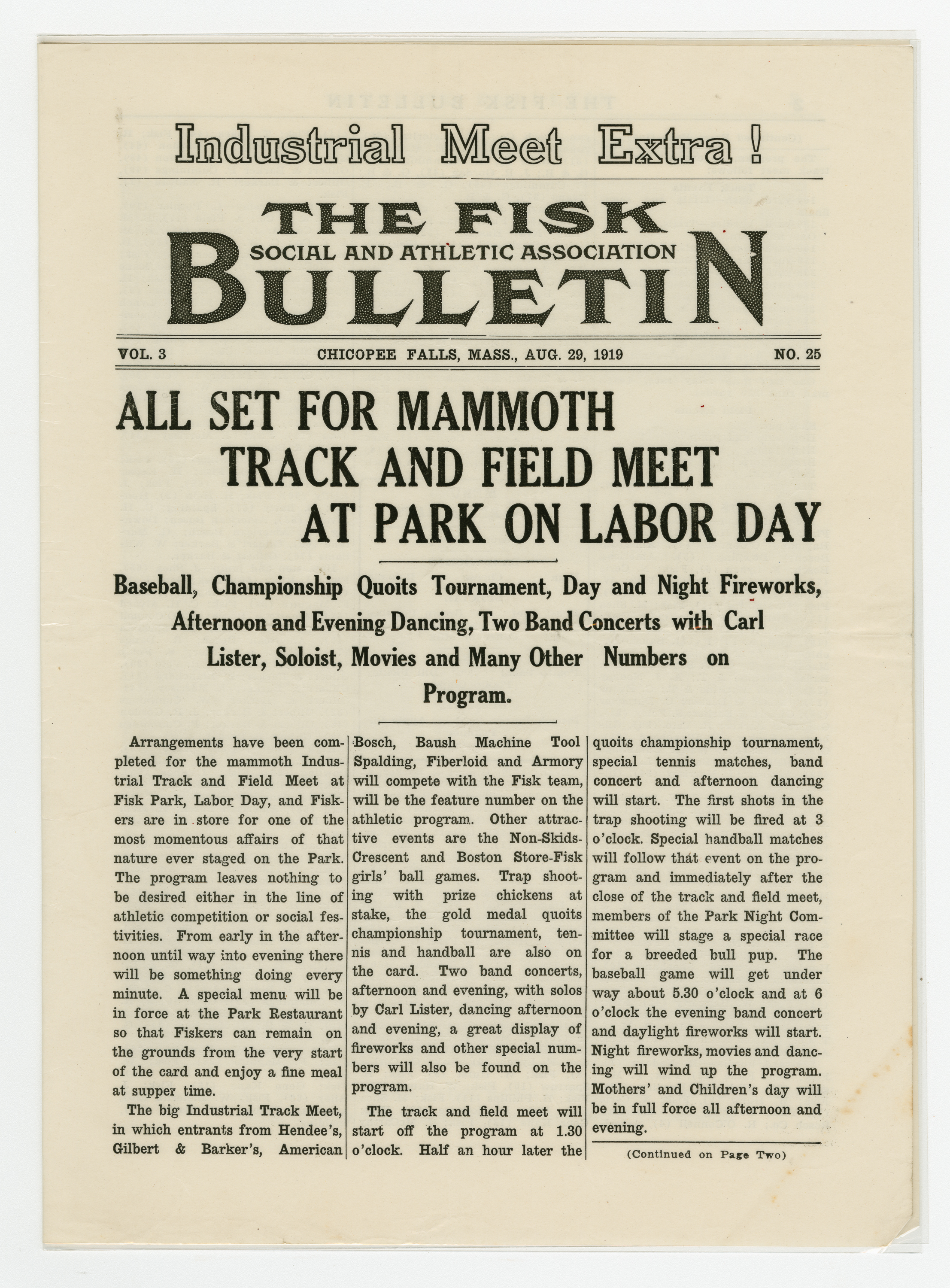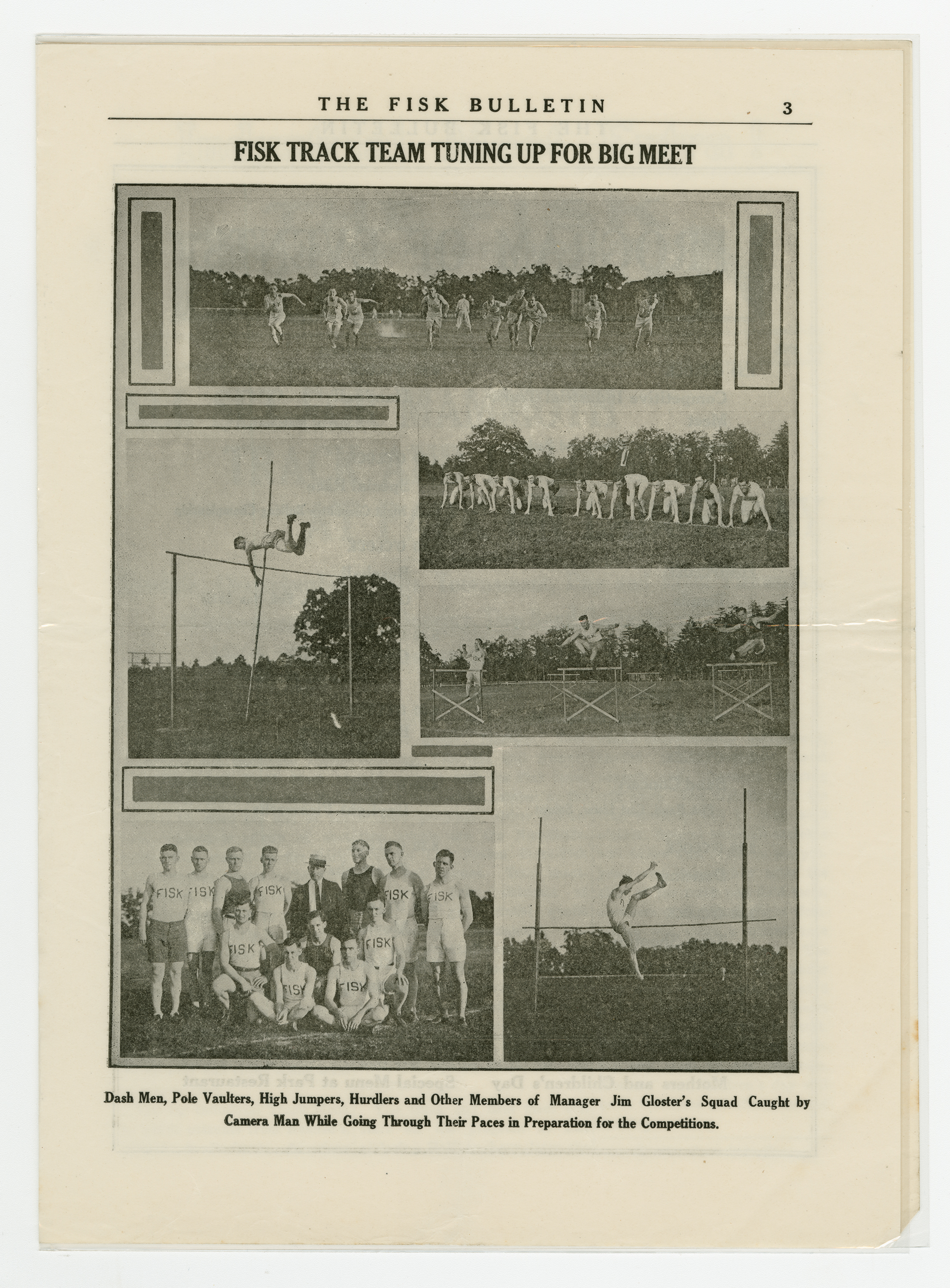 A four page special edition of the Fisk Bulletin dedicated to the Labor Day Weekend events at Fisk Park. The headline states "All Set For Mammoth Track and Field Meet at Park on Labor Day." The other events of the day are highlighted in the sub-head. A full line-up of races appears on page two following a story about the planned activities. Page three is full of photographs of the track team getting ready. Page four is the program of events.