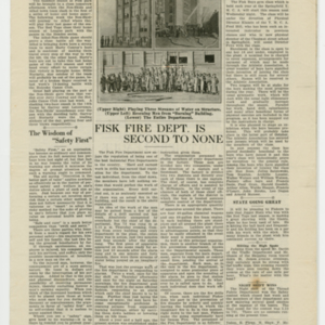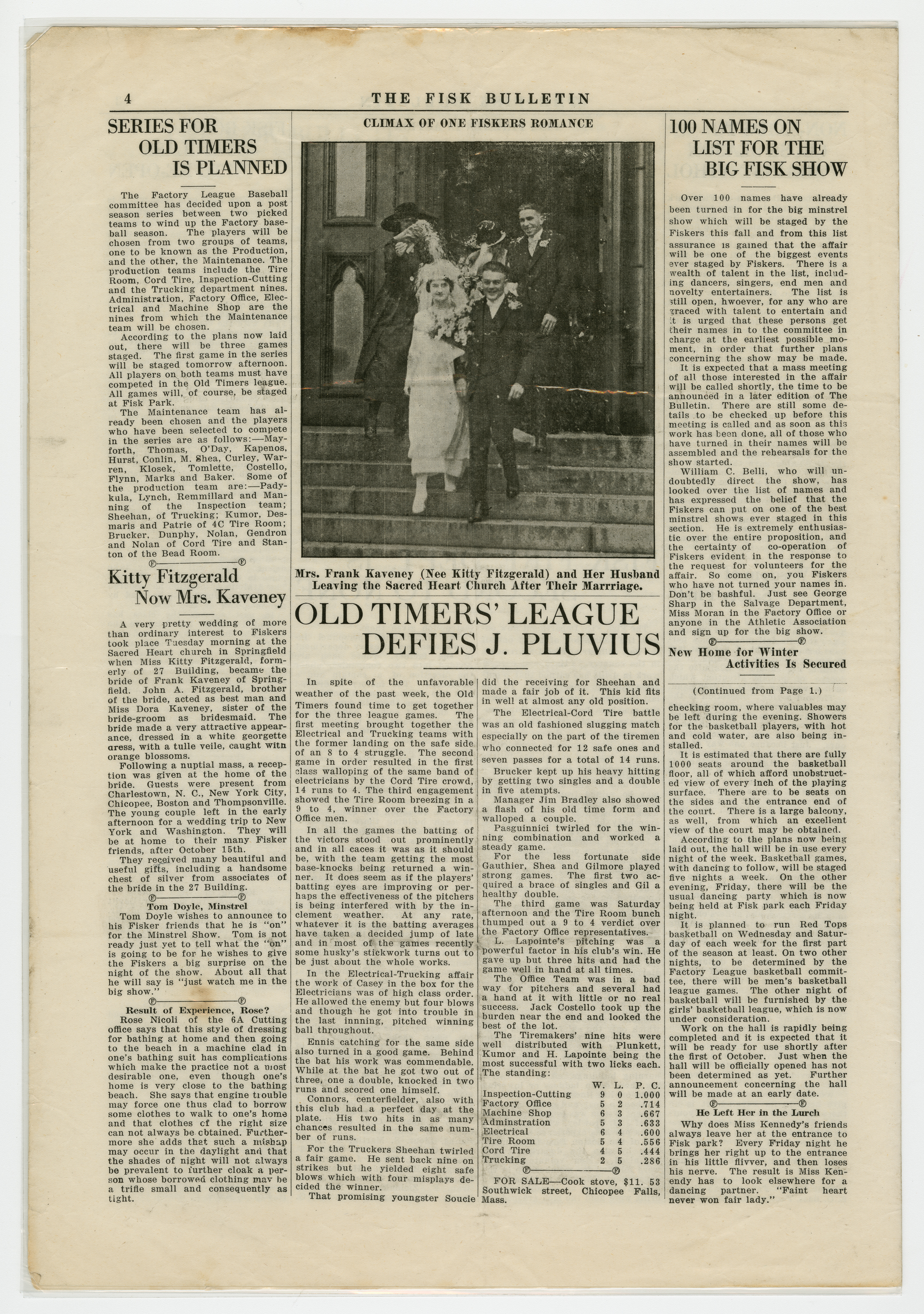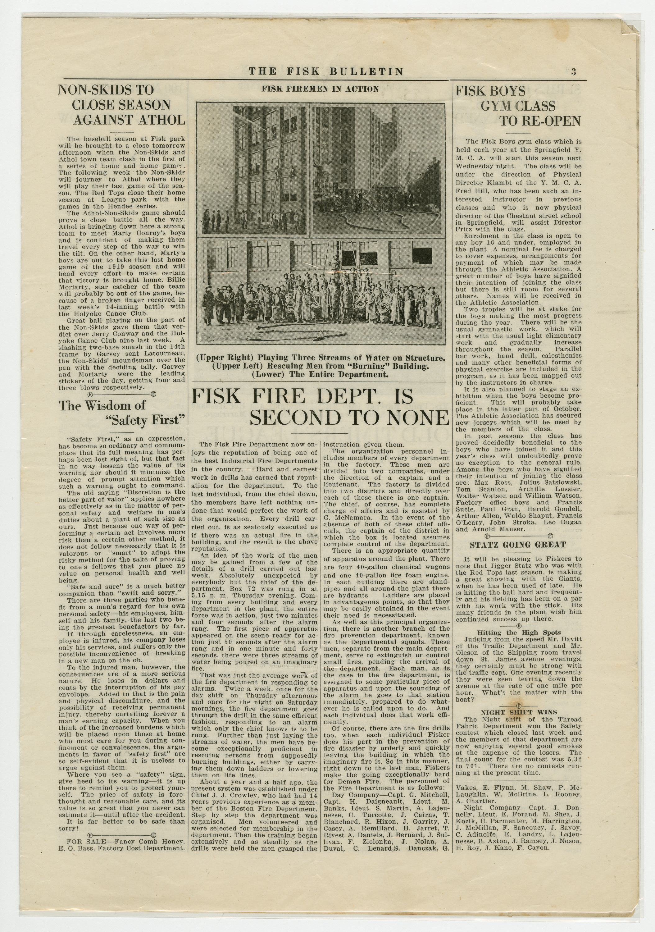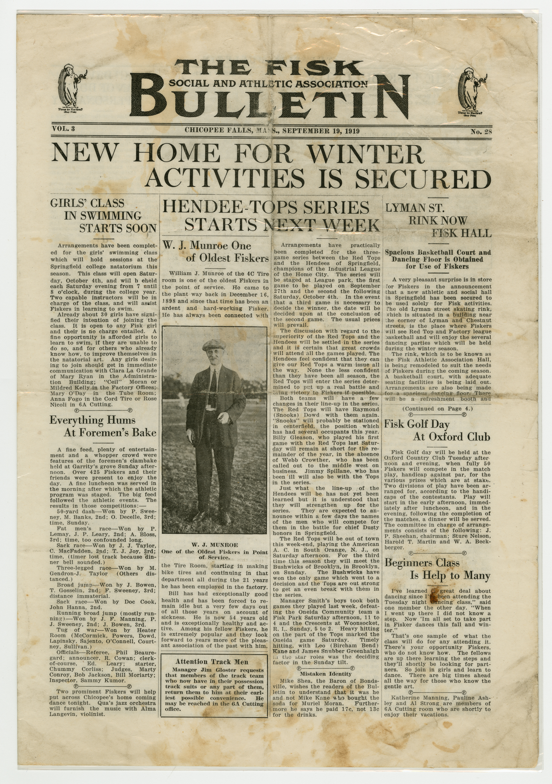 A four page newspaper describing the events related to the social groups and athletic clubs of the Fisk Tire Company for the week of September 19, 1919. Page one announces the Lyman Street (Springfield) Rink has been secured as the home for winter activities for Fisk employees. There will be room for a basketball court and a full dance floor. Also, the Red Tops will play the Hendees of Springfield for the Industrial League regional championship. The page one feature is a story and photograph on the oldest Fikser at the plant, William J. Munroe. He started at Fisk in 1898 and has always been connected to the Tire Room. On a side note, Mike Shea wants Bulletin readers to know it was he and not Mike Kane who bought the soda for Muriel Moran. Love is in the air on page two as the Telephone room is hit by romance and several of the operators will not be returning to work after getting married while on vacation. Page three features a story and photographs of the Fisk Fire Department and their recent training session. Also, the Non-Skids will finish their season against the Athol town team and the boys gym class will reopen at the Springfield Y.M.C.A. Despite the weather the Old Timers League wraps up the season and the story appears on page four. The list for the minstrel show tops 100 names and Kitty Fitzgerald is now Mrs. Kaveney.
