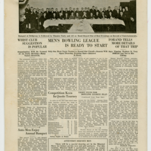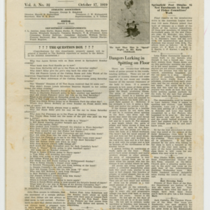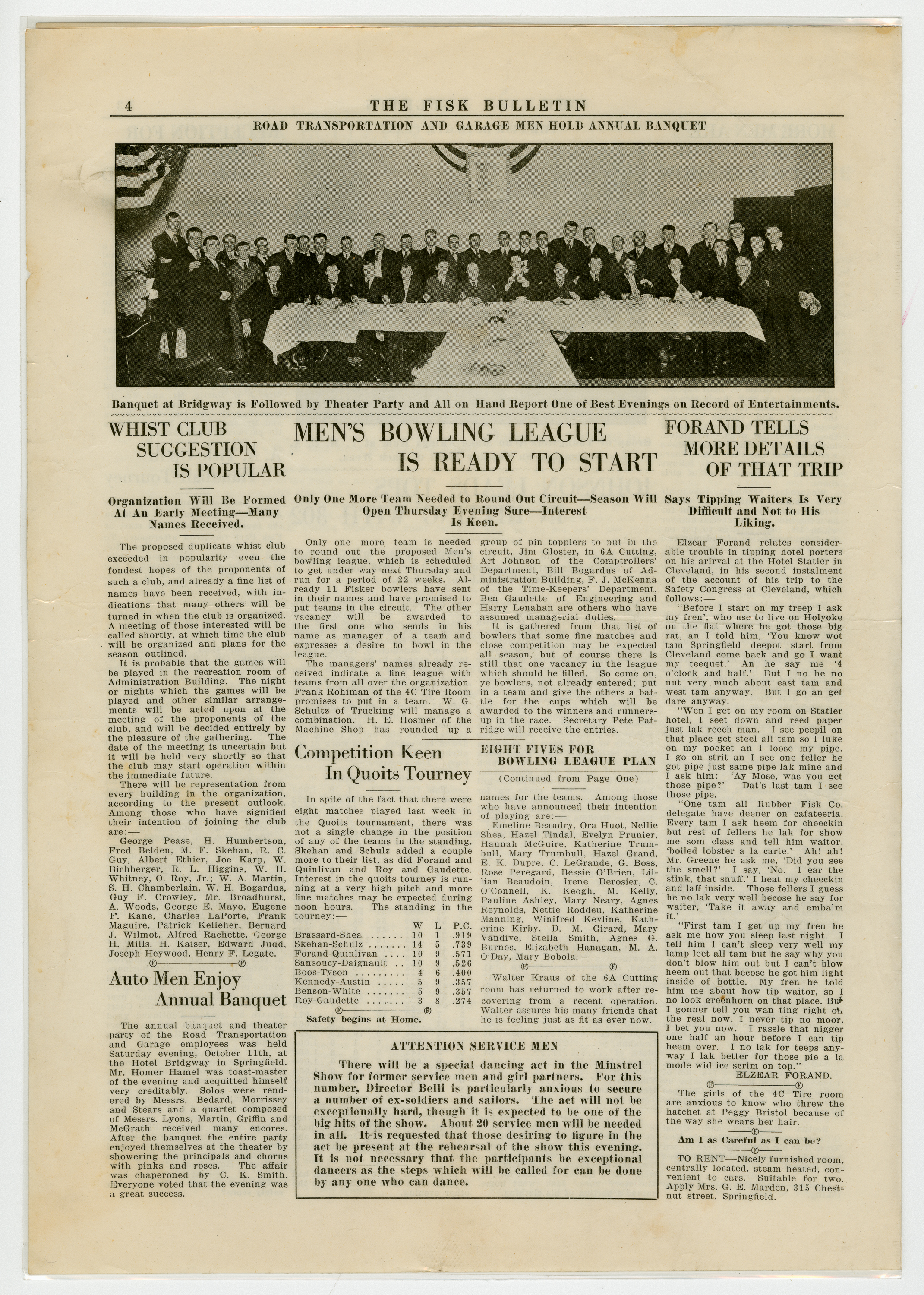 A four page newspaper describing the events related to the social groups and athletic clubs of the Fisk Tire Company for the week of October 17, 1919. As the seasons change so does the Bulletin page one. The lead story is a call for jokes (no joke) for the minstrels to use in the upcoming show. The winner of the best joke gets free tickets to the show. Buck Drennan has been chosen as the coach of the Fisk Basketball team and the bowling league has eight teams. Also, there will be a Fisk factory basketball league for women. On page two is a very long Question Box. A story about the American Legion having 188 new members join from Fisk. Also, there is a story on the safety dangers of spitting on the floor. Page three headlines are, "More Men Needed in the Minstrel Show," (Arthur) "Johnson leads Tops in Hitting with .302" and "Reception for Dancing Class All Arranged." A photograph on page four shows the Garage and Transportation employees having their annual banquet. A short story below the picture describes the event. Quoits and Bowling are the topics of two other stories and another telling of the Cleveland safety conference trip wraps up the weeks news.