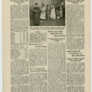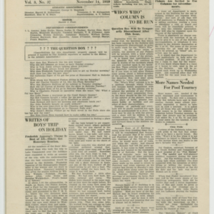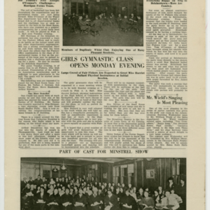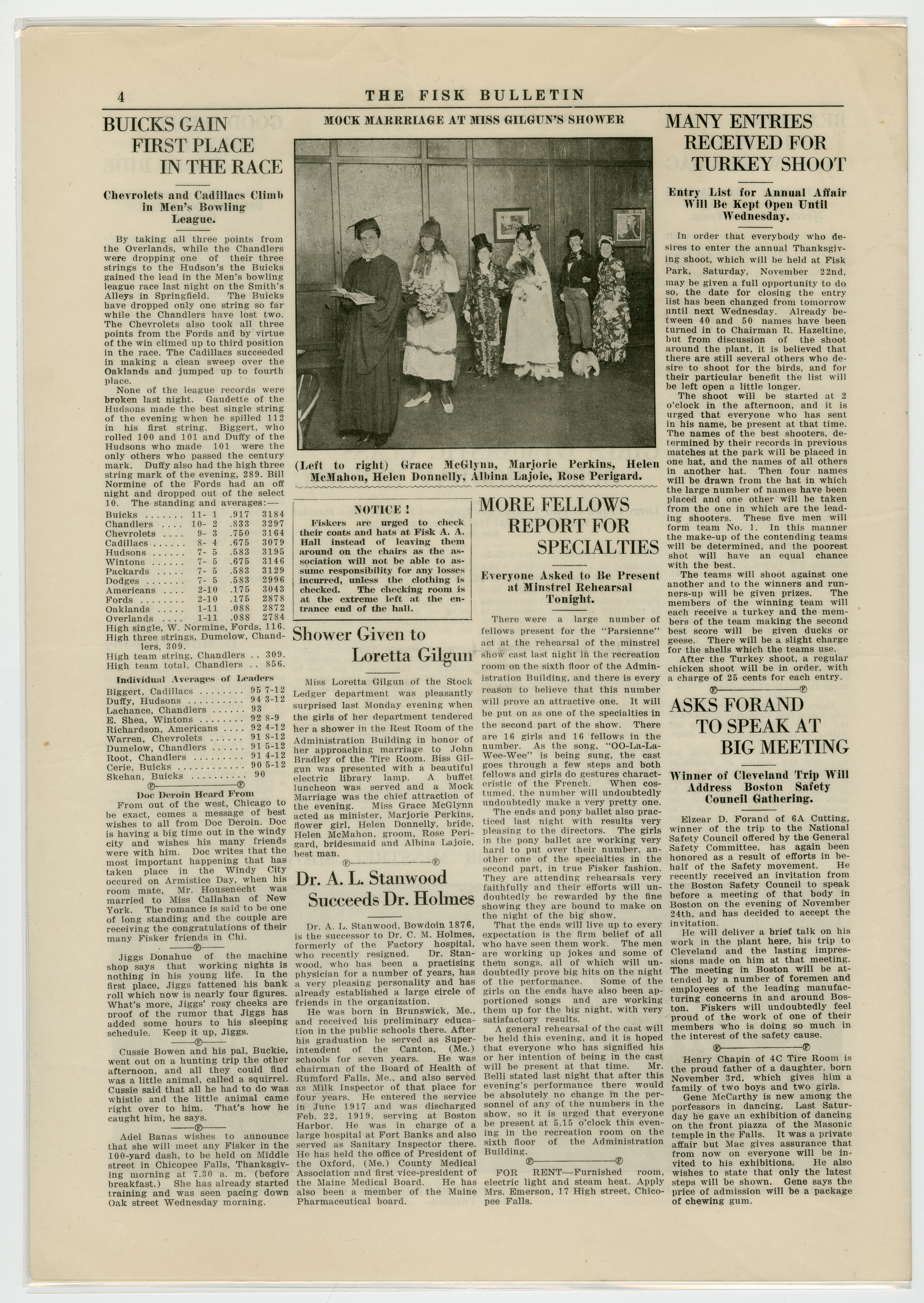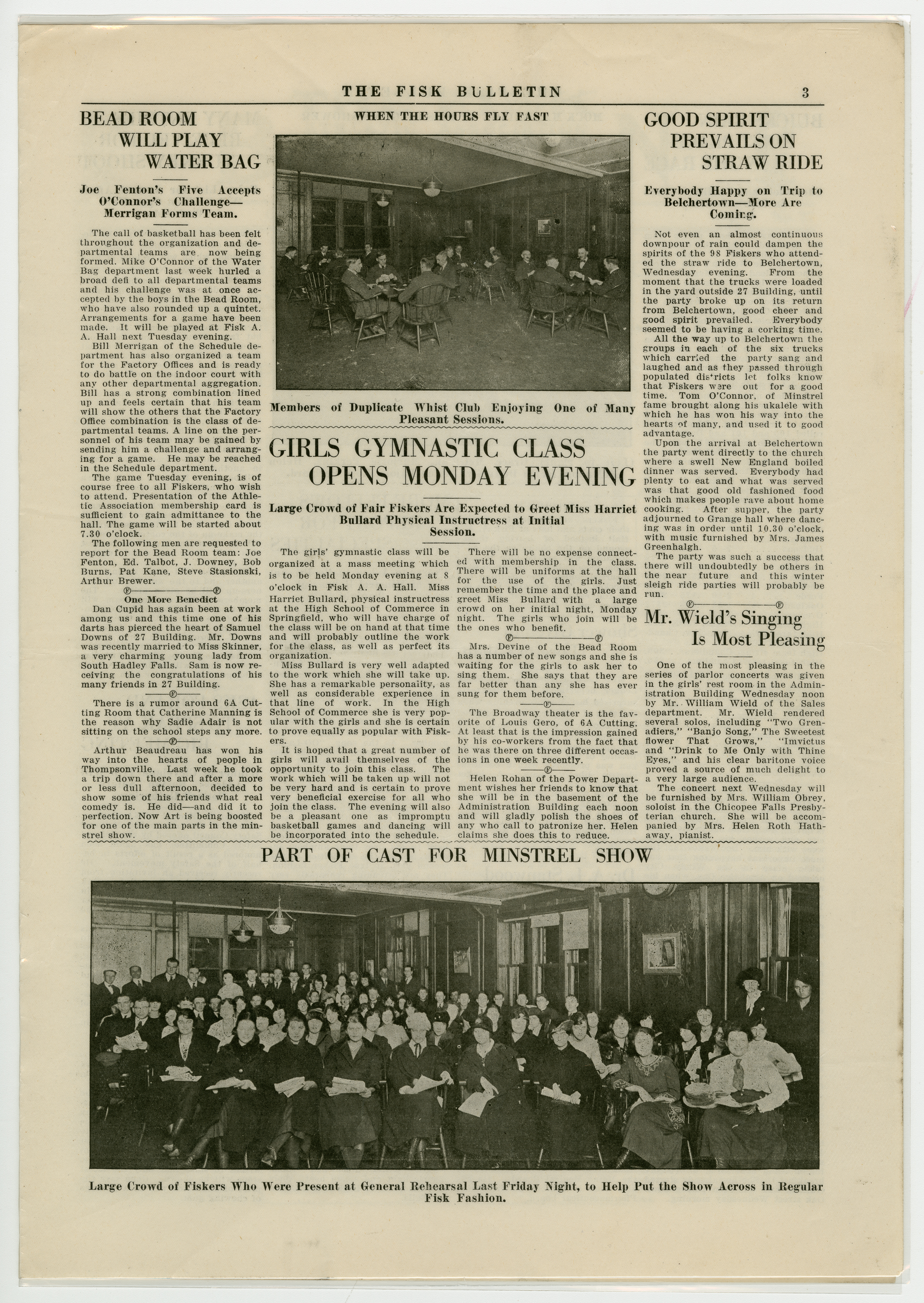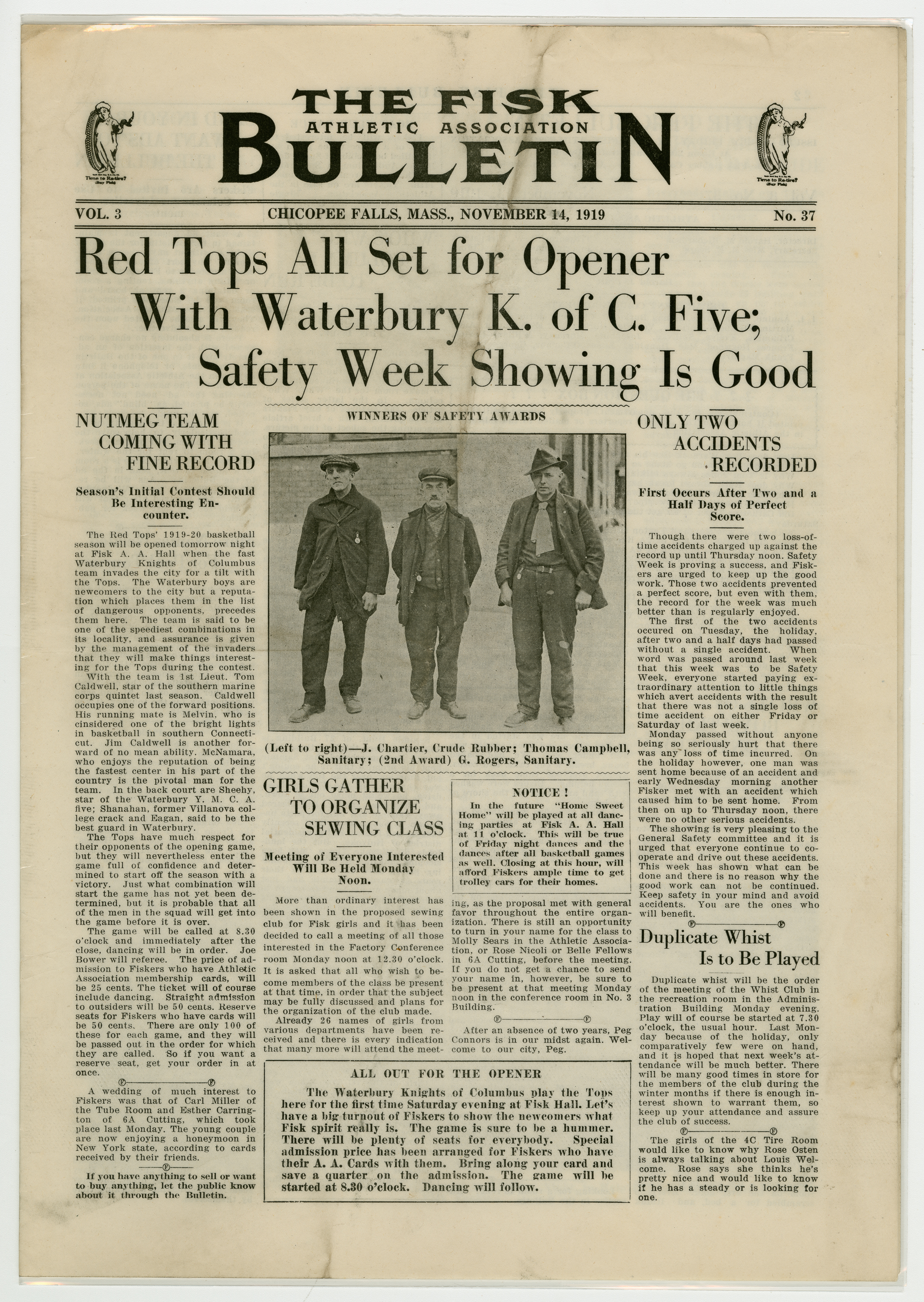 A four page newspaper describing the events related to the social groups and athletic clubs of the Fisk Tire Company for the week of November 14, 1919. The Red Tops are ready for their opening game against the Waterbury Knights of Columbus and there were only two accidents reported during safety week. Also on page one is a photograph of the safety award winners, J. Chartier of Crude Rubber, Thomas Campbell and G. Rogers of Sanitary. Other news includes the whist club and a sewing class being in the planning stages. On page two the winning story from the boys education class' trip to Lake Congamond is reprinted. Frederick Aggerup was the winning author. The last appearance of The Question Box is this week and it will be replaced with a "Who's Who" column. Also, the Bulletin is accepting want ads to run with the employee notes and names are needed for the Pool tournament. Page three answers the question of who will take on the Water Bag team in basketball. It's Joe Fenton and the Bead Room squad. The women's gymnastic class will start Monday night and the straw trip to Belchertown was a fun time and more will be coming. The cast of the Minstrel Show appears in a wide photograph at the bottom of the page. Page four leads with the turkey shoot and ends with the bowling league wrap-up. In between are stories about Dr. A.L. Stanwood taking over duties at the Fisk Hospital, the minstrel show again and Elzear Forand is taking his talk on the road. He will speak at the Boston Safety Council gathering on November 24th.