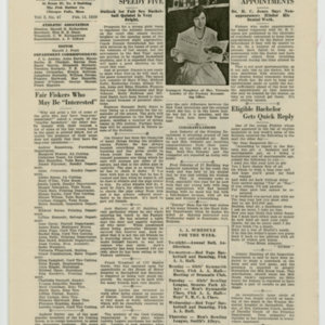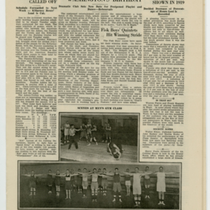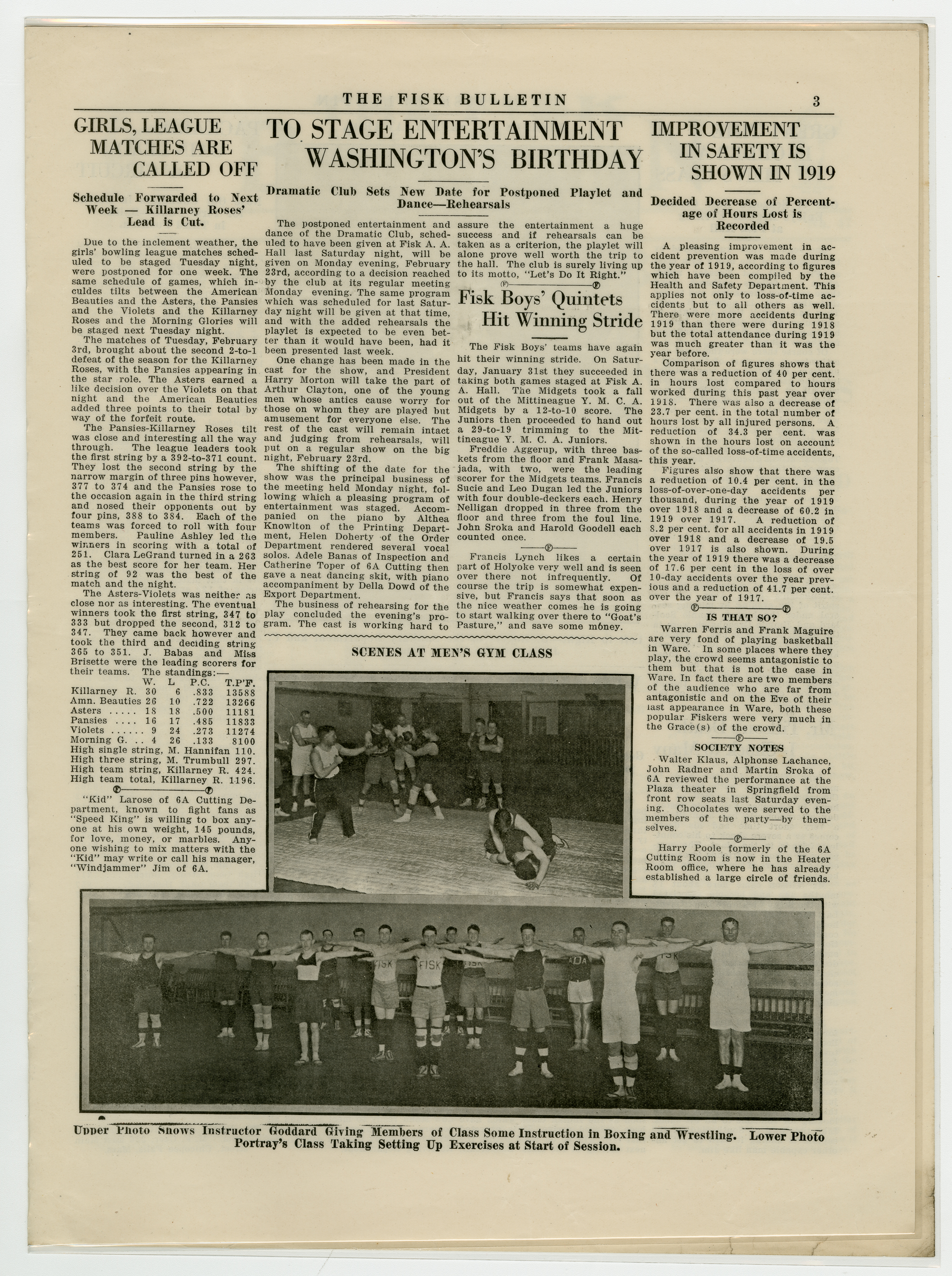 A four page newspaper describing the events related to the social groups and athletic clubs of the Fisk Tire Company for the week of February 13, 1920. The page one headline this week reminds Fisk employees the third annual dance is being held and a large crowd is expected. Also, the women's basketball team opens its season against Bosch this week and the Red Tops face Adams in a rematch of two top teams. On page two Dr. H.C. Jones, the Fisk Dentist, is asking Fiskers to keep their appointments. A photograph of Viola Landry of the Accounting Office anchors the page. Several employee notes also appear on page two. Photographs from the mens' gym class and a story on safety improvement in 1919 fill page three. Safety award winners for January, G. Rogers of the Sanitary Department and C. Jordan of the Power Department, are pictured on page four. Seven different stories on interfactory league play complete the coverage.