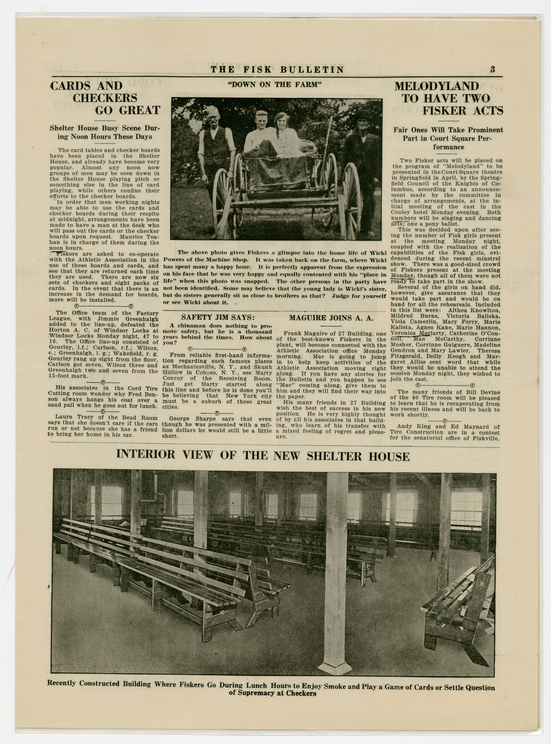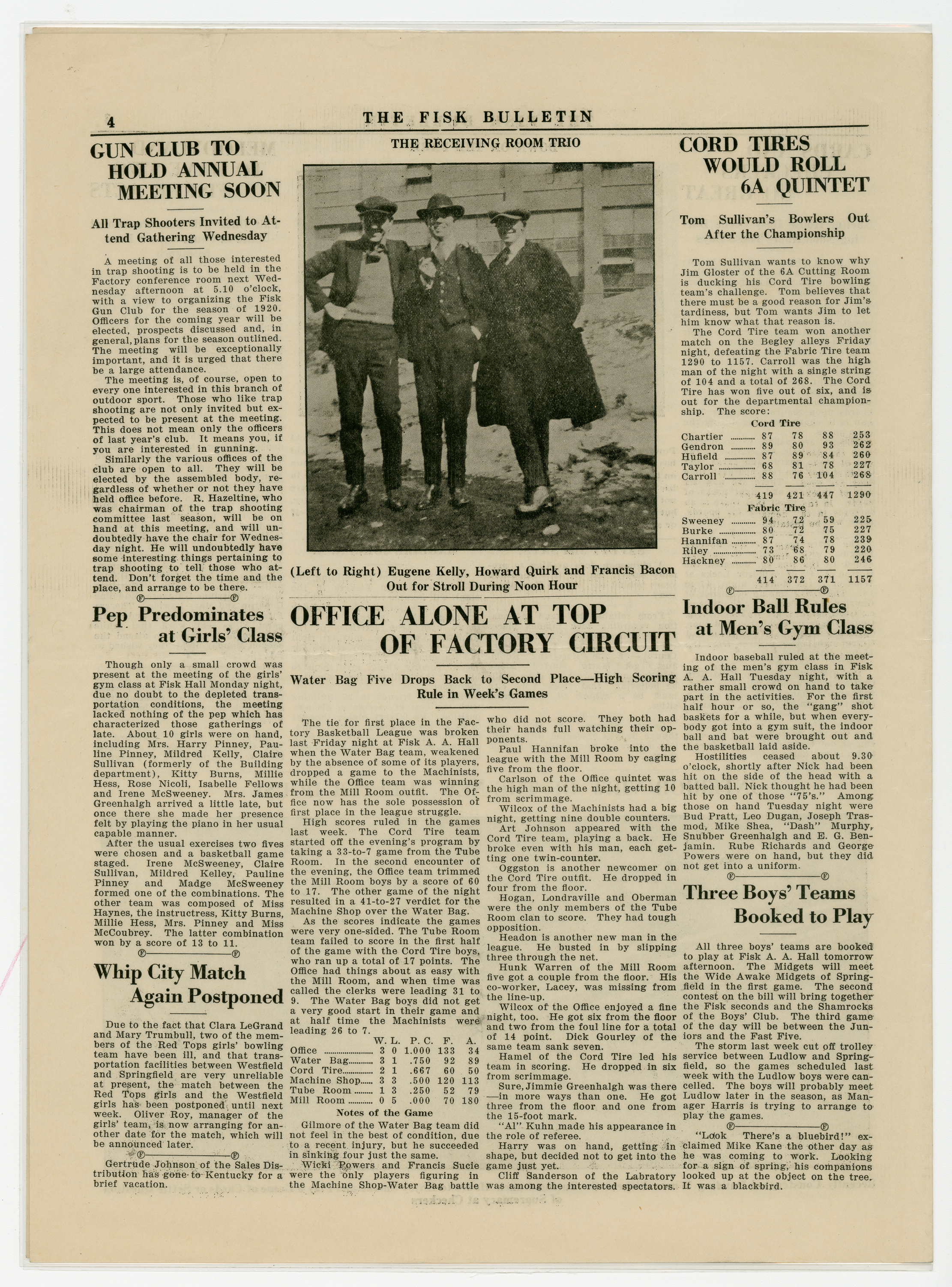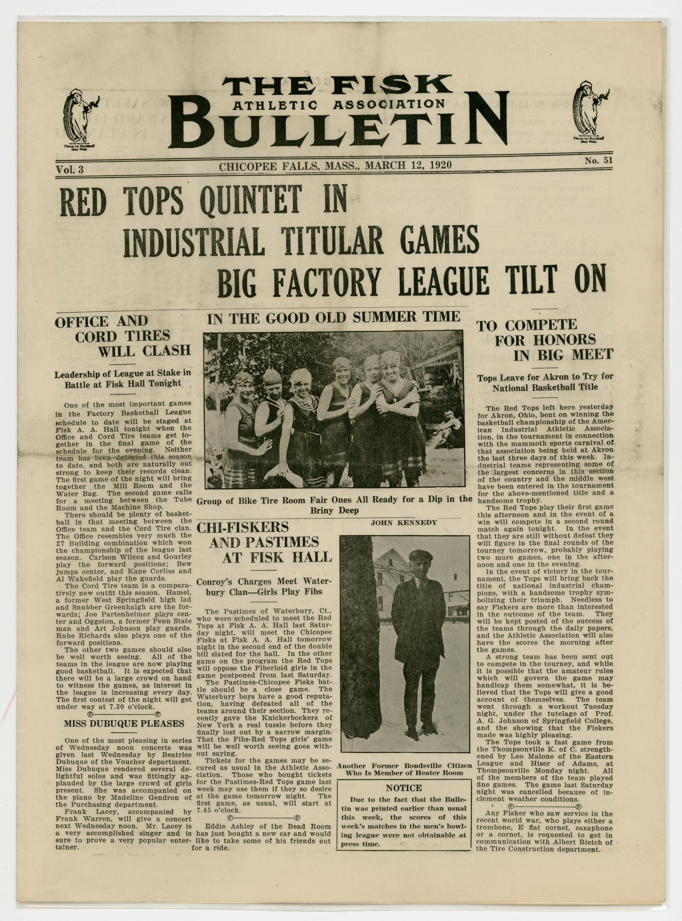 A four page newspaper describing the events related to the social groups and athletic clubs of the Fisk Tire Company for the week of March 12, 1920. The lead story on page one is the Red Tops Basketball team traveling to Akron, Ohio to play for the national industrial league championship. Also, interleague play between the Office and the Cord Tire basketball teams and a photograph of a group of women from the Bike Tire division fill out the coverage. Page two is a jumble of employee notes and various club announcements. Page three features a large photograph of the recently constructed Shelter House, to be used for lunch breaks and socializing. Page four stories are about the factory league teams and the gun club meeting.