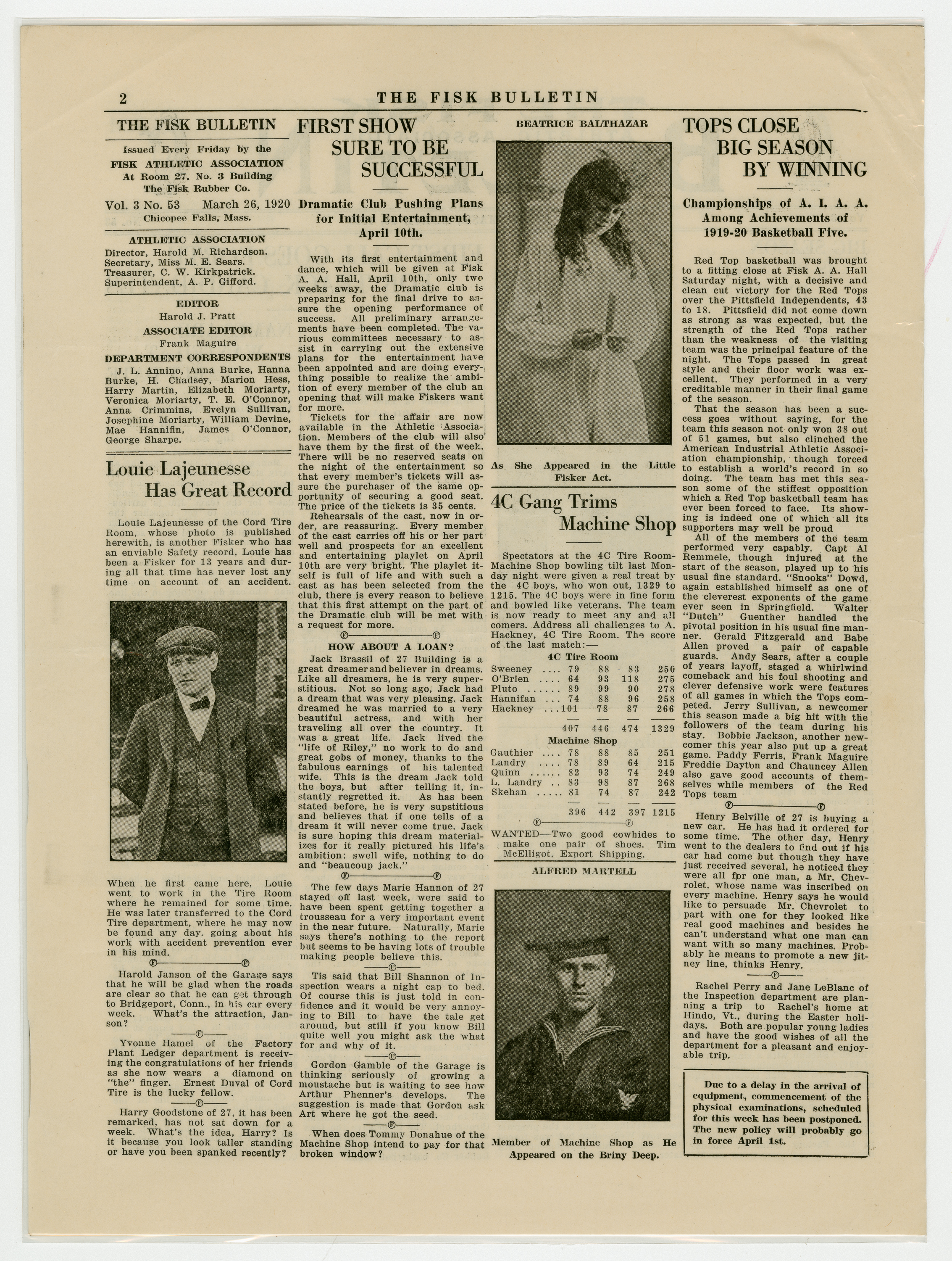 The Fisk Tire Company's Social and Athletic Association events and happenings for the week of March 26, 1920.