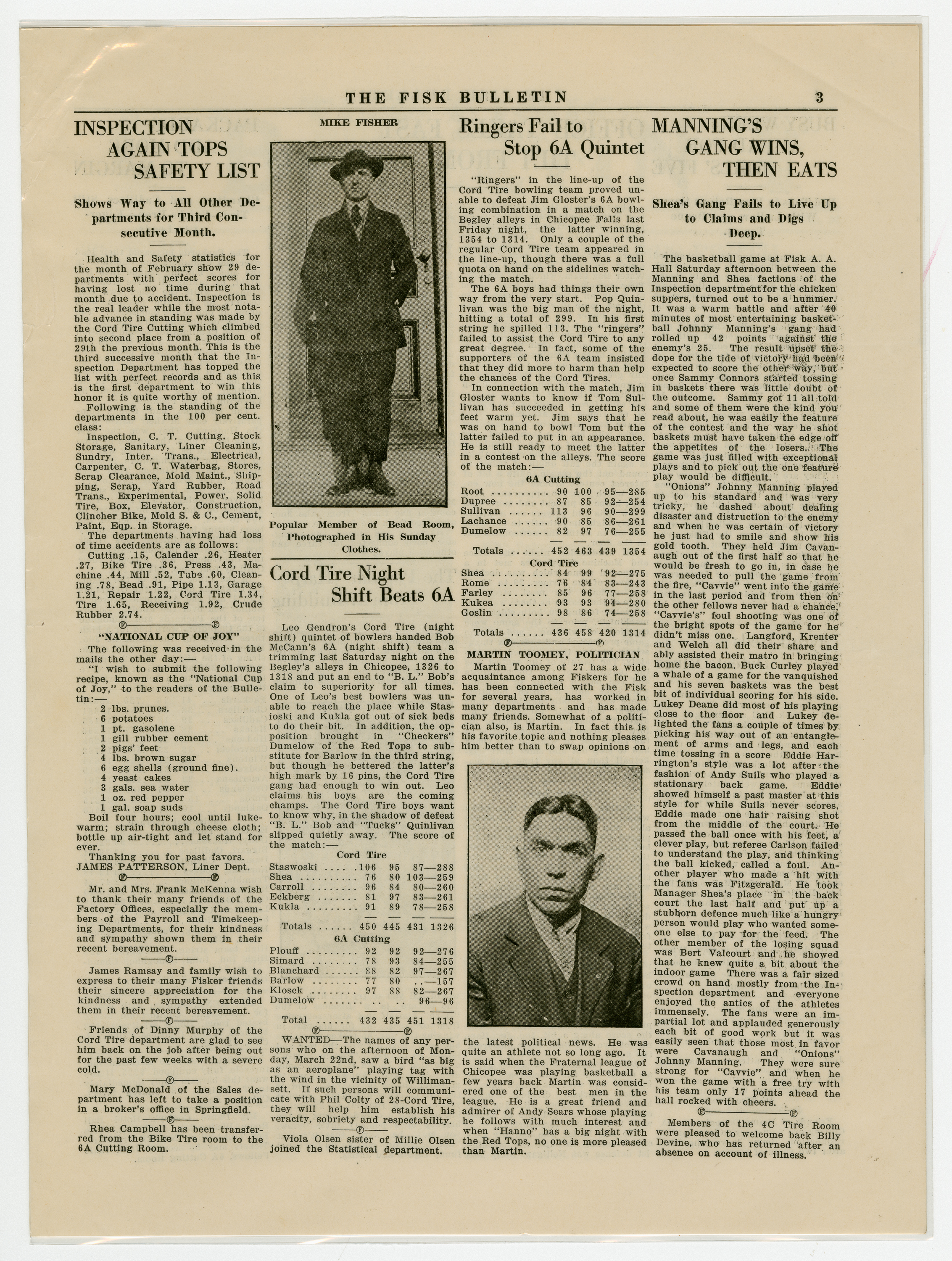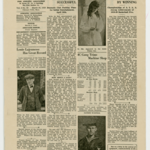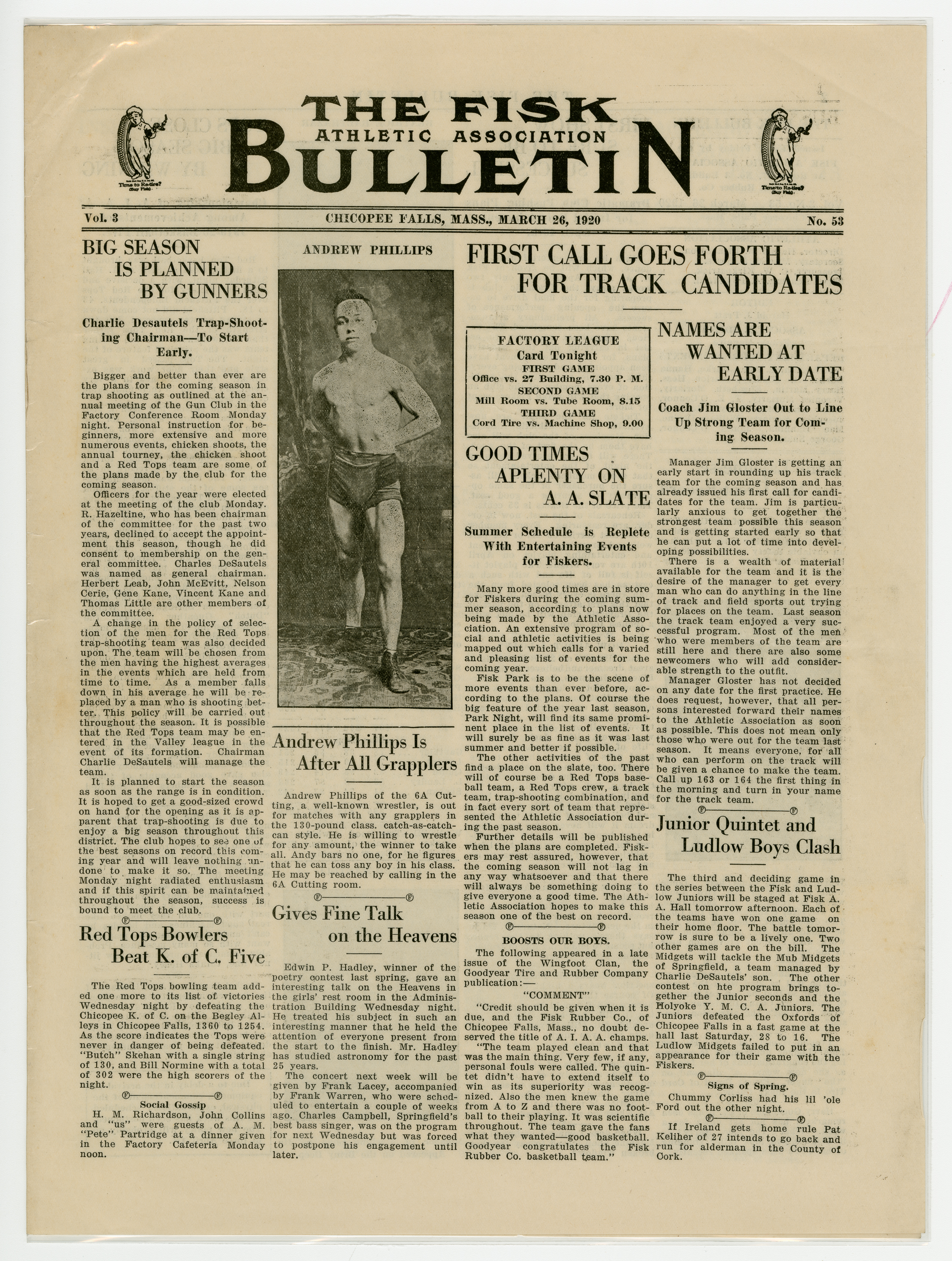 A four page newspaper describing the events related to the social groups and athletic clubs of the Fisk Tire Company for the week of March 26, 1920. Andrew Phillips, of the 6A Cutting Room, challenges all-comers in the 130 pound weight class to a wrestling match in a winner take all event. Story on page one of this week's edition of the Fisk Bulletin. Also, stories on the call for candidates to join the track team and the trap-shooting team gears up for the summer season. Page two features a preview of the drama club's performance, highlights from league play and employee notes. Page three covers bowling league play and a story on the inspection department leading all departments in the safety competition. Page four has continued coverage of competition in both the men's and women's inter-department leagues.