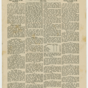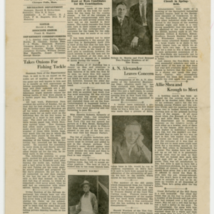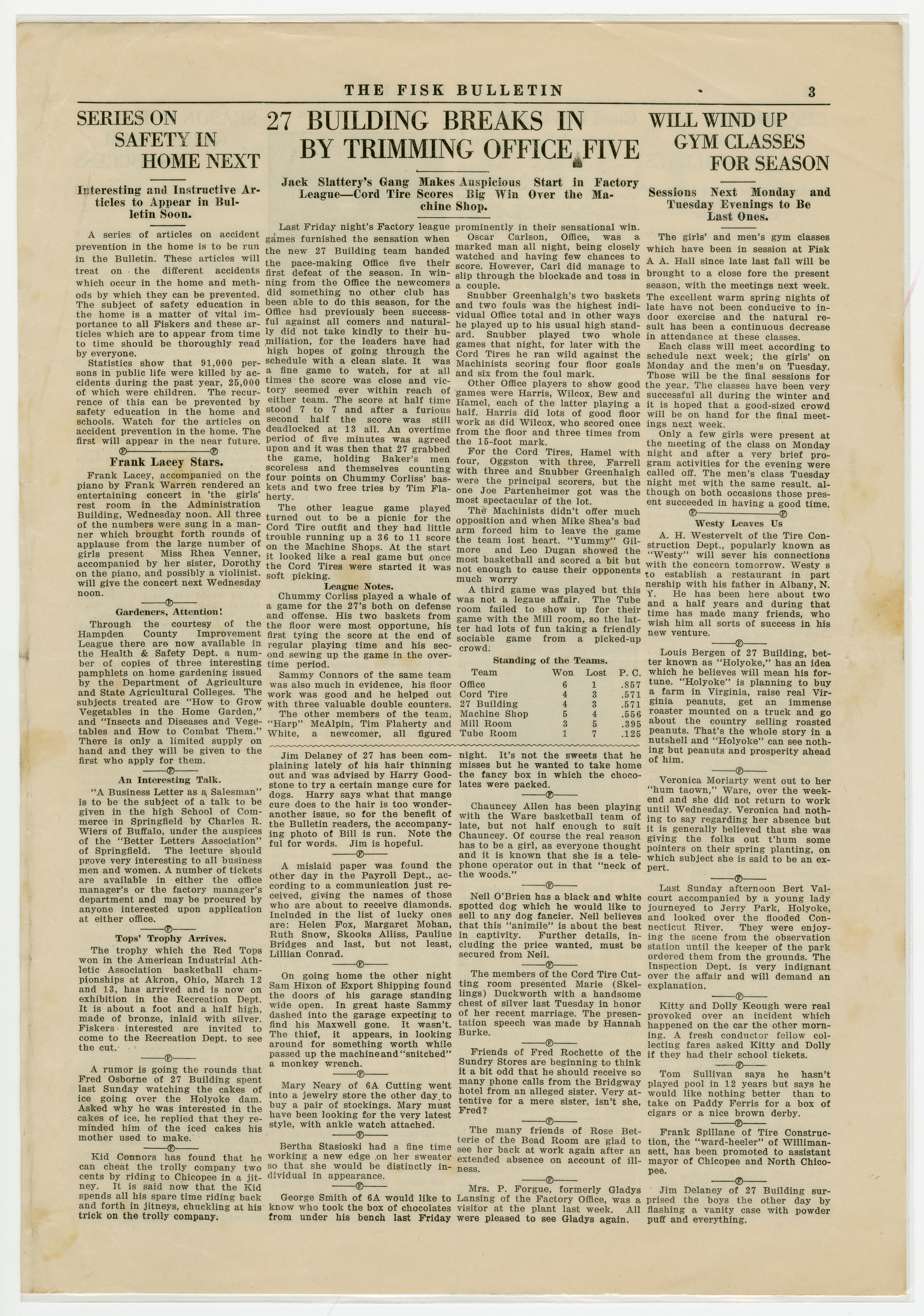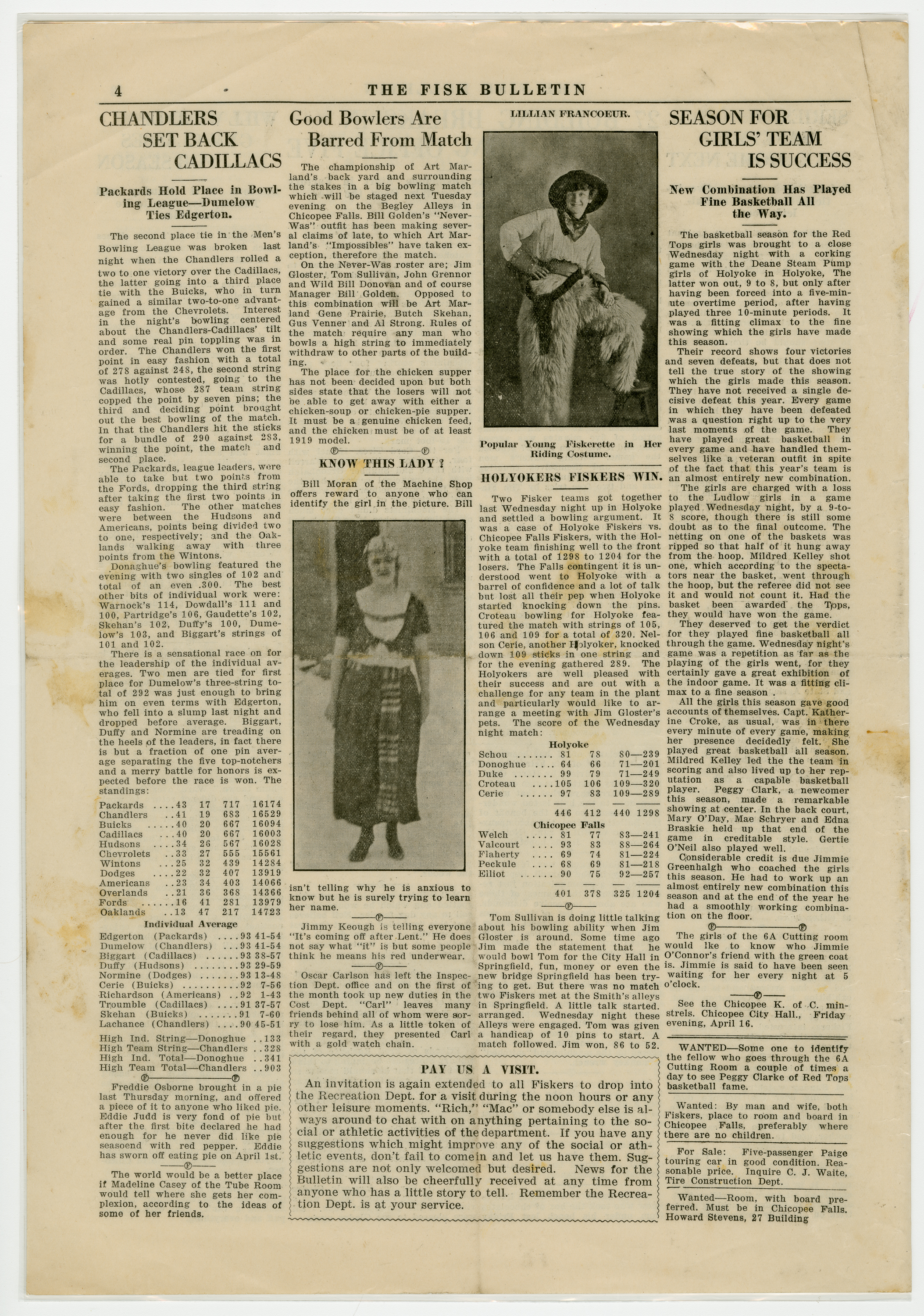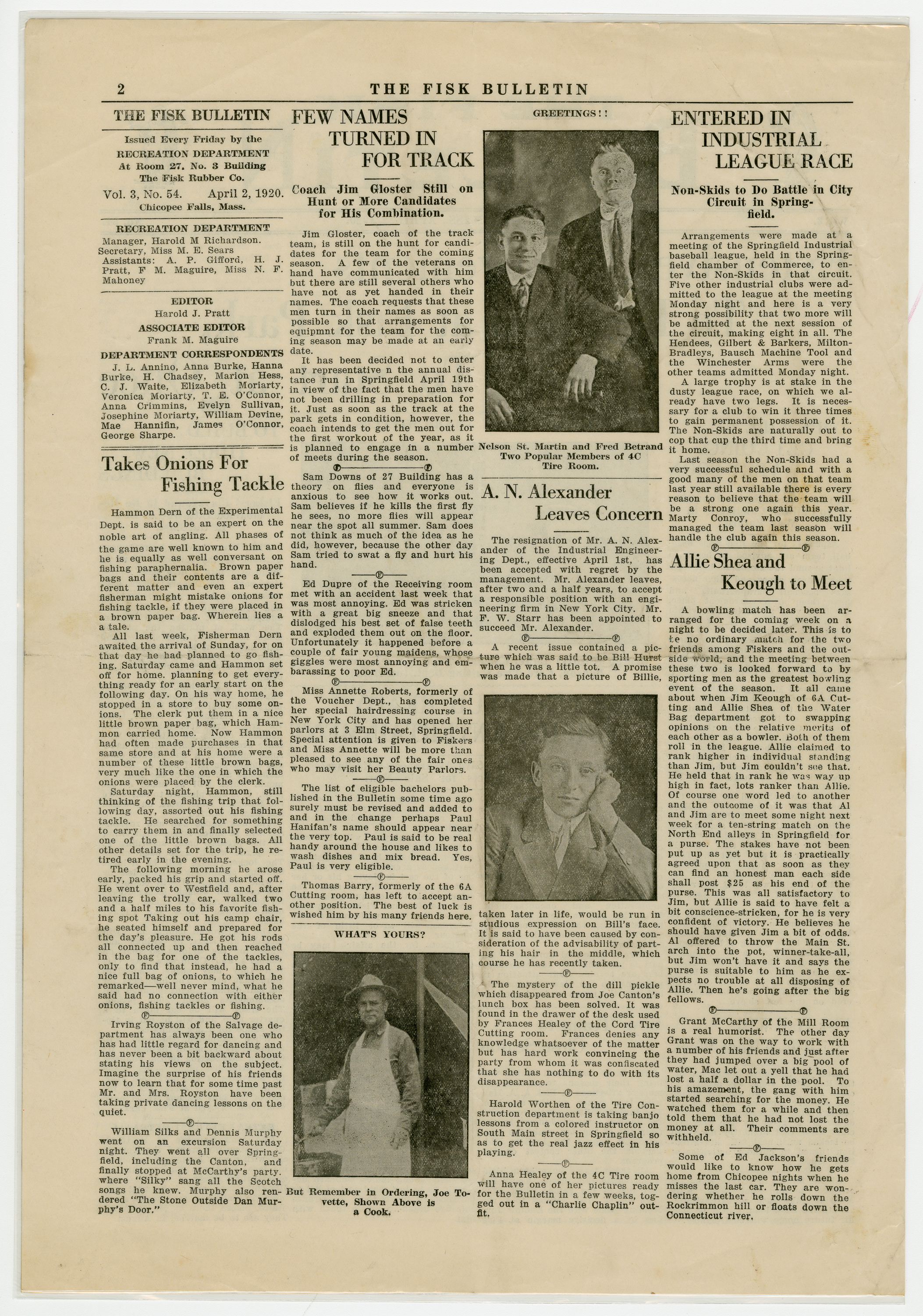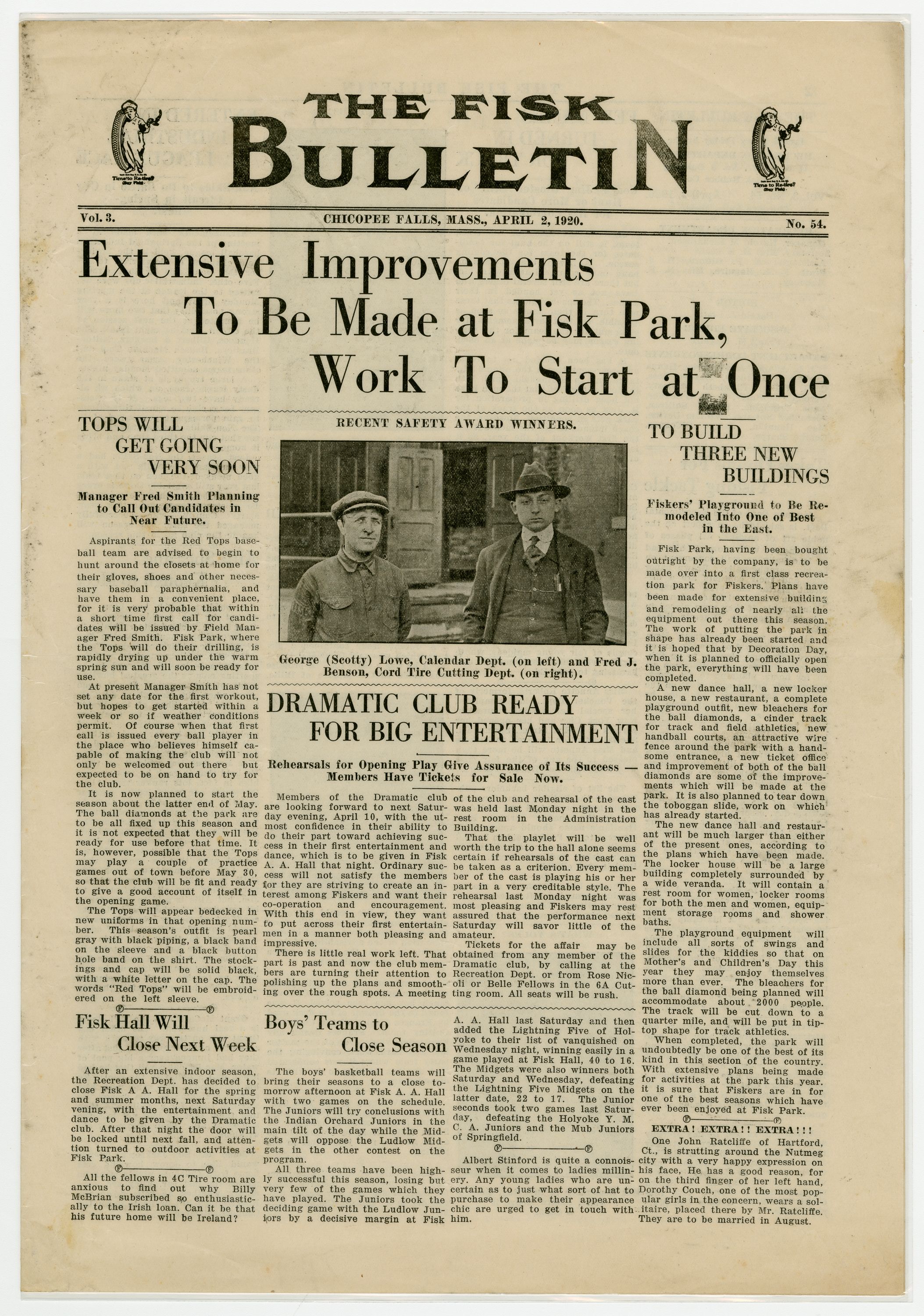 A four page newspaper describing the events related to the social groups and athletic clubs of the Fisk Tire Company for the week of April 2, 1920. The big story in this edition is the announcement of extensive renovations to be made to Fisk Park with three new buildings being added. Also, Fisk Hall will close for the season after the Drama Club's big show. And, baseball team tryouts will begin as soon as the weather permits. Page two stories include a fishing trip gone awry, many employee notes and a call for more Fiskers to try out for the track team. Page three brings the week's interfactory basketball league games to life. A healthy sampling of employee notes rounds out the page. The Fisk bowling league matches highlight page four with a photograph of Lillian Francouer in her riding costume providing some art.