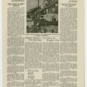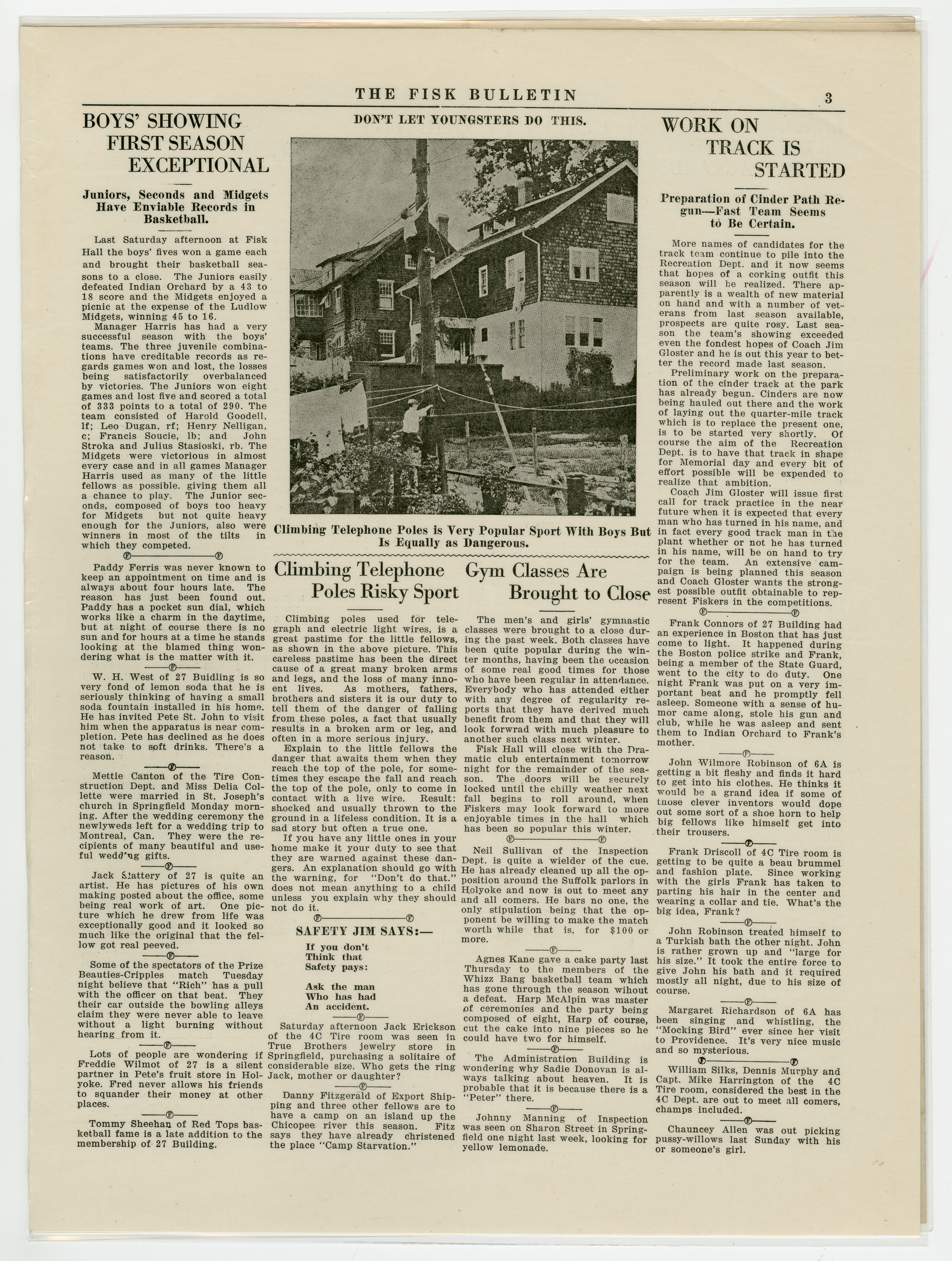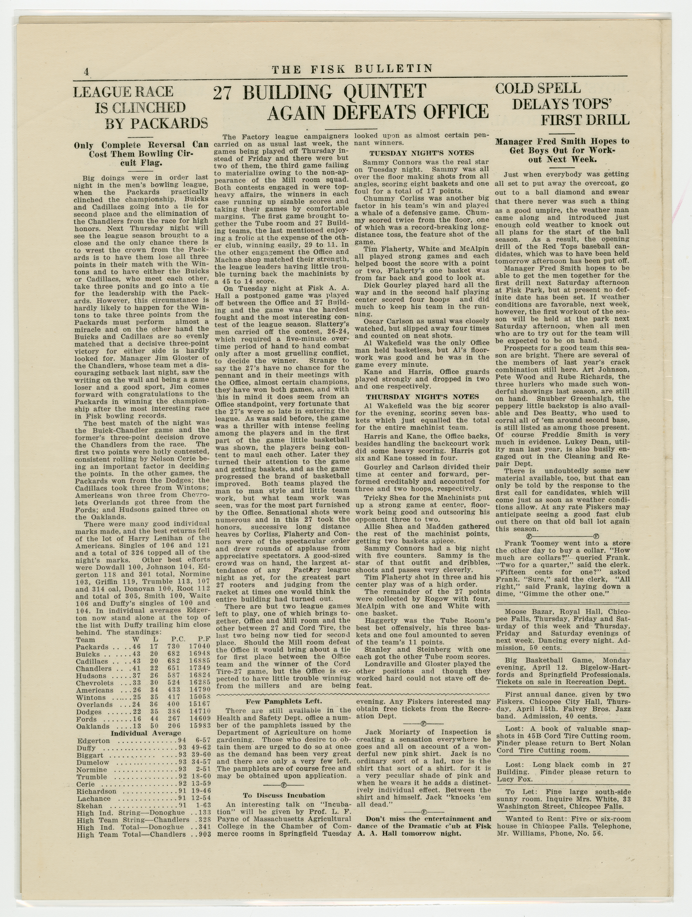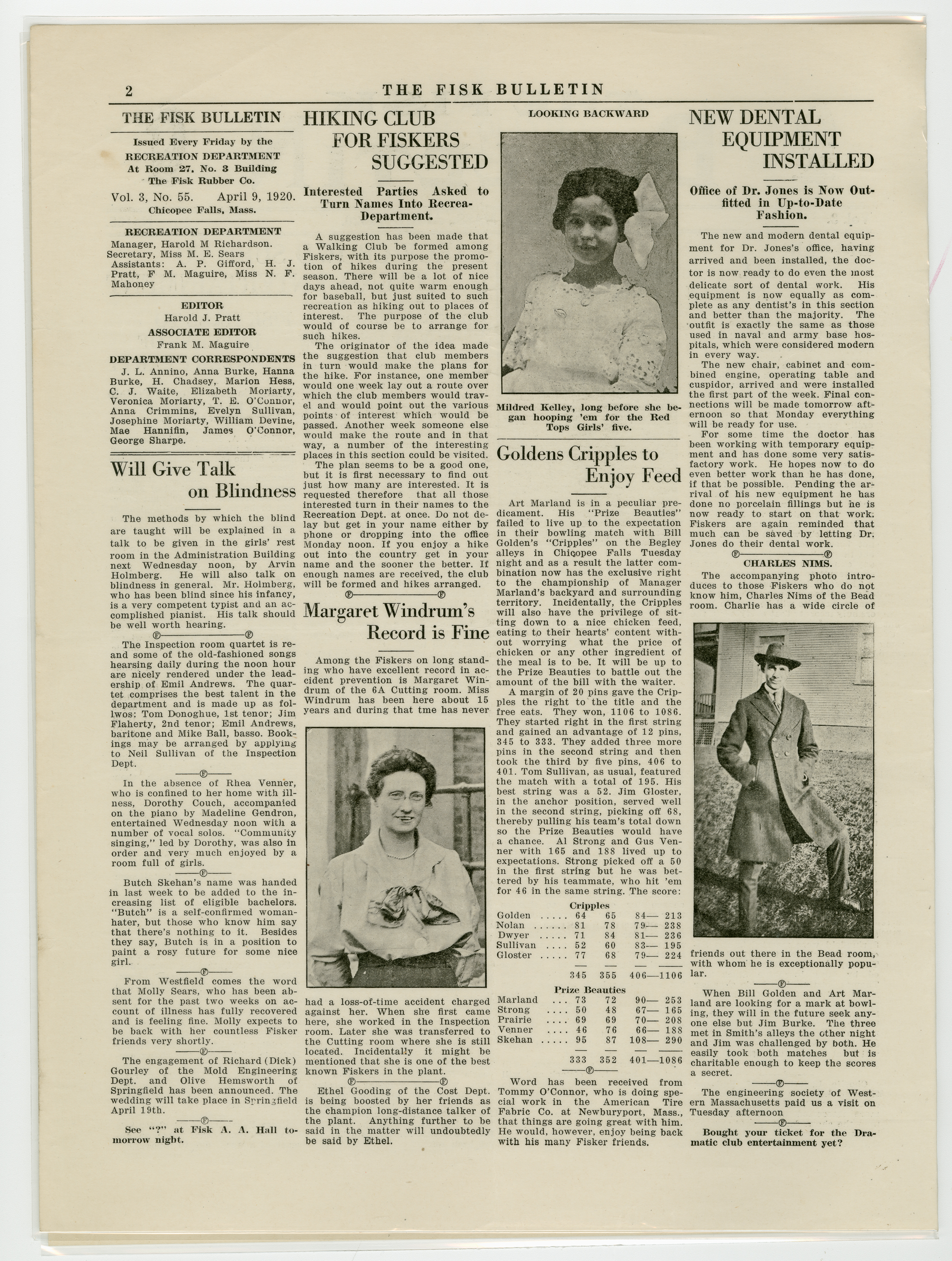 A four page newspaper describing the events related to the social groups and athletic clubs of the Fisk Tire Company for the week of April 9, 1920. "Large Crowd Sure To Attend Entertainment," "Ball Diamonds Being Fixed Up" and "Big Fair In Fall Is Plan" are the page one headlines. "New Dental Equipment Installed" and "Hiking Club For Fiskers Suggested" are the top page two headlines. Page three warns "Climbing Telephone Poles Risky Sport" and "Gym Classes Are Brought to Close." Page four headlines read "27 Building Quintet Again Defeats Office," "Cold Spell Delays Tops First Drill" and "League Race Is Clinched By Packards."